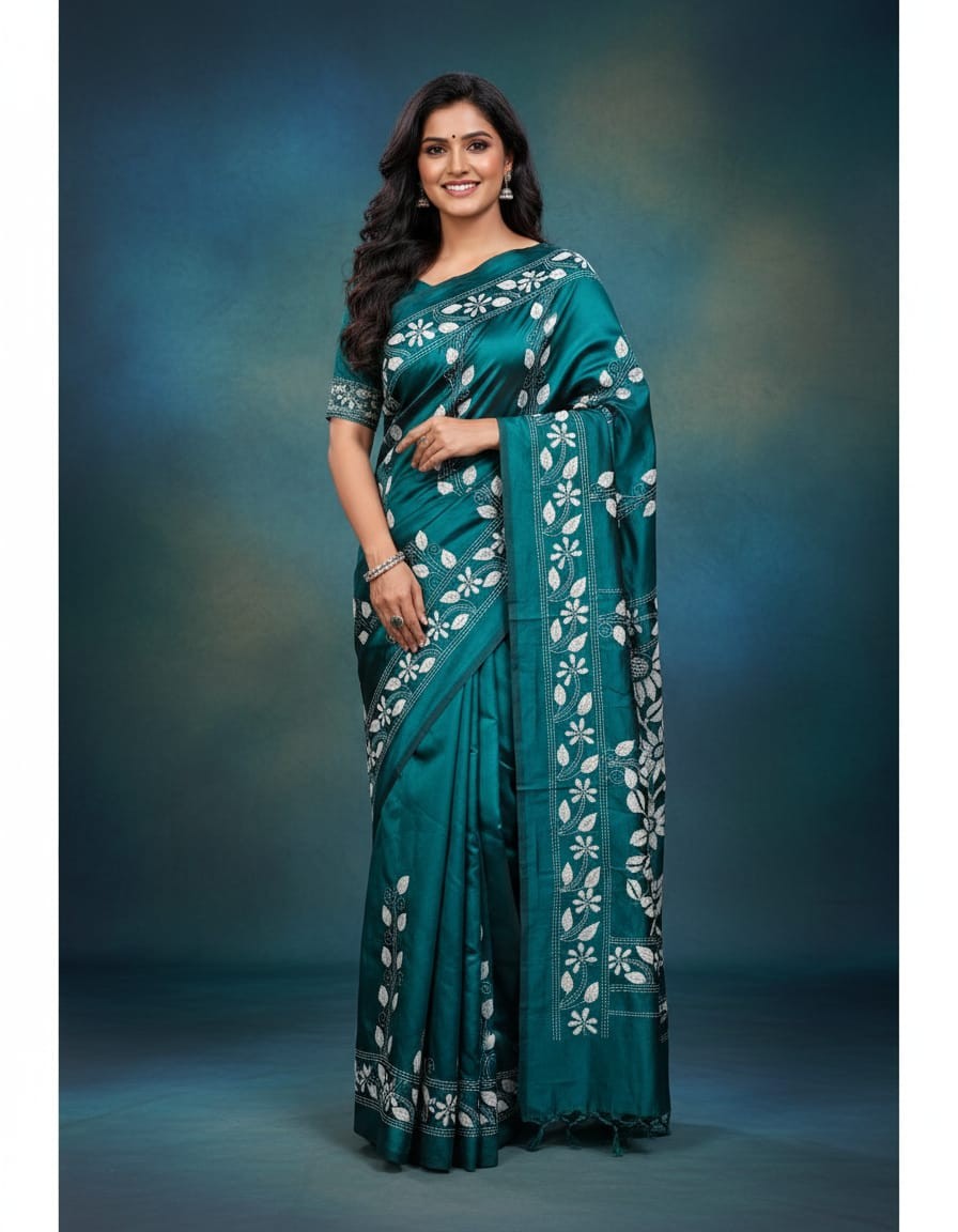 Bangalore pure silk Kantha Saree - Dark Teal Green