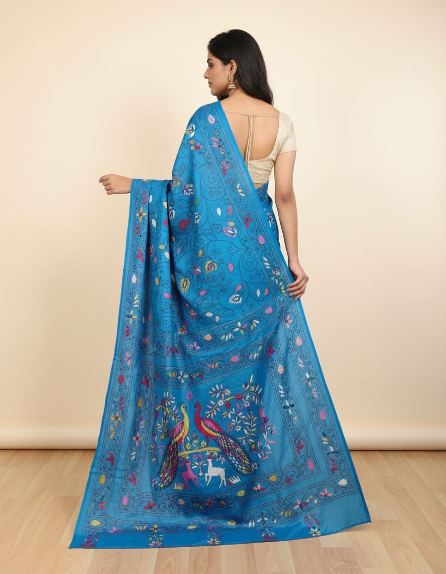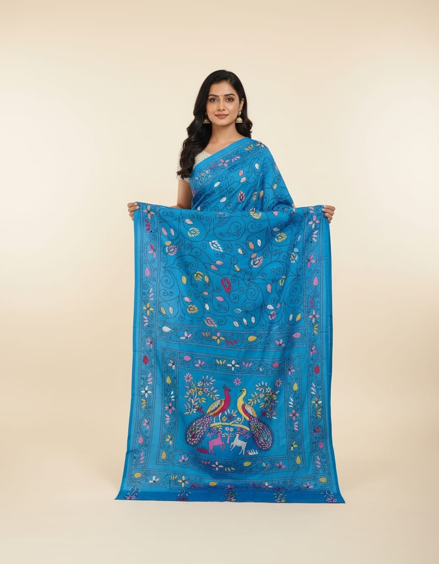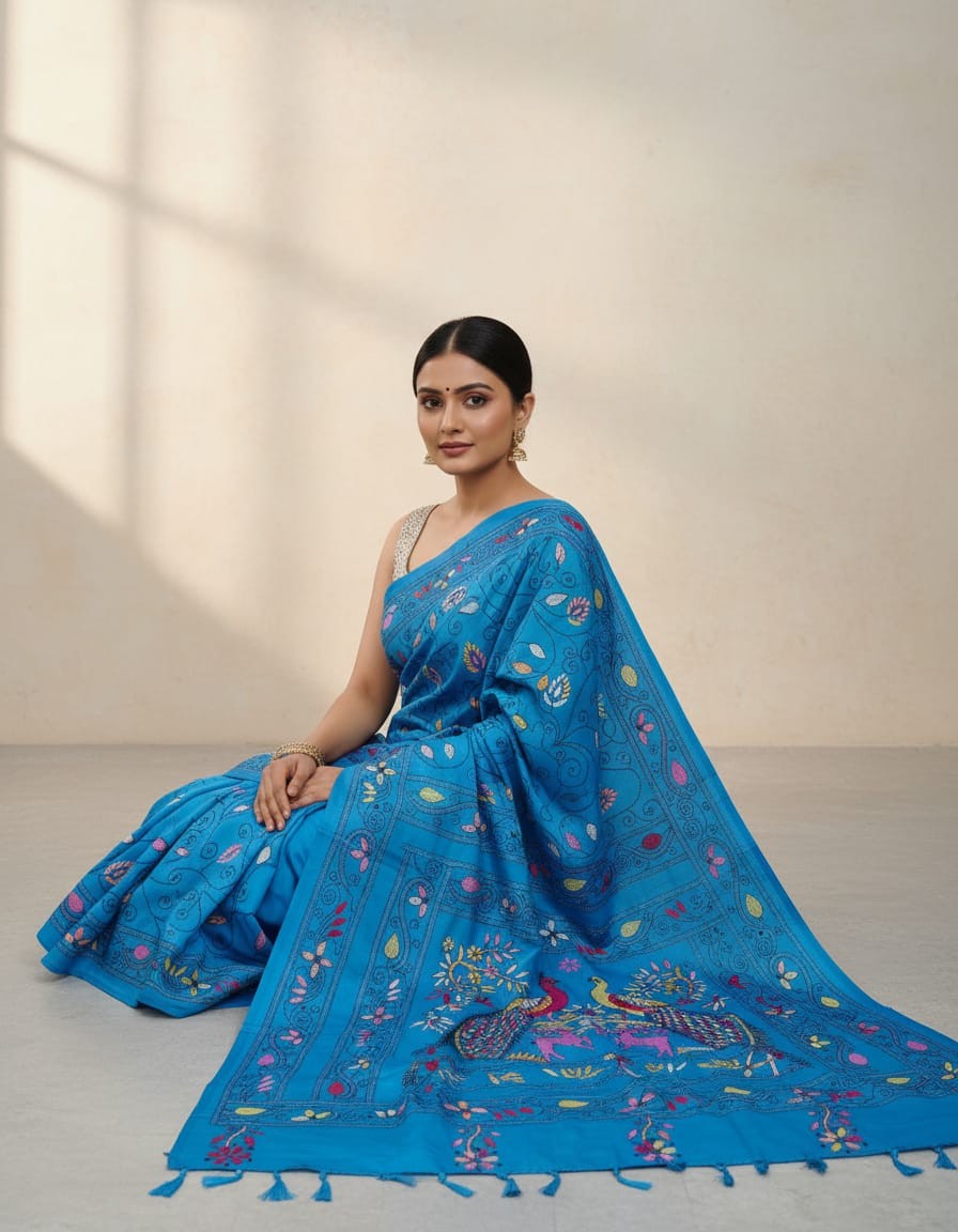 Celebrate timeless craftsmanship with this exquisite Kantha saree, a traditional form of folk embroidery from West Bengal, India. Each saree is a piece of wearable art, hand-stitched using a running stitch technique that has been passed down for generations.