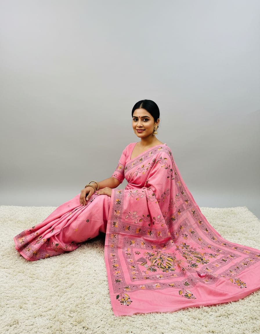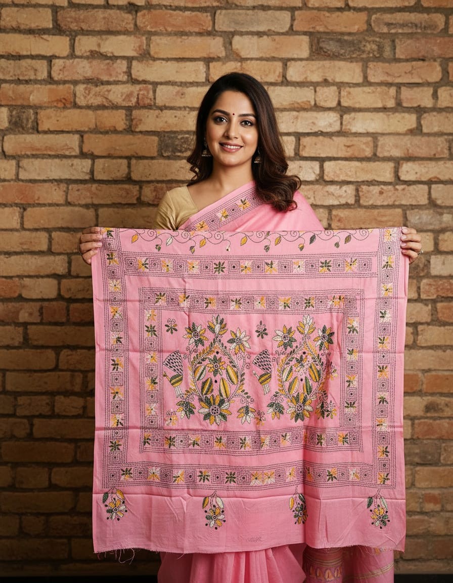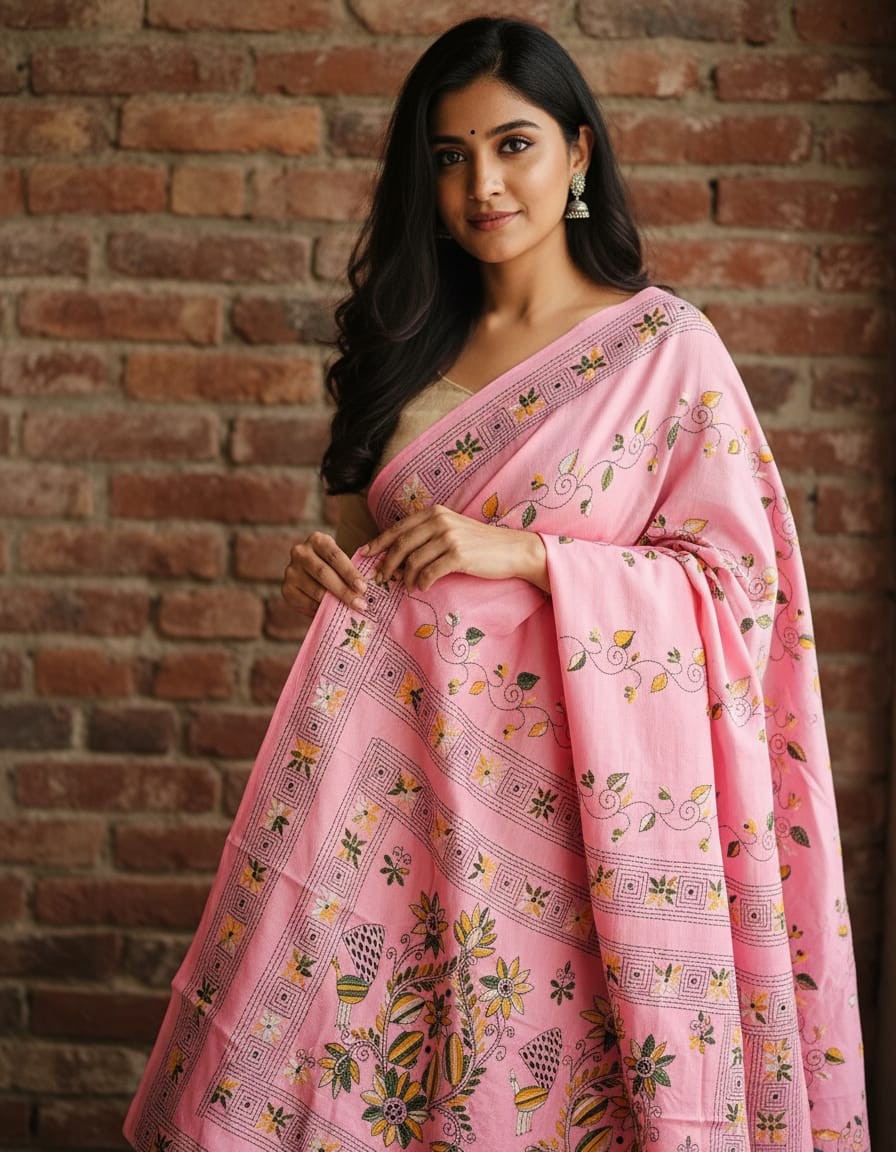 Celebrate timeless craftsmanship with this exquisite Kantha saree, a traditional form of folk embroidery from West Bengal, India. Each saree is a piece of wearable art, hand-stitched using a running stitch technique that has been passed down for generations.