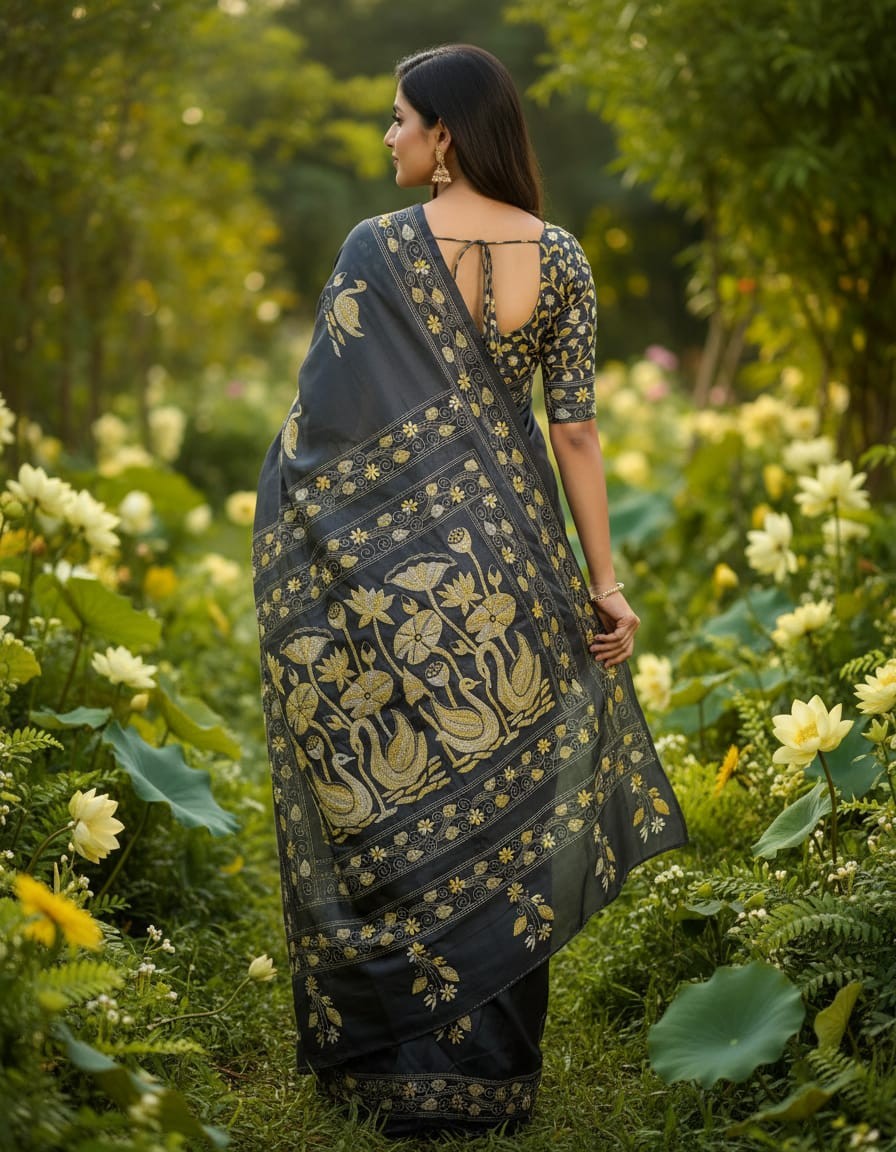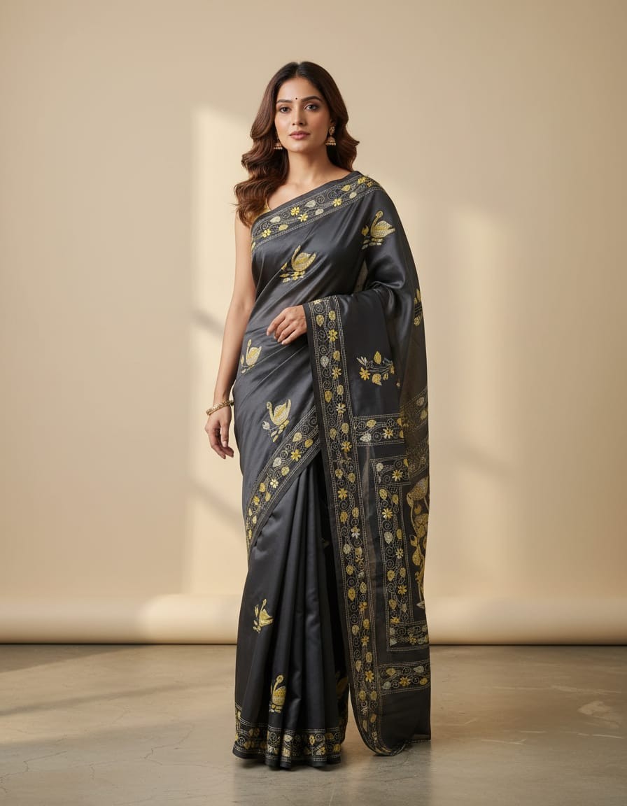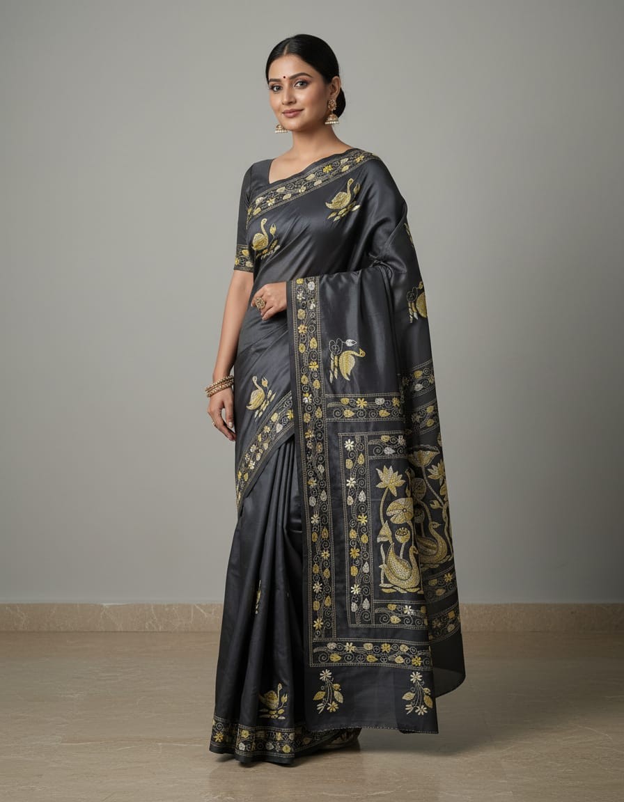 Celebrate timeless craftsmanship with this exquisite Kantha saree, a traditional form of folk embroidery from West Bengal, India. Each saree is a piece of wearable art, hand-stitched using a running stitch technique that has been passed down for generations.