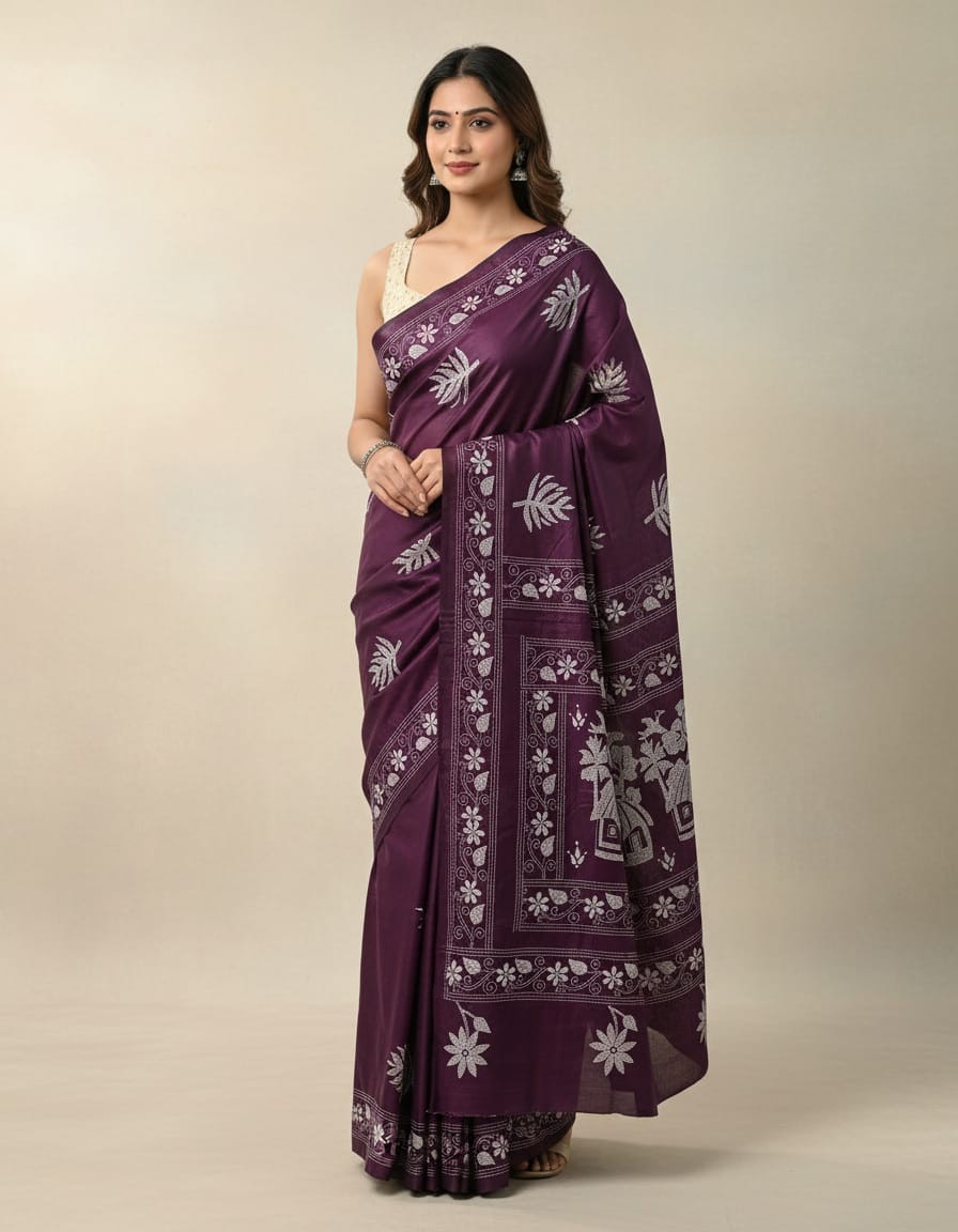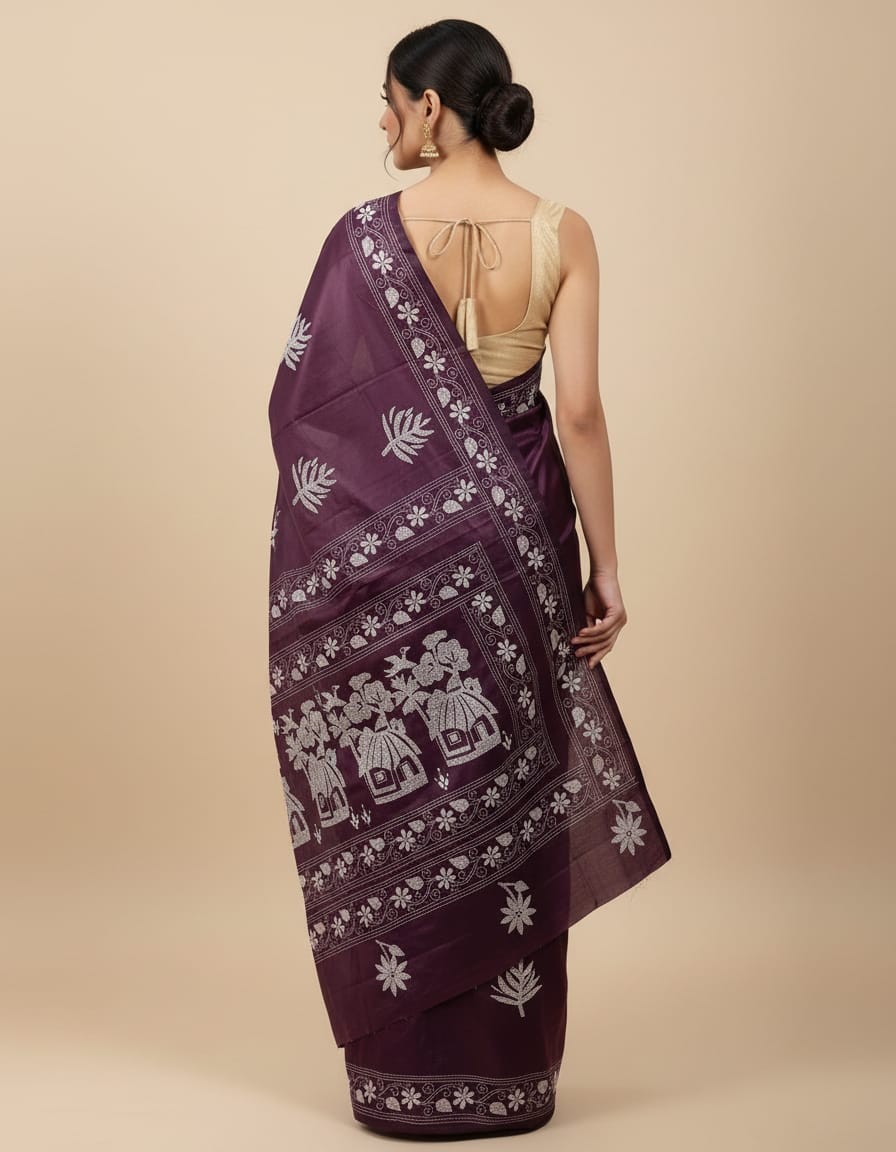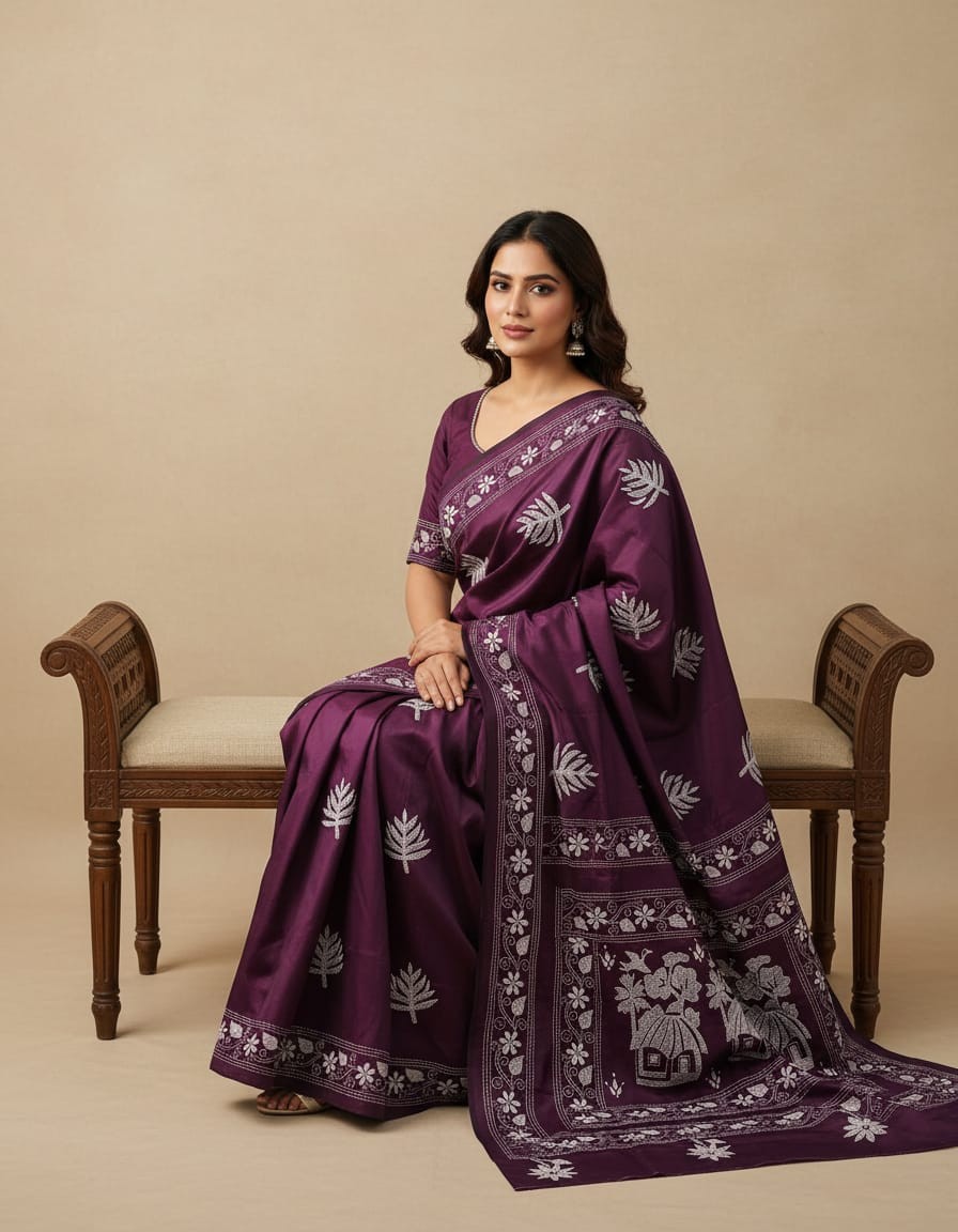 Celebrate timeless craftsmanship with this exquisite Kantha saree, a traditional form of folk embroidery from West Bengal, India. Each saree is a piece of wearable art, hand-stitched using a running stitch technique that has been passed down for generations.