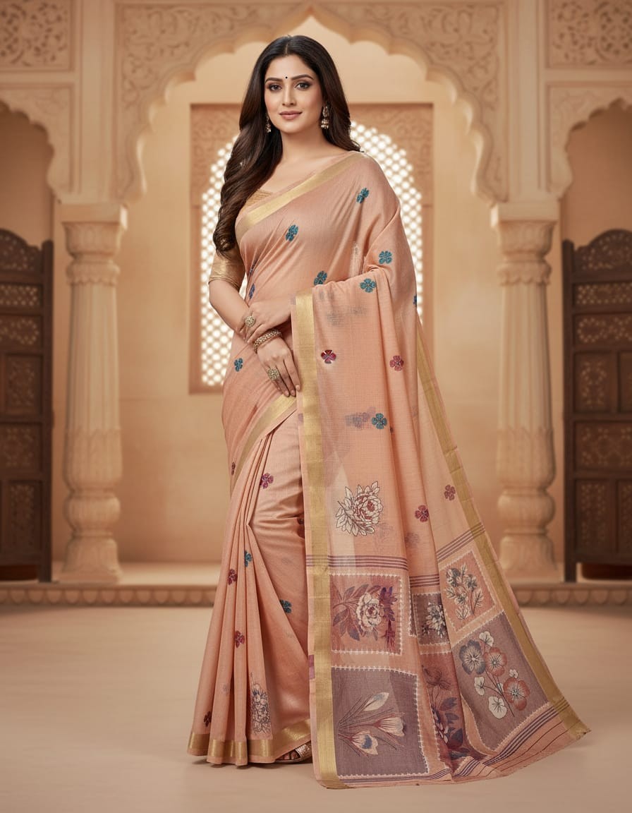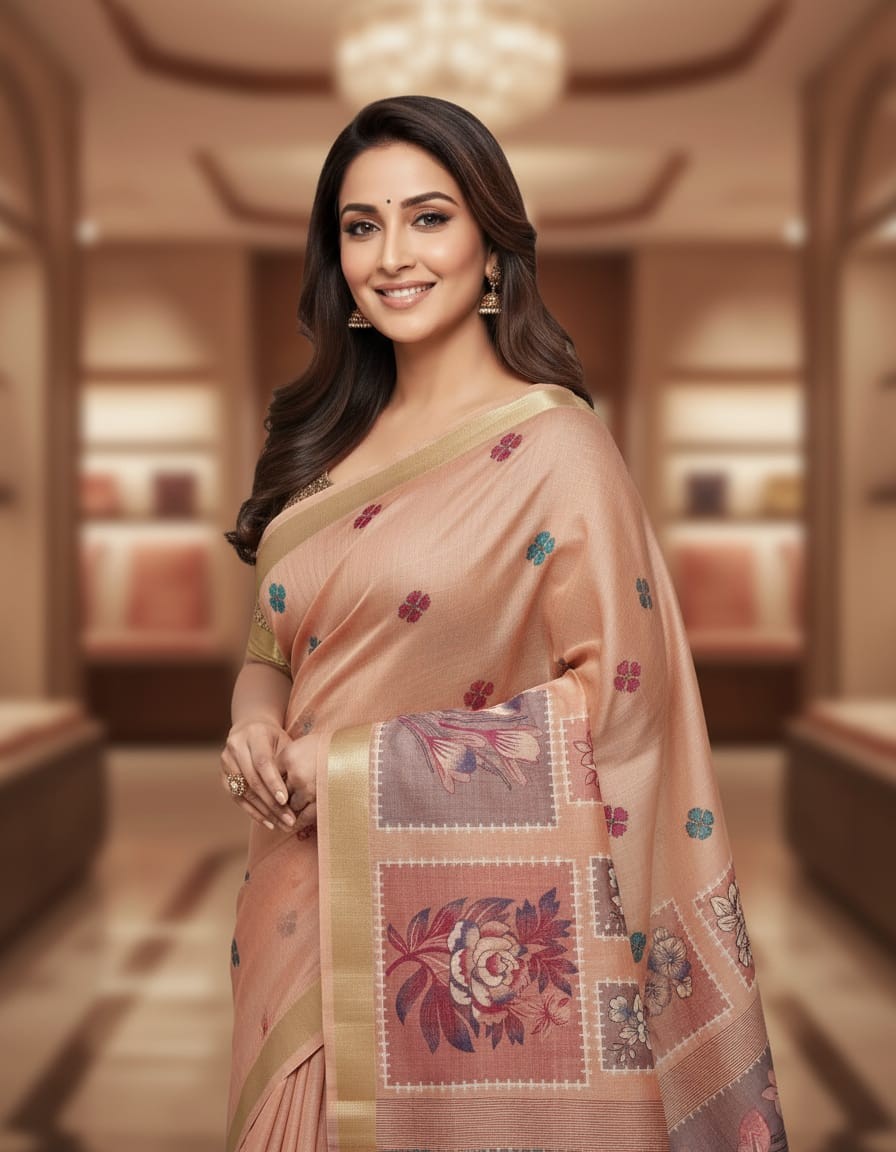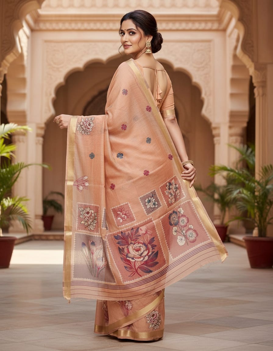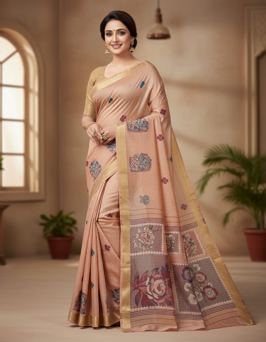 Floral Art Muga Jamdani Saree - Light Peach with Floral Design