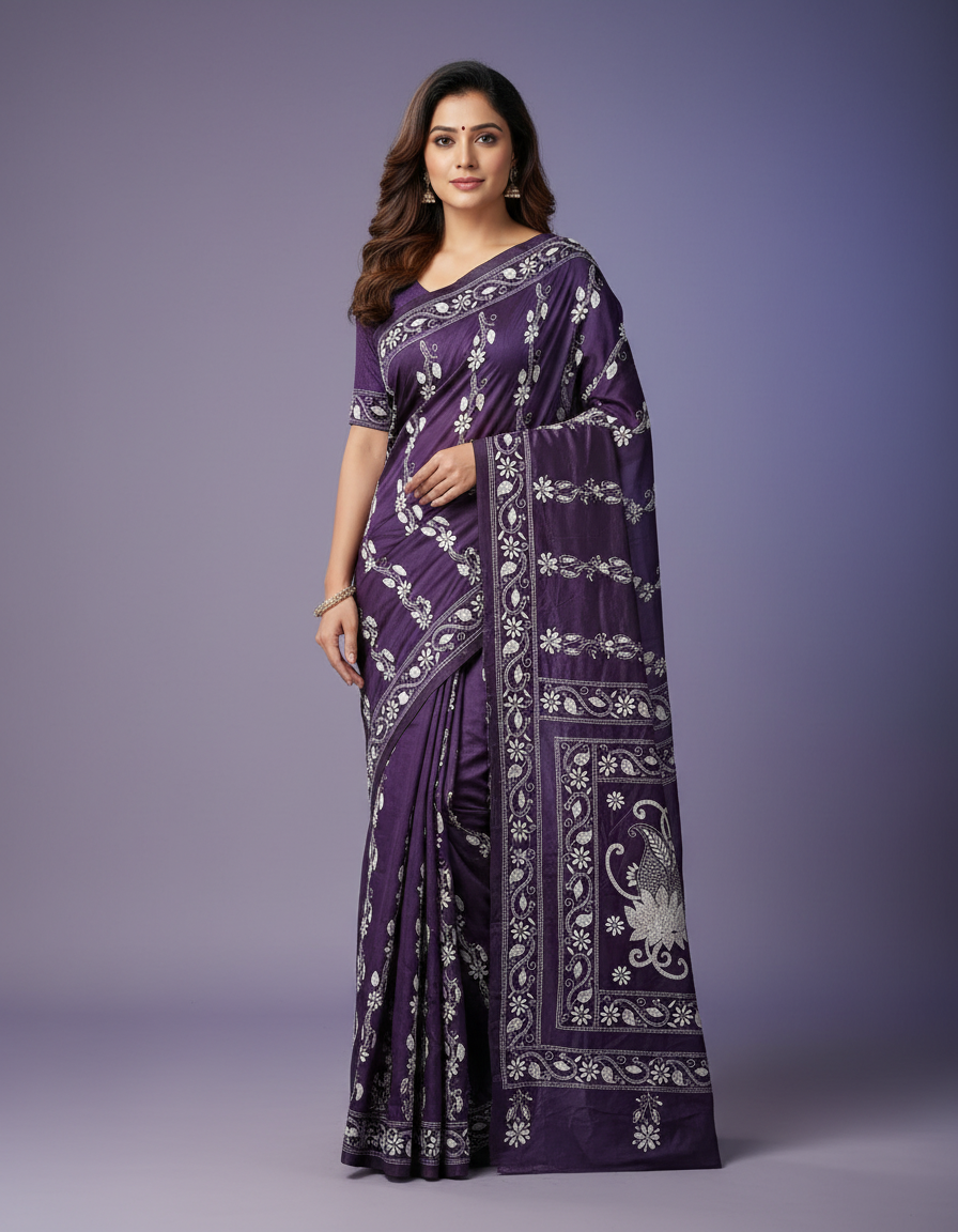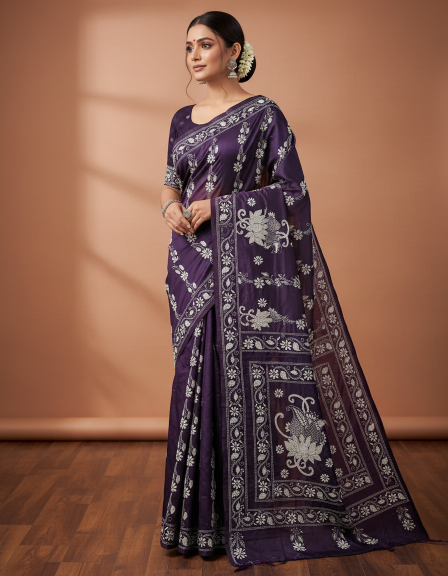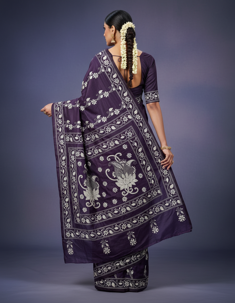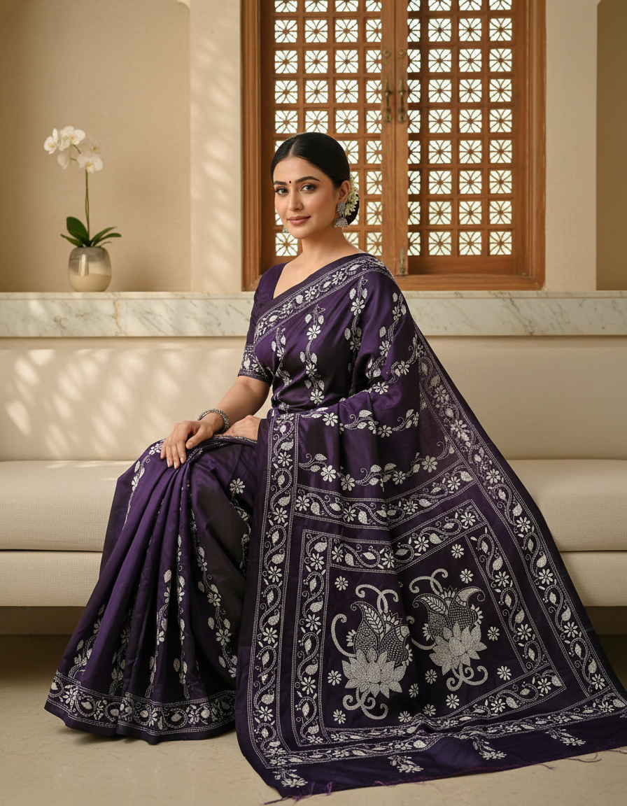 Celebrate timeless craftsmanship with this exquisite Kantha saree, a traditional form of folk embroidery from West Bengal, India. Each saree is a piece of wearable art, hand-stitched using a running stitch technique that has been passed down for generations.