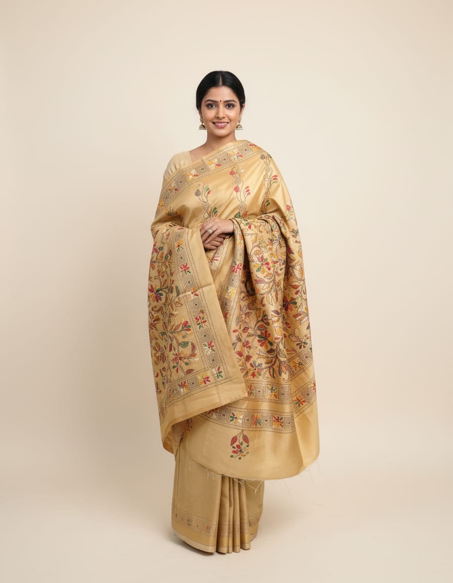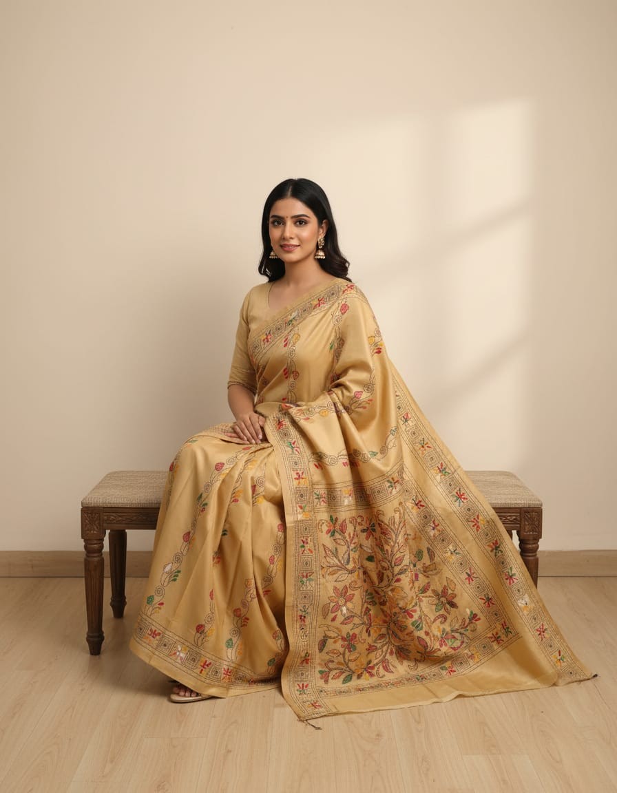 Celebrate timeless craftsmanship with this exquisite Kantha saree, a traditional form of folk embroidery from West Bengal, India. Each saree is a piece of wearable art, hand-stitched using a running stitch technique that has been passed down for generations.