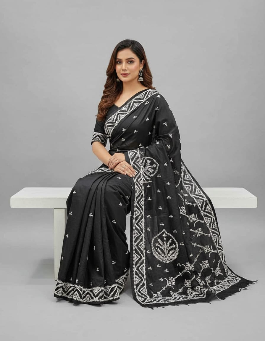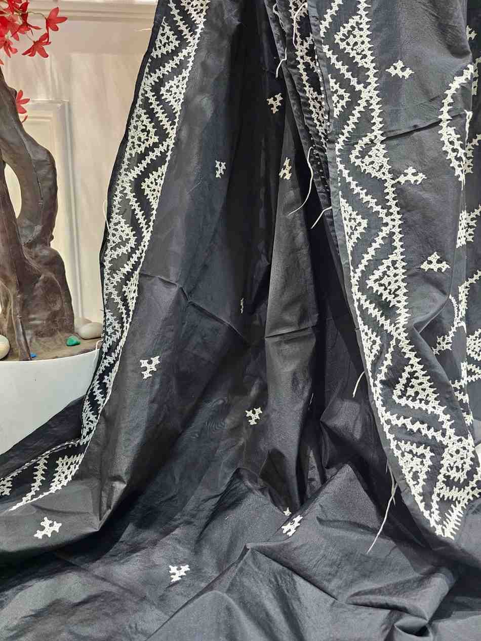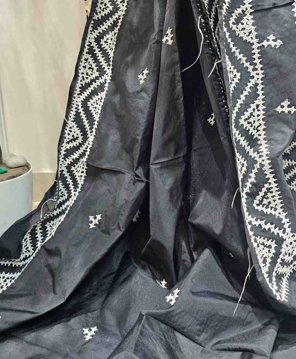 Experience timeless elegance with the Bangalore Silk Kantha Saree - Deep Black. The rich deep black base of this saree sets the stage for exquisite Kantha embroidery, creating a dramatic yet refined effect. The delicate hand-stitched Kantha motifs, often in contrasting threads, bring texture and a unique depth to the fabric, enhancing its luxurious feel. This saree is perfect for evening events, weddings, or festive occasions, where you want to make a bold yet elegant statement. The classic black hue paired with the intricate craftsmanship ensures you stand out in the most sophisticated way.