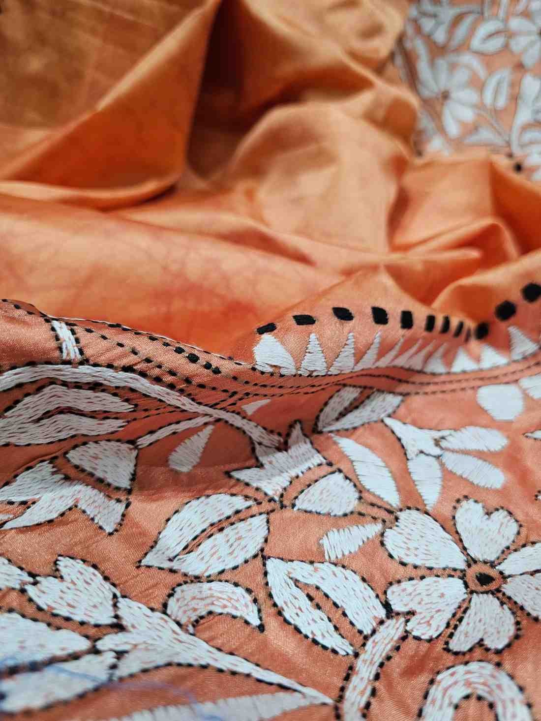Delicate and graceful, our Peach Bangalore Silk Blend Kantha Saree radiates timeless beauty. Made from a soft silk blend, this saree features intricate Kantha embroidery, adding a layer of artistic finesse to the gentle peach tone. Perfect for daytime events, bridal showers, or festive celebrations, its light and airy fabric ensures comfort while exuding a soft elegance. The peach hue brings warmth and femininity, making this saree an ideal choice for a refined, yet radiant look.