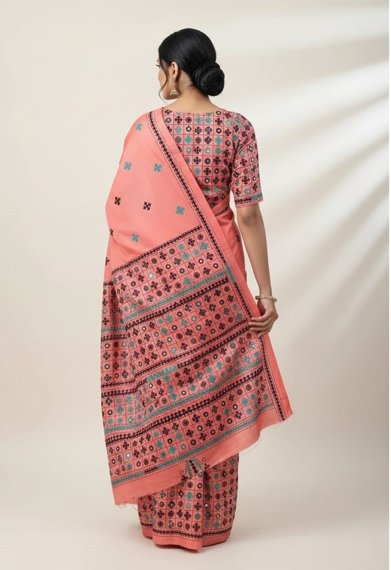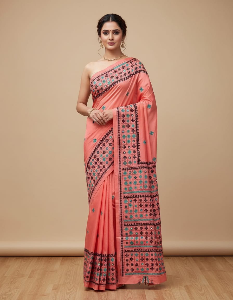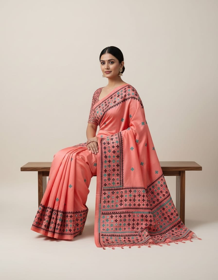 Celebrate timeless craftsmanship with this exquisite Kantha saree, a traditional form of folk embroidery from West Bengal, India. Each saree is a piece of wearable art, hand-stitched using a running stitch technique that has been passed down for generations.