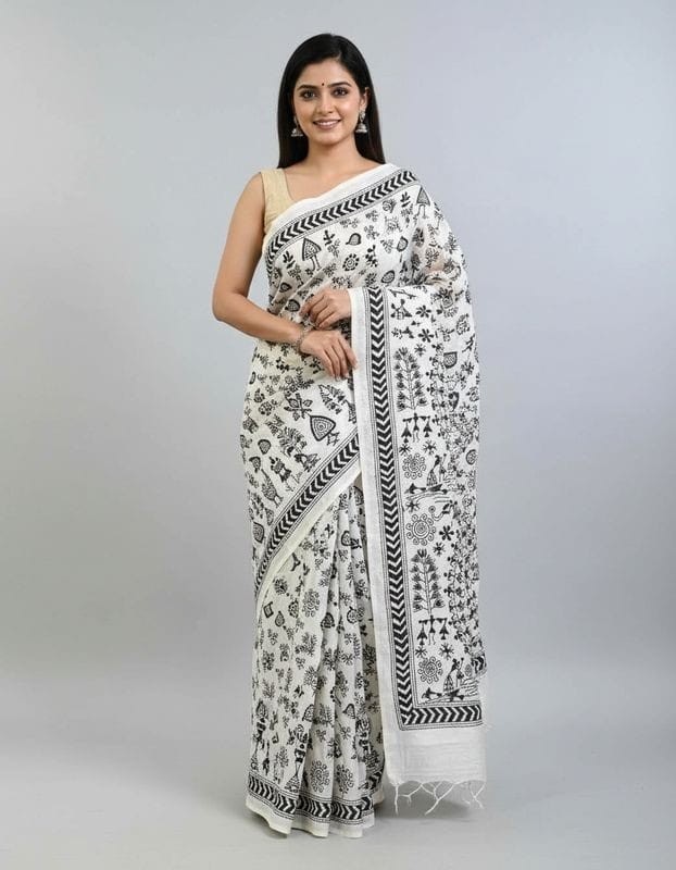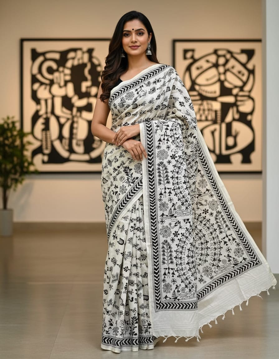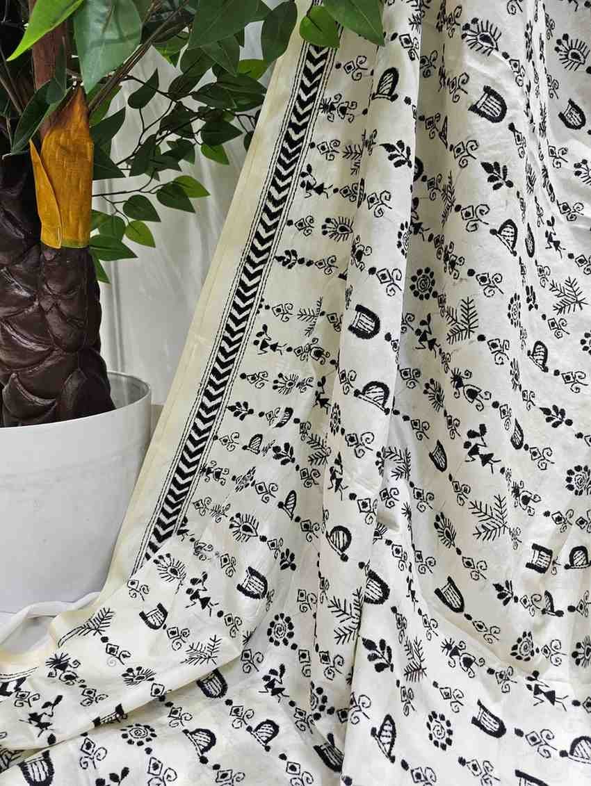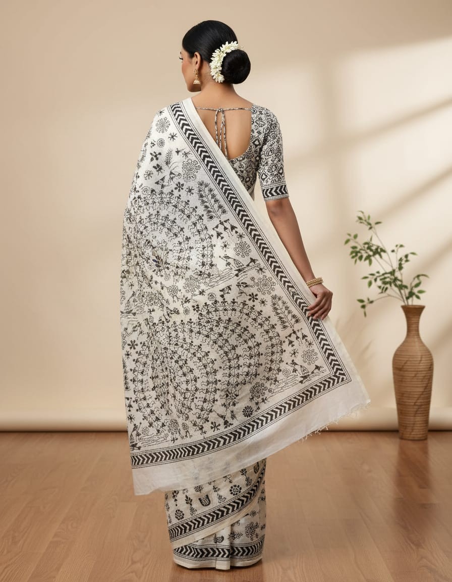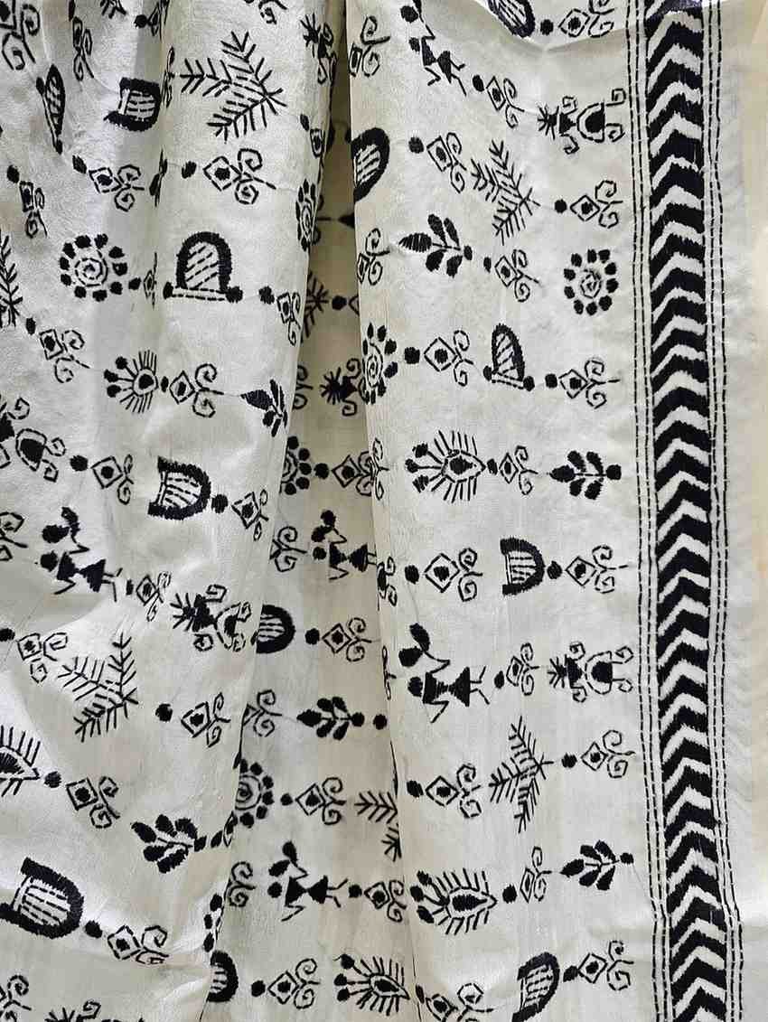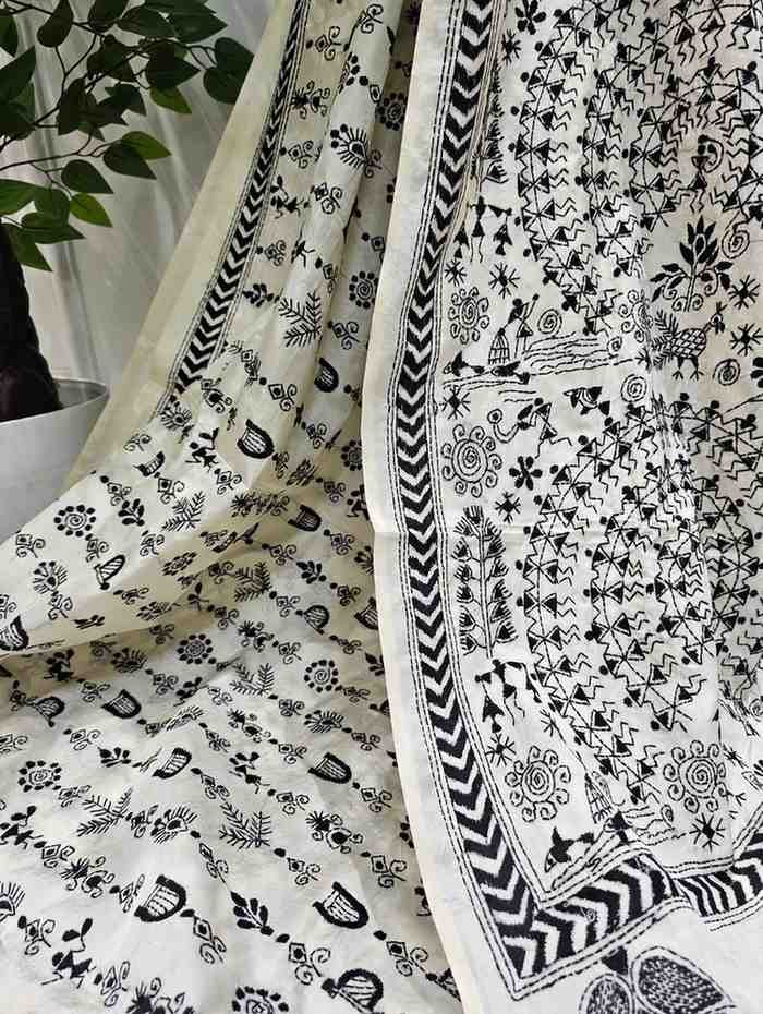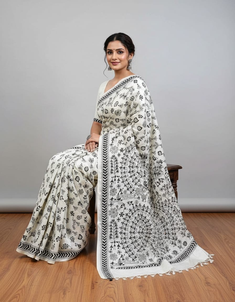 Bangalore Silk Kantha Saree - Pure White with Black Stitch