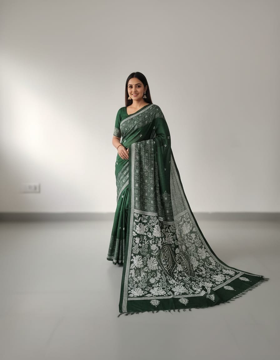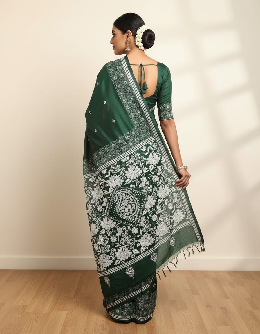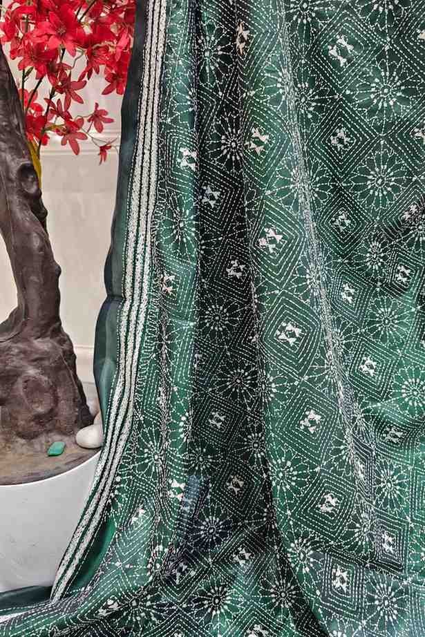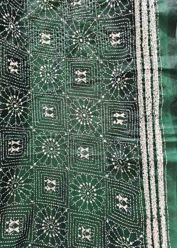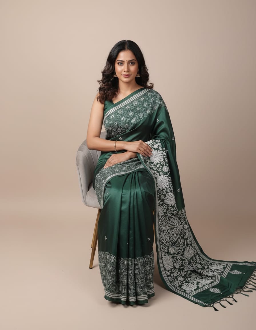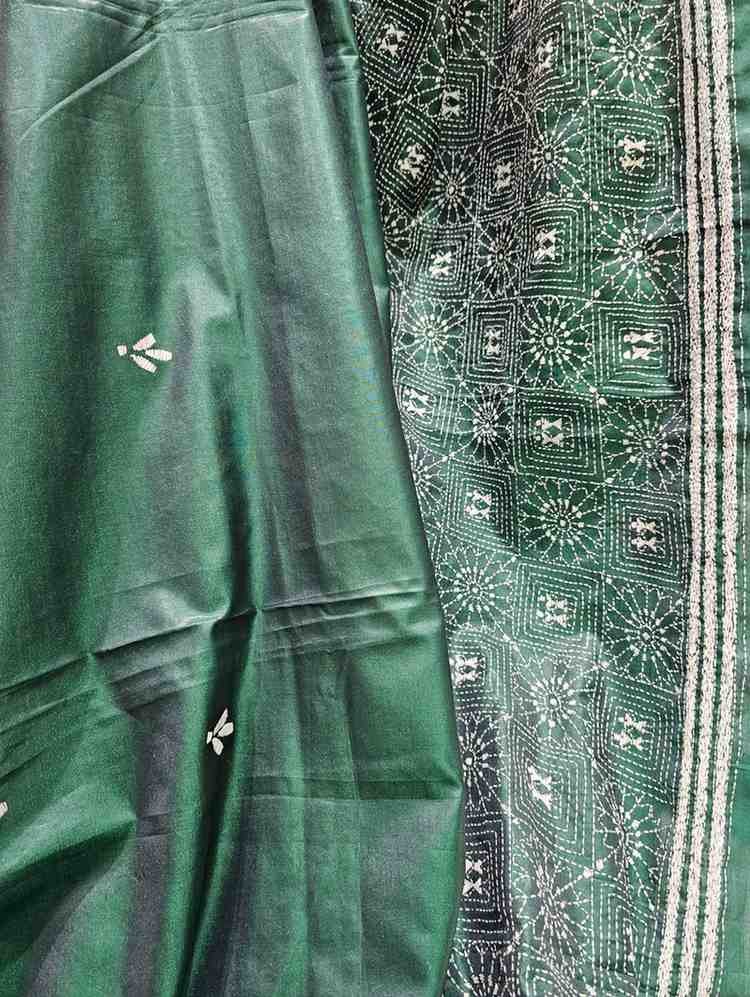Step into timeless elegance with the Bangalore Silk Kantha Saree - Sacramento. The rich Sacramento color, a deep and earthy green, creates a stunning and sophisticated backdrop for the delicate Kantha embroidery. The intricate hand-stitched motifs, traditional yet contemporary, add texture and dimension, making this saree a true work of art. Perfect for weddings, cultural events, or formal gatherings, the combination of the earthy tone and meticulous embroidery ensures you stand out with grace and elegance at any special occasion.