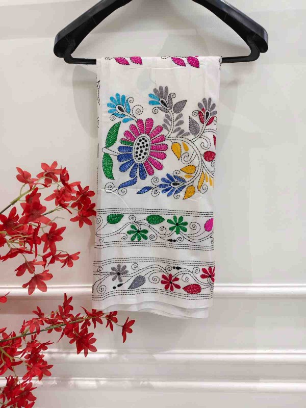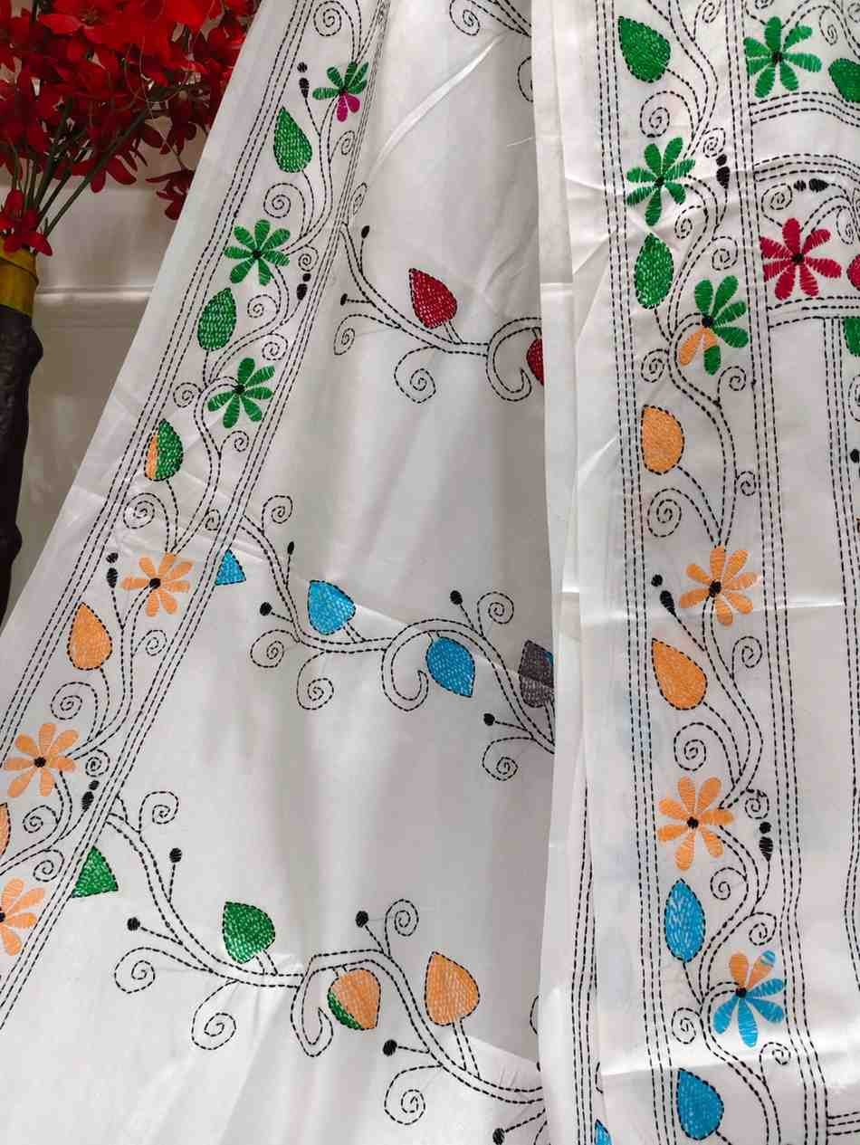 Celebrate timeless craftsmanship with this exquisite Kantha saree, a traditional form of folk embroidery from West Bengal, India. Each saree is a piece of wearable art, hand-stitched using a running stitch technique that has been passed down for generations.