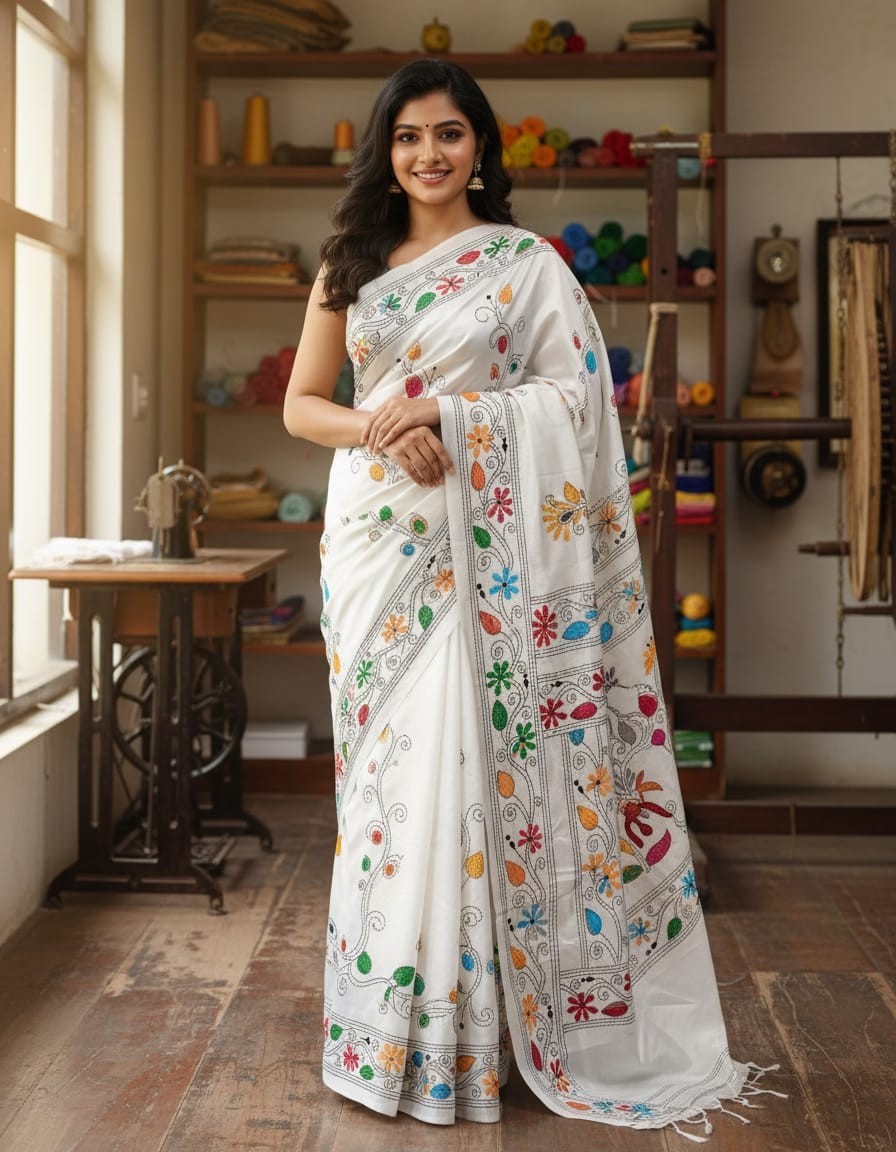 Bangalore Silk Blend Kantha Saree - White with Multicolor Design