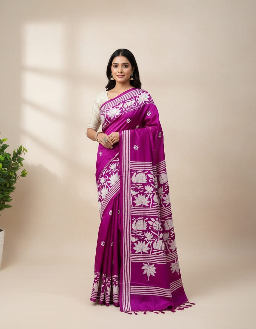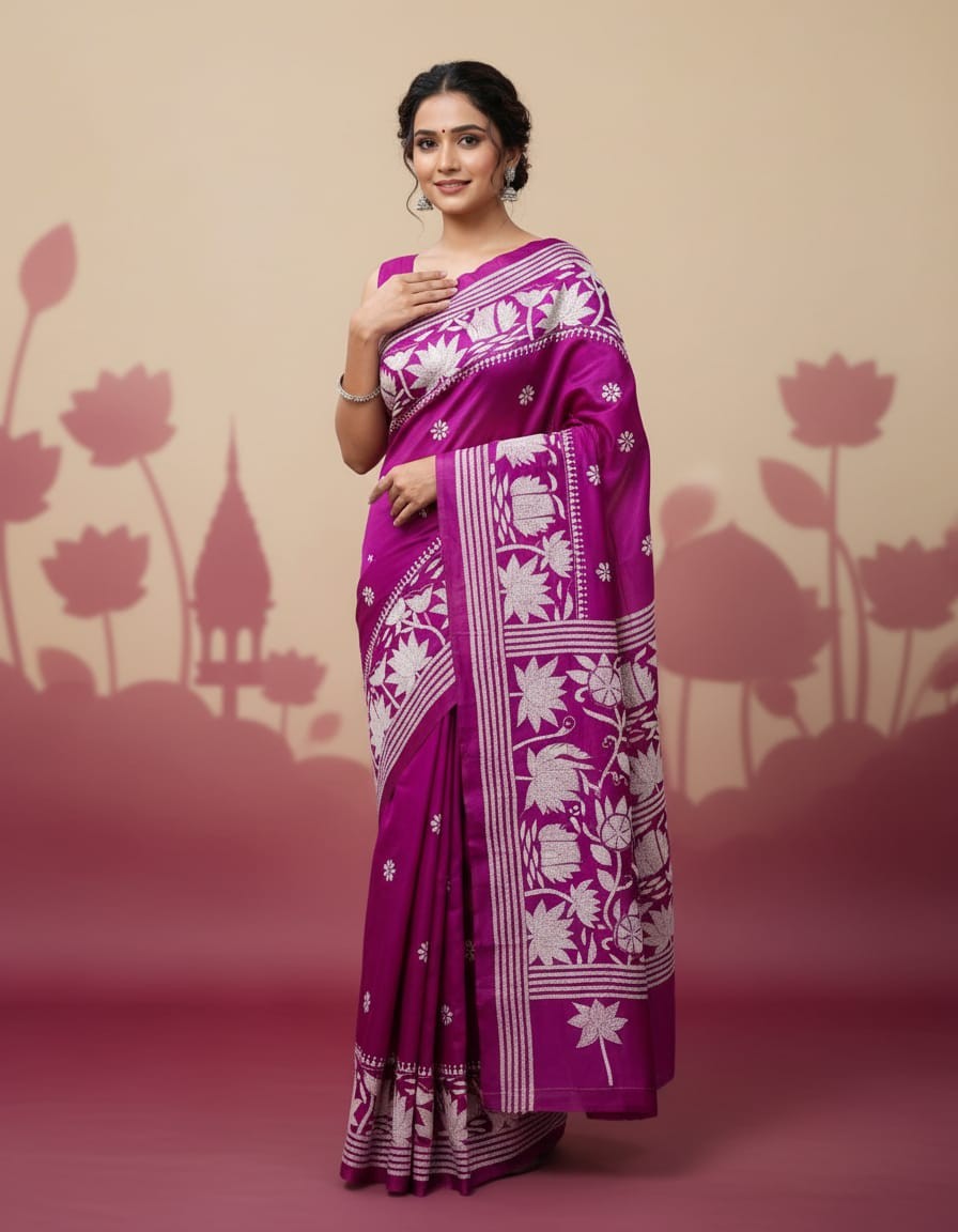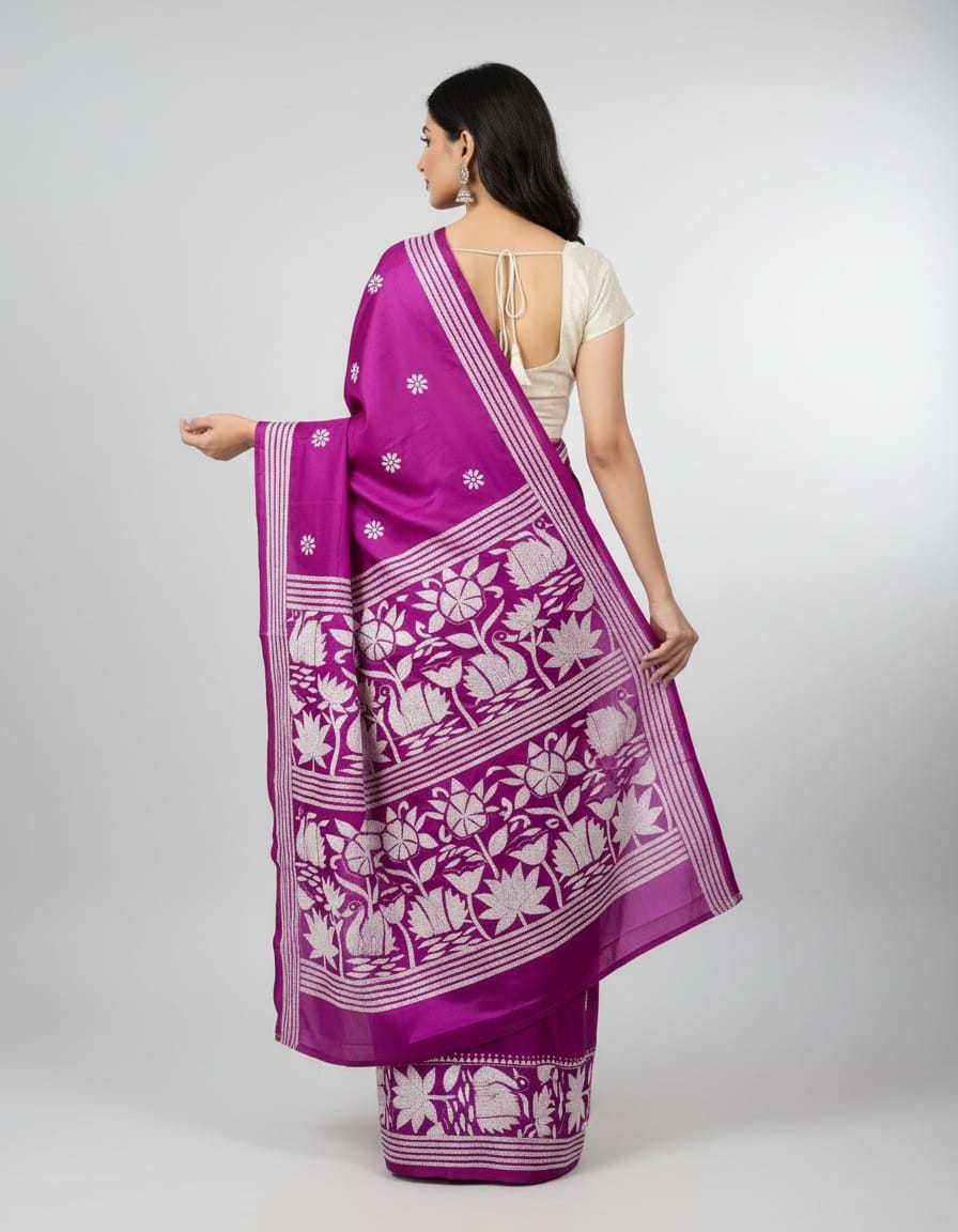 Celebrate timeless craftsmanship with this exquisite Kantha saree, a traditional form of folk embroidery from West Bengal, India. Each saree is a piece of wearable art, hand-stitched using a running stitch technique that has been passed down for generations.