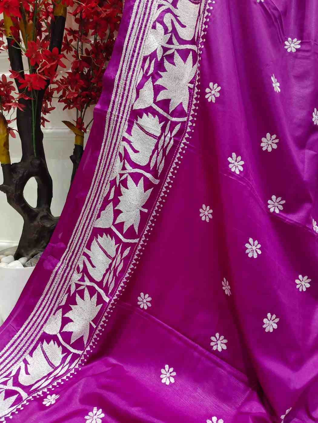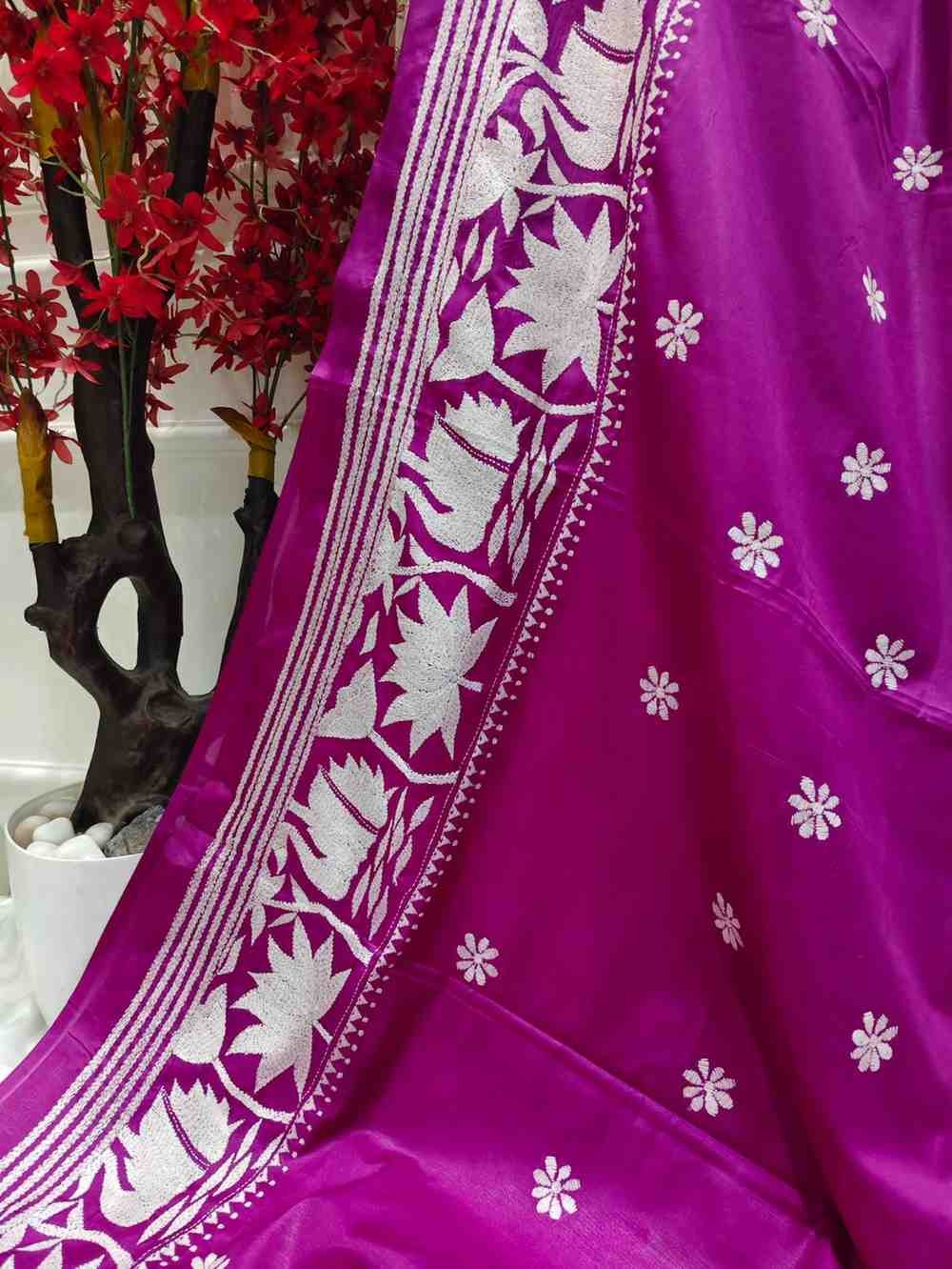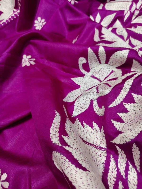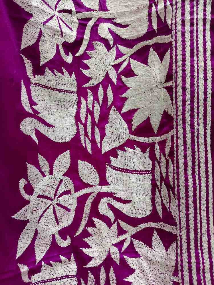 Celebrate timeless craftsmanship with this exquisite Kantha saree, a traditional form of folk embroidery from West Bengal, India. Each saree is a piece of wearable art, hand-stitched using a running stitch technique that has been passed down for generations.