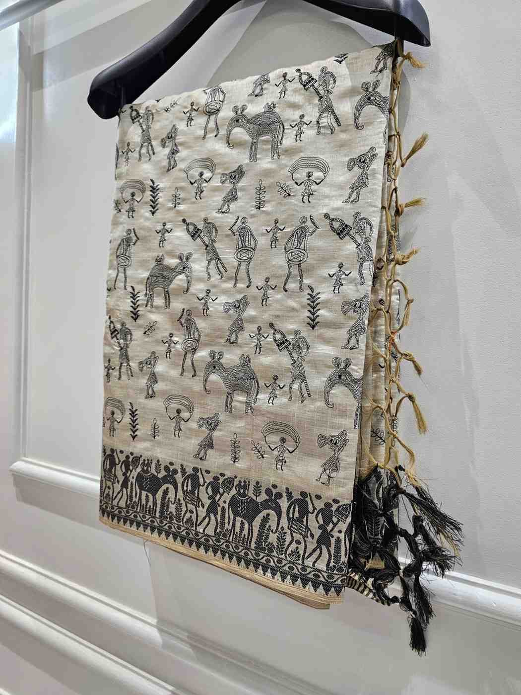 Black Thread Work Tussar Silk Saree - Elephant Motifs
