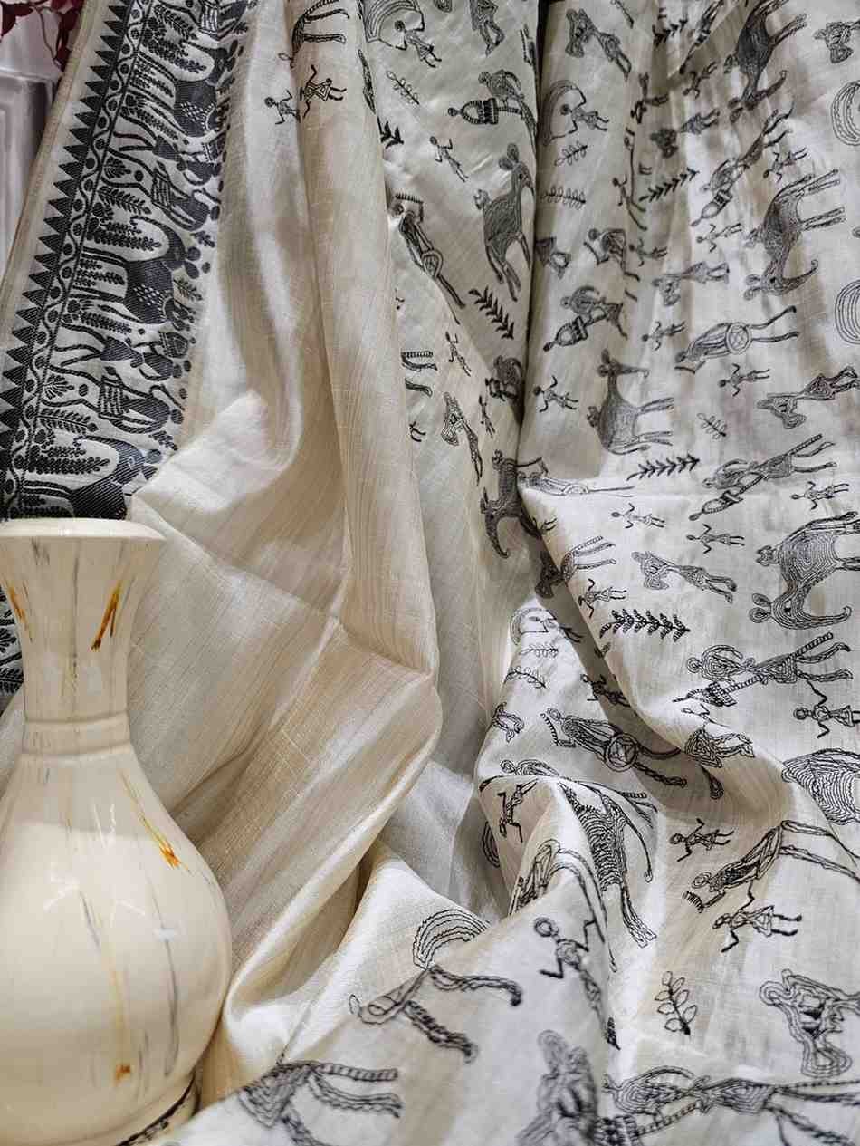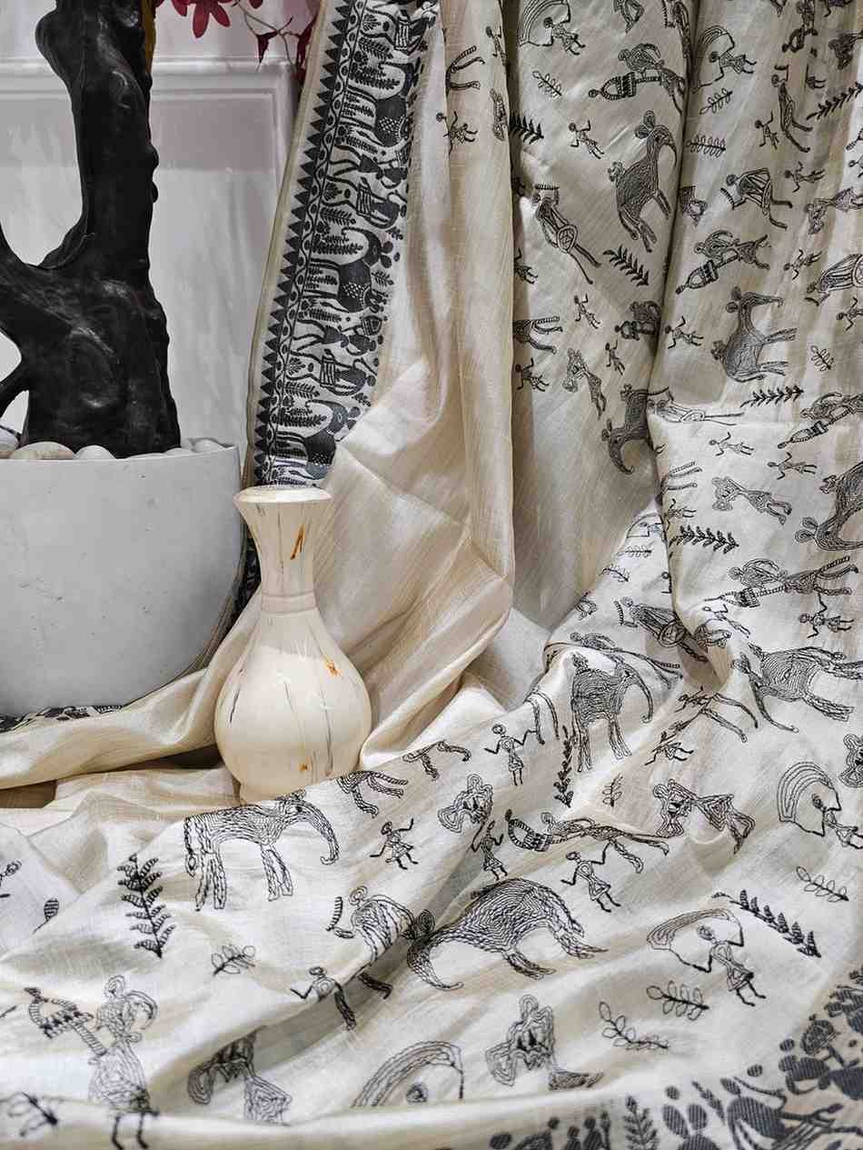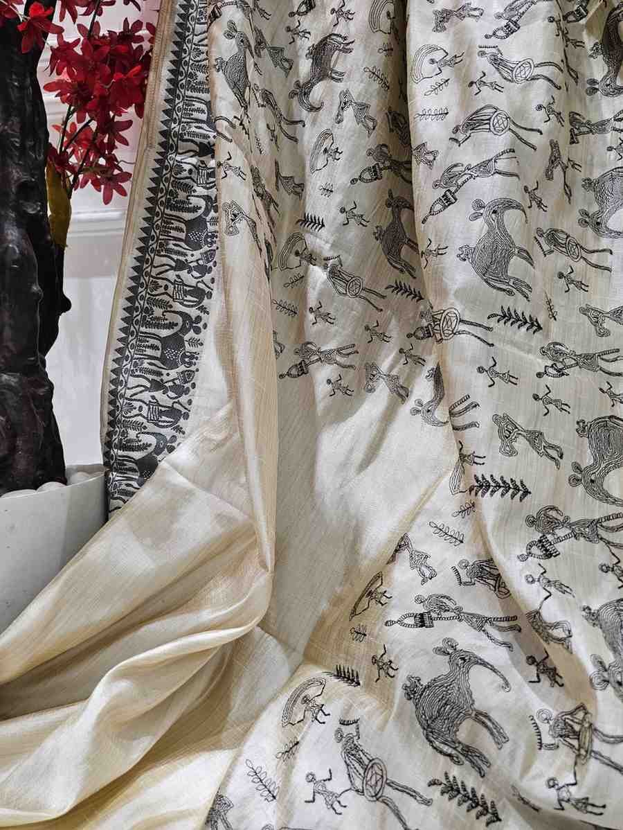 Embody strength and grace with the Black Thread Work Tussar Silk Saree - Elephant Motifs. Crafted from luxurious Tussar silk, this saree features intricate black thread work that brings to life majestic elephant motifs, symbolizing wisdom, power, and grace. The deep black base serves as a striking contrast to the finely detailed white and grey embroidery, with each elephant motif capturing the grandeur and majesty of these magnificent creatures. Perfect for weddings, formal gatherings, or cultural celebrations, this saree is a statement piece that celebrates tradition, elegance, and cultural heritage.