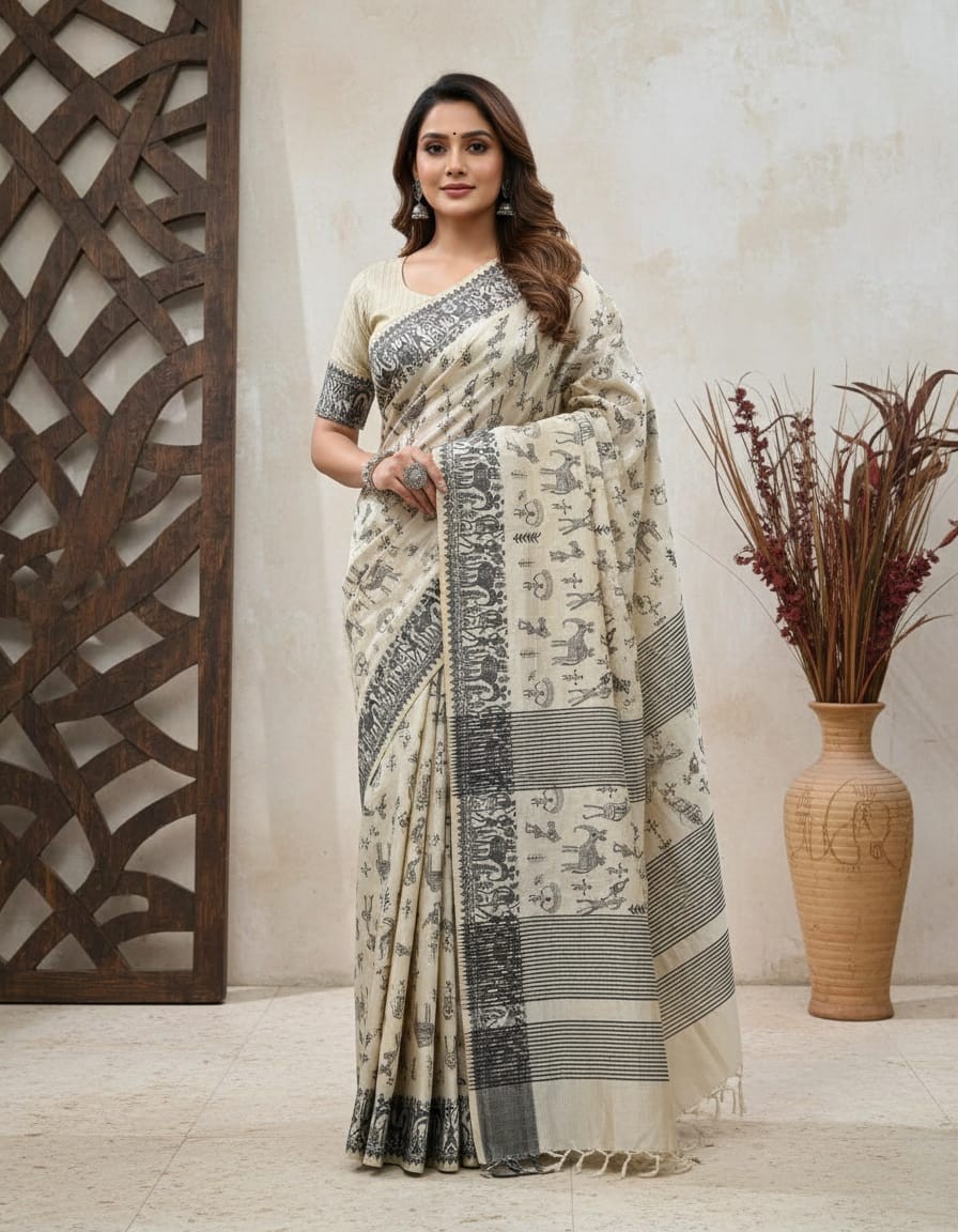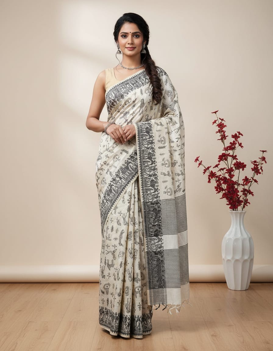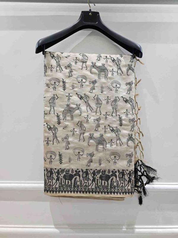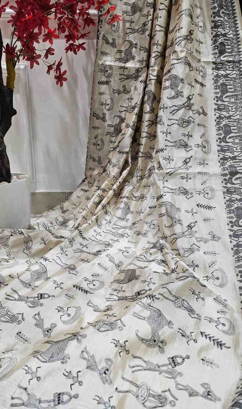 Embody strength and grace with the Black Thread Work Tussar Silk Saree - Elephant Motifs. Crafted from luxurious Tussar silk, this saree features intricate black thread work that brings to life majestic elephant motifs, symbolizing wisdom, power, and grace. The deep black base serves as a striking contrast to the finely detailed white and grey embroidery, with each elephant motif capturing the grandeur and majesty of these magnificent creatures. Perfect for weddings, formal gatherings, or cultural celebrations, this saree is a statement piece that celebrates tradition, elegance, and cultural heritage.