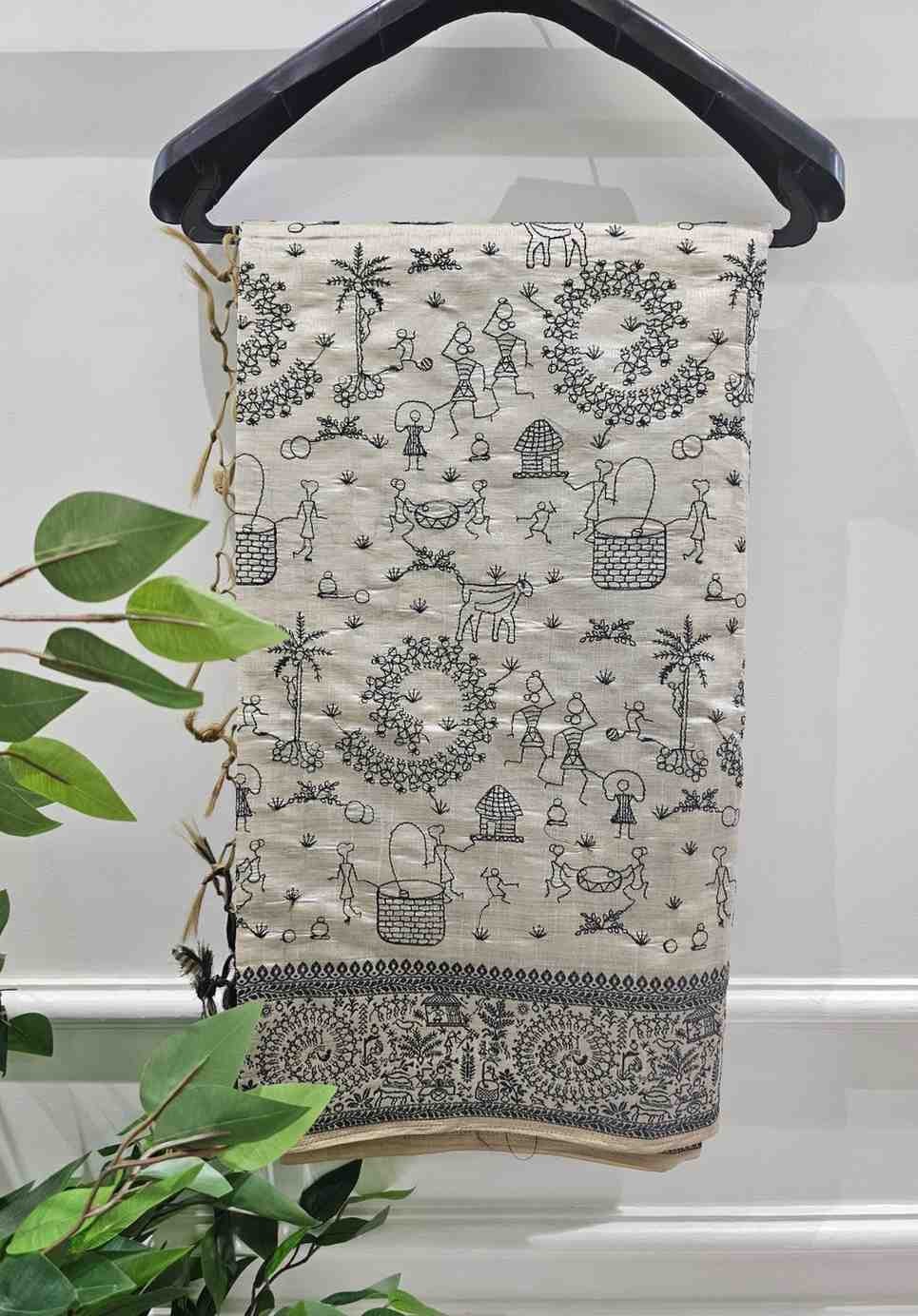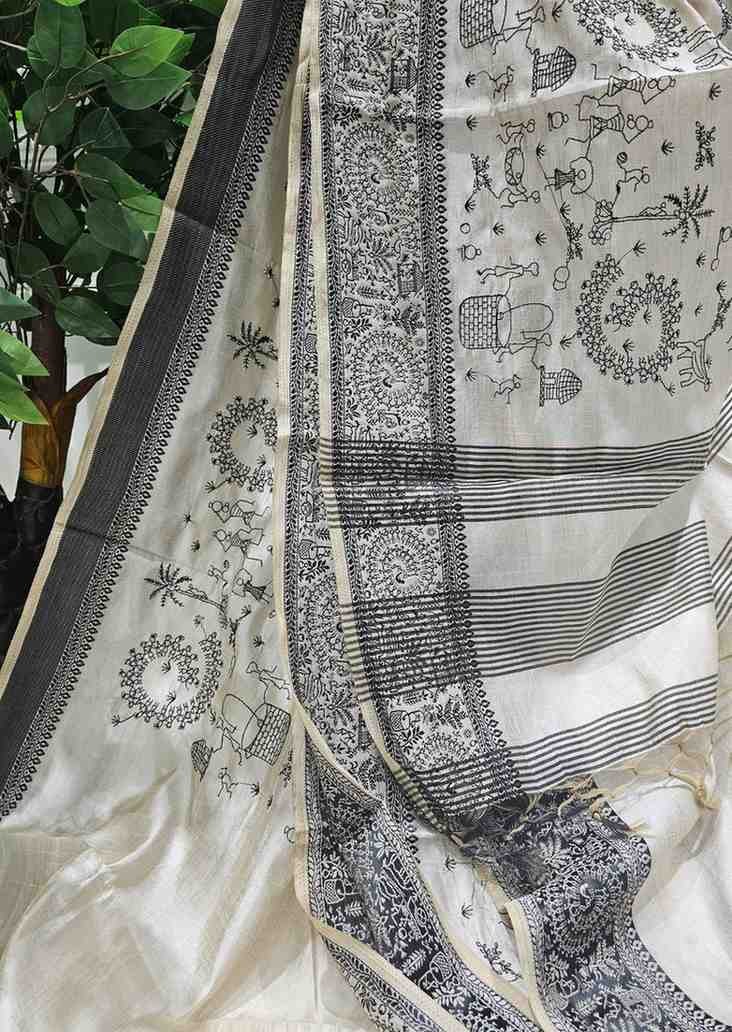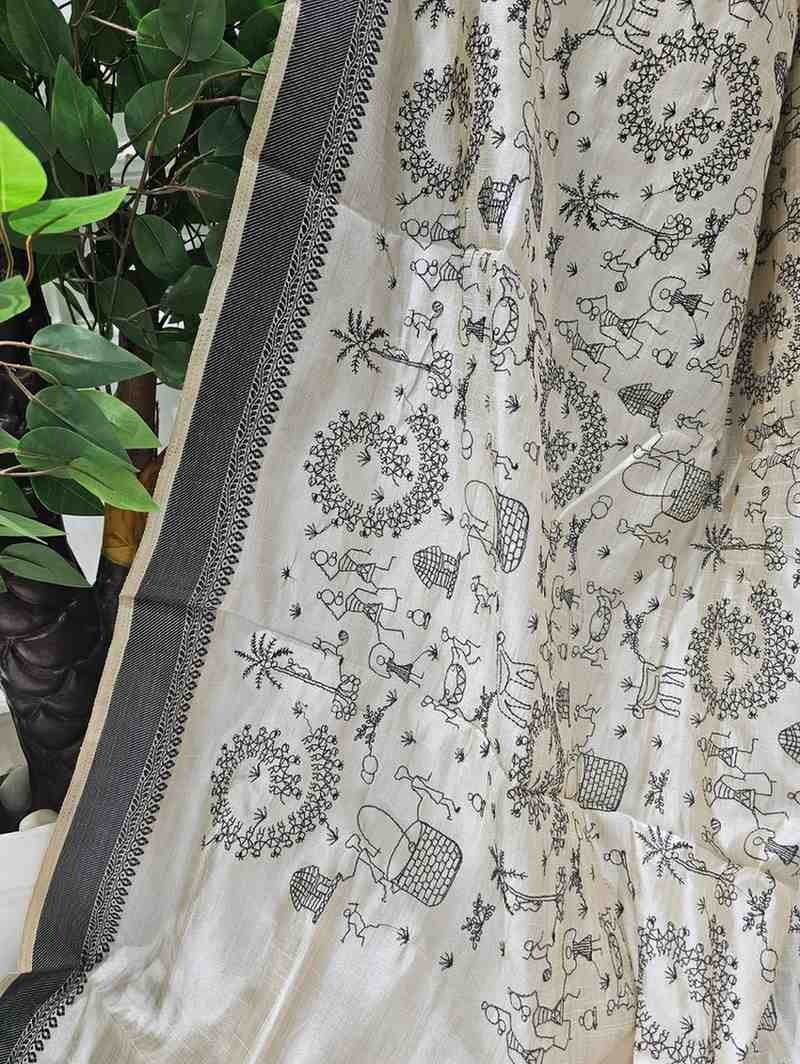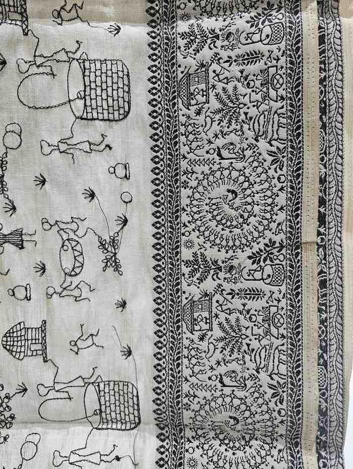 Black Thread Work Tussar Silk Saree - Rural Life Motifs