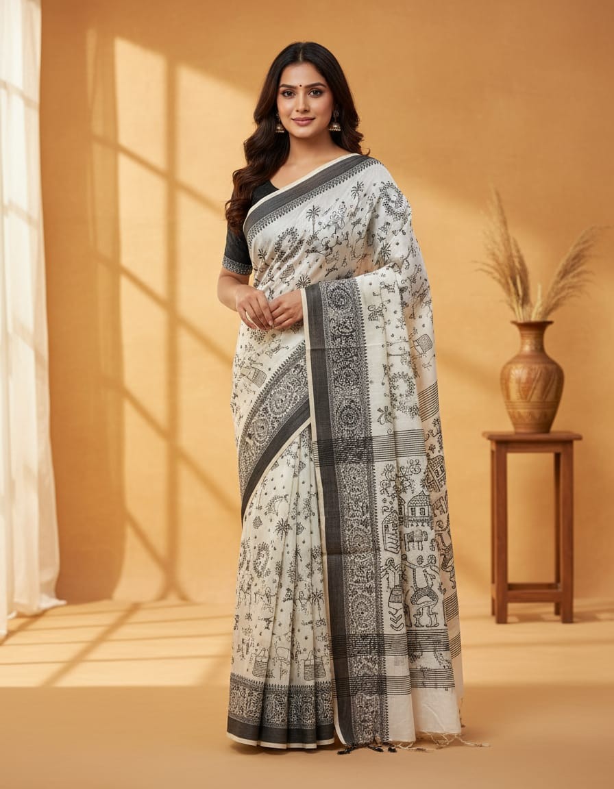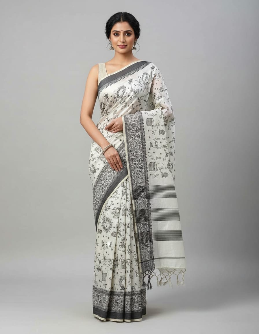 Black Thread Work Tussar Silk Saree - Rural Life Motifs
