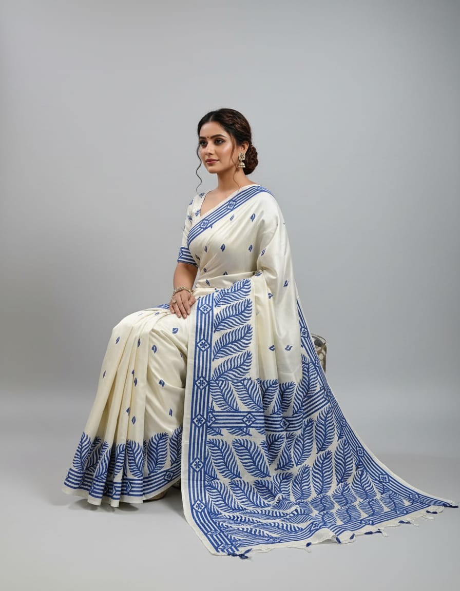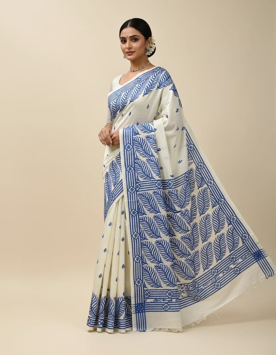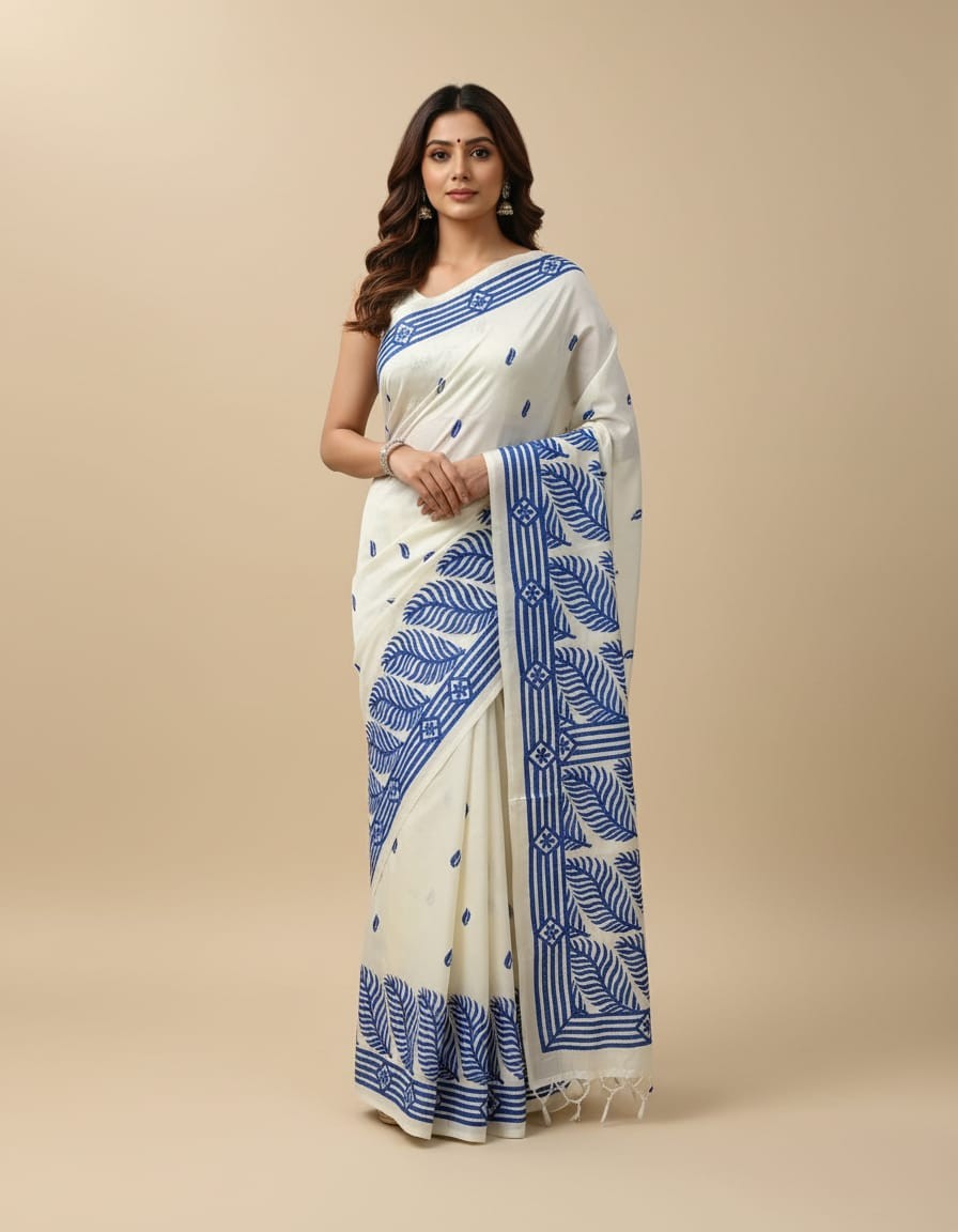 Celebrate timeless craftsmanship with this exquisite Kantha saree, a traditional form of folk embroidery from West Bengal, India. Each saree is a piece of wearable art, hand-stitched using a running stitch technique that has been passed down for generations.