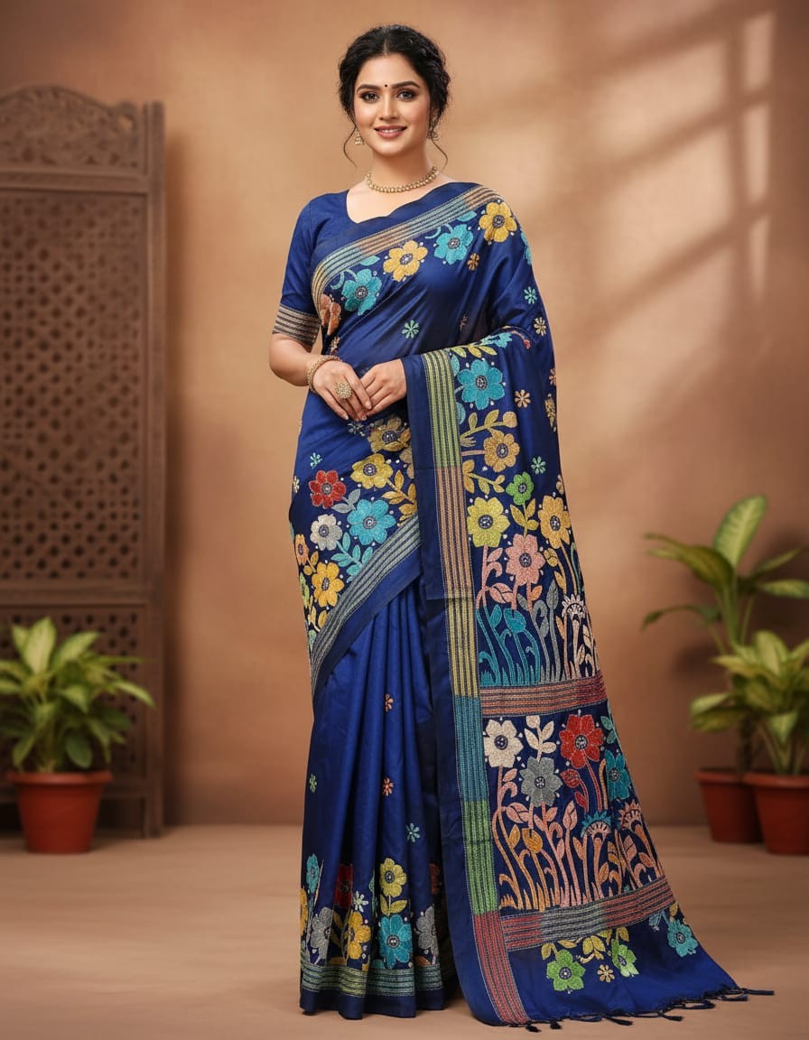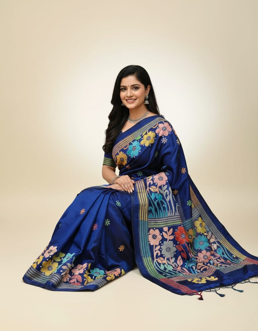 Celebrate timeless craftsmanship with this exquisite Kantha saree, a traditional form of folk embroidery from West Bengal, India. Each saree is a piece of wearable art, hand-stitched using a running stitch technique that has been passed down for generations.
