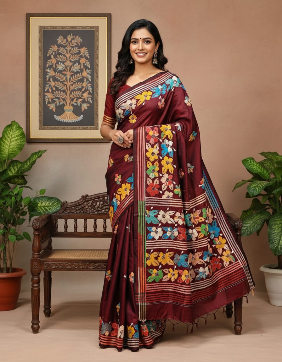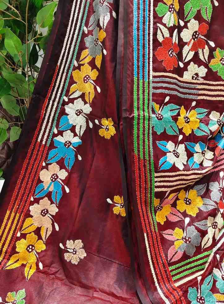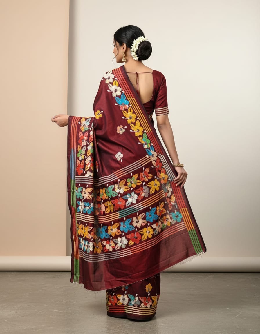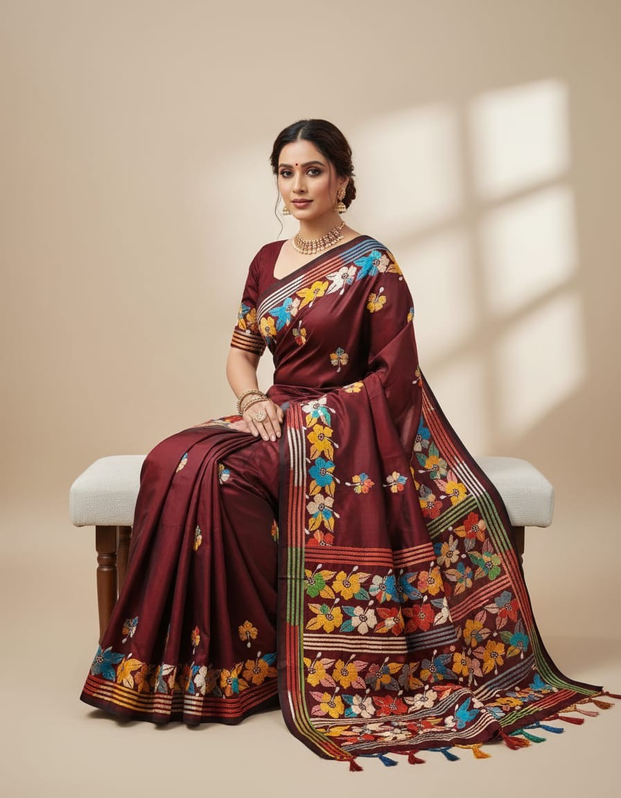 Celebrate timeless craftsmanship with this exquisite Kantha saree, a traditional form of folk embroidery from West Bengal, India. Each saree is a piece of wearable art, hand-stitched using a running stitch technique that has been passed down for generations.