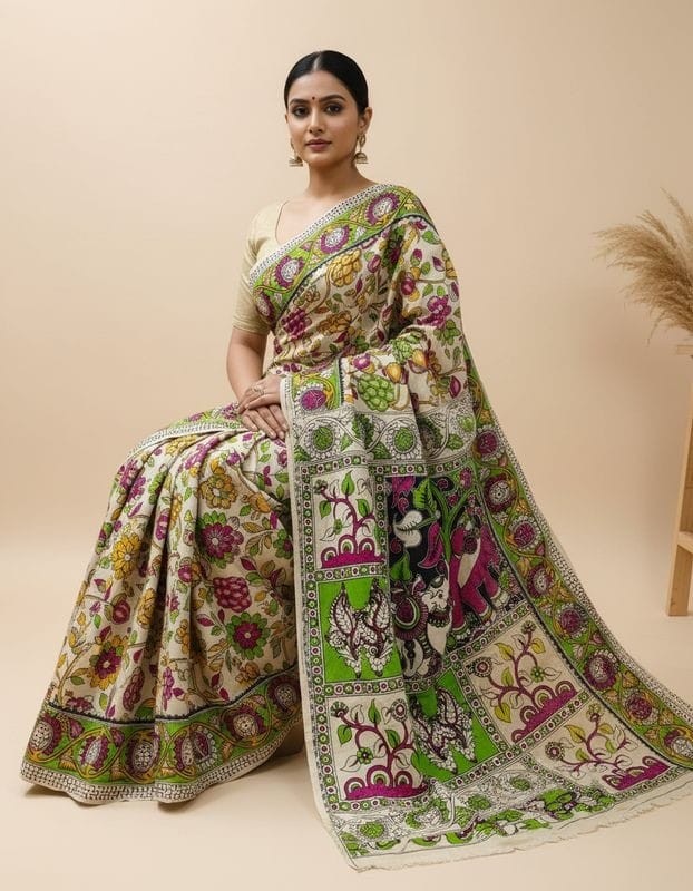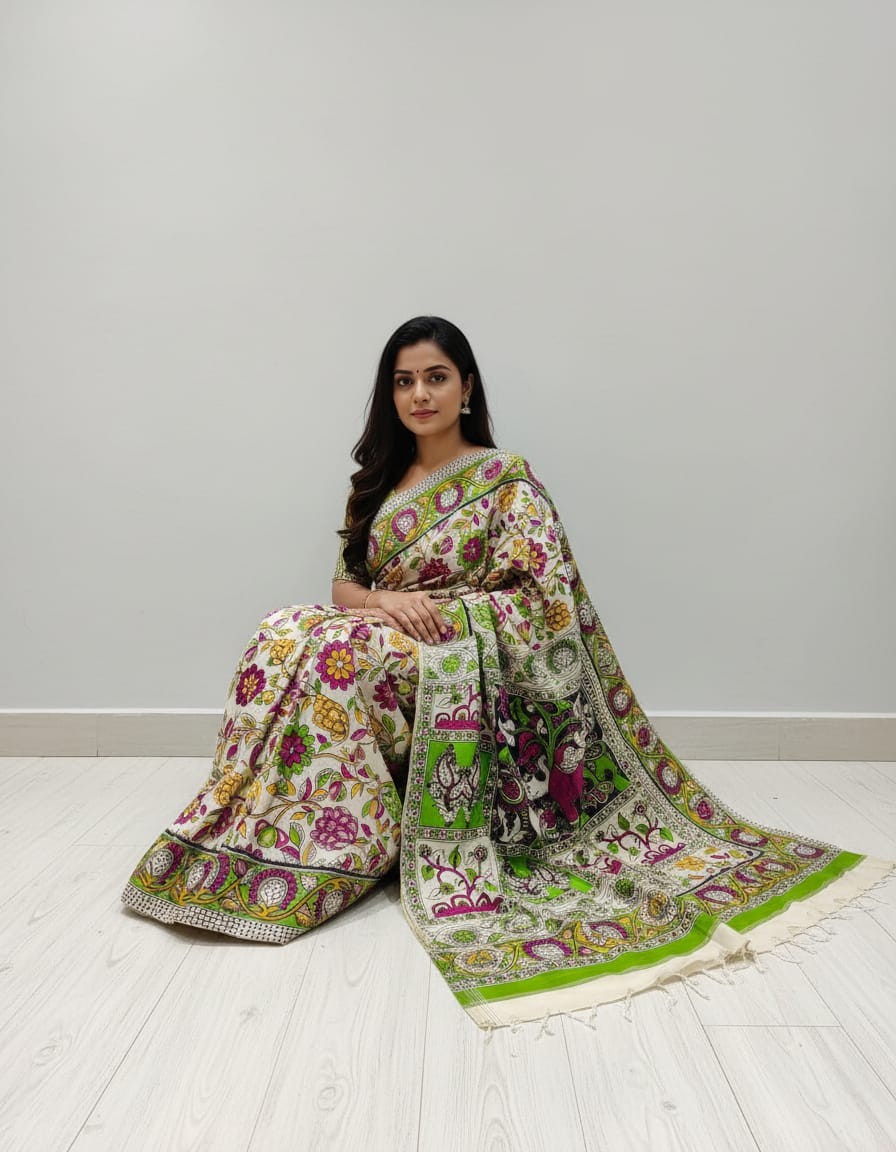 • Kalamkari sarees are sun-dried in open agricultural fields, which may result in minor dust marks — a testament to their authenticity. We recommend washing before first use.