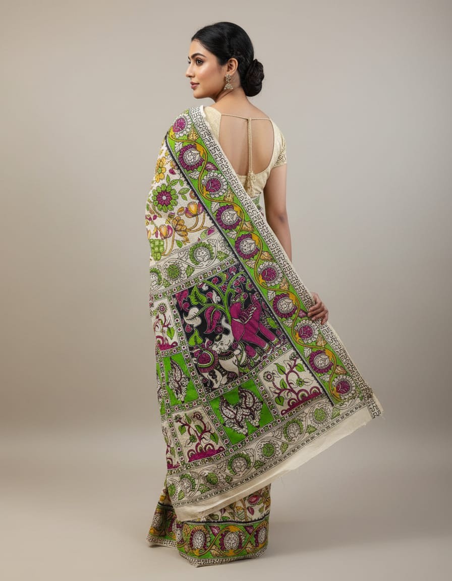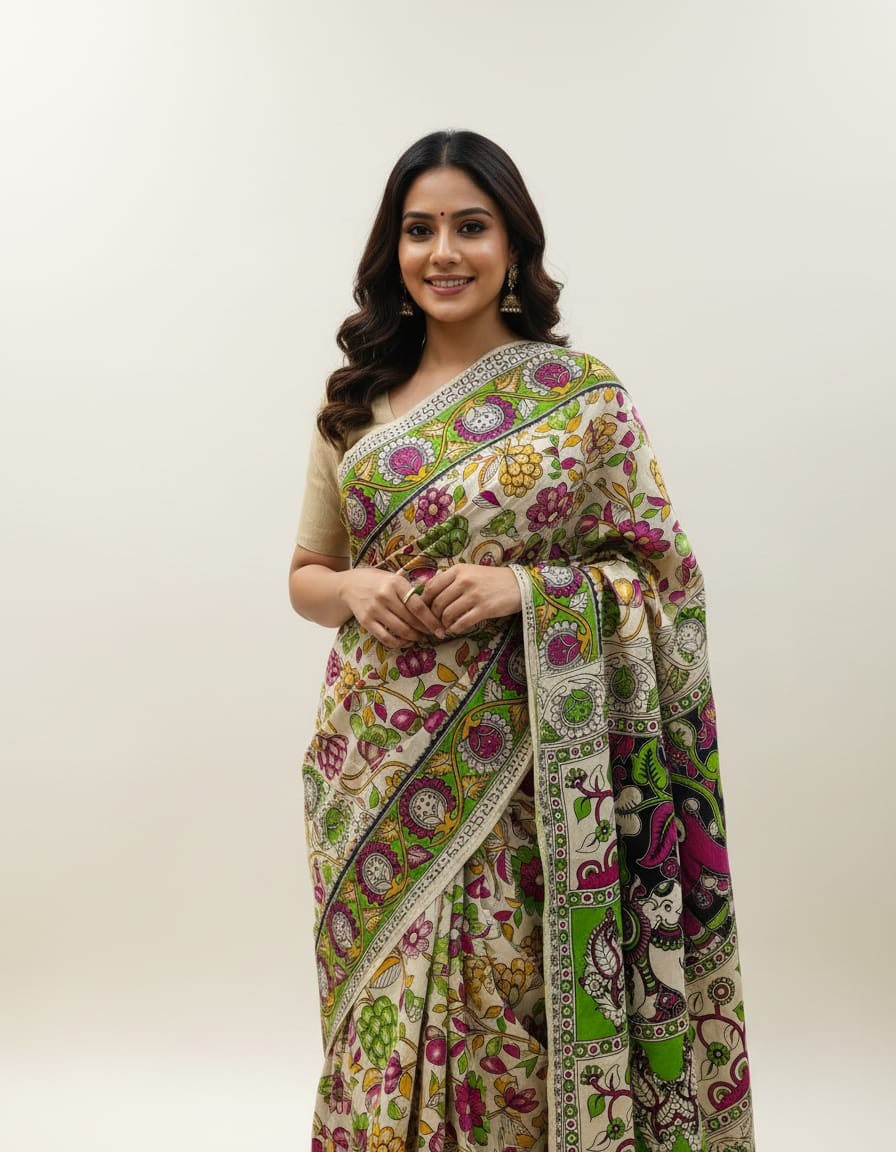 'Chitralekha' Off White Canvas with Floral motifs cotton Kalamkari Saree