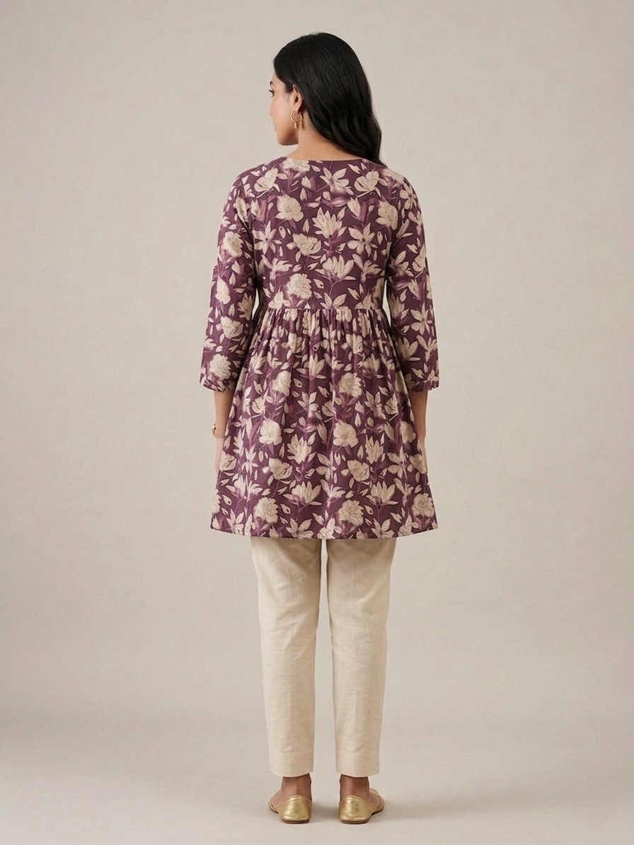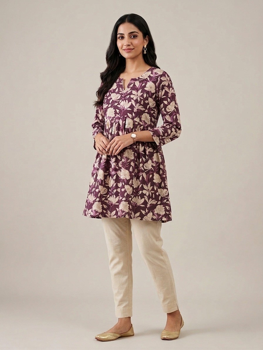 This ladies' short cotton kurti features a sophisticated floral design with a flattering, feminine silhouette.