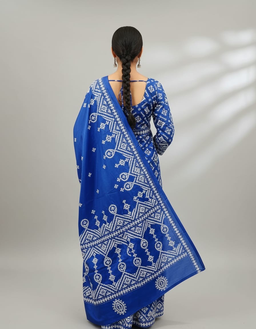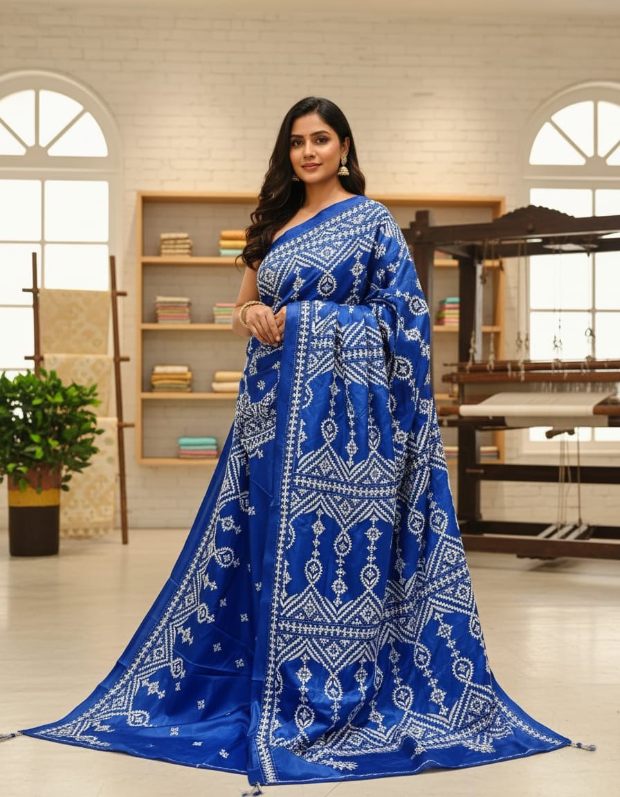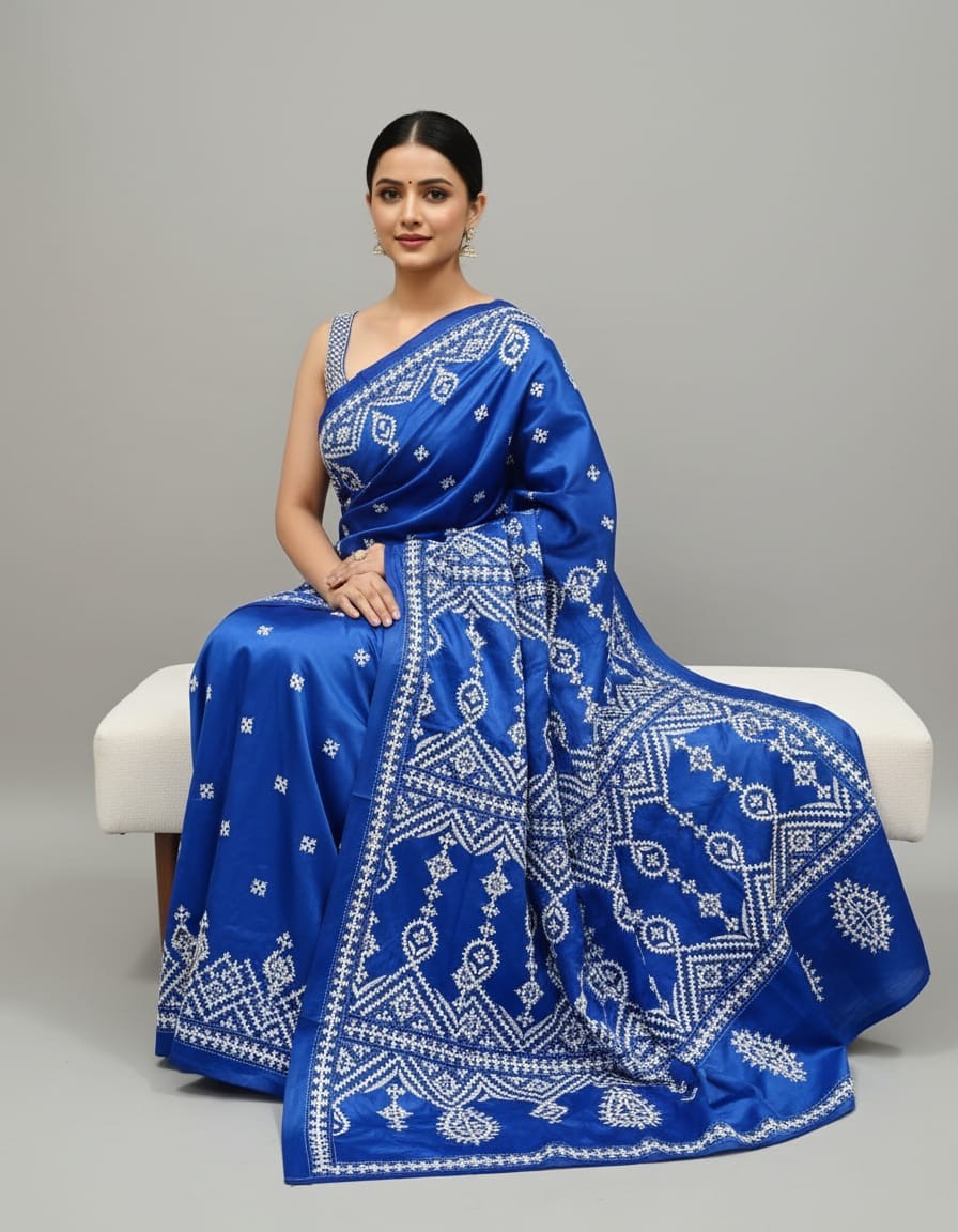 Celebrate timeless craftsmanship with this exquisite Kantha saree, a traditional form of folk embroidery from West Bengal, India. Each saree is a piece of wearable art, hand-stitched using a running stitch technique that has been passed down for generations.