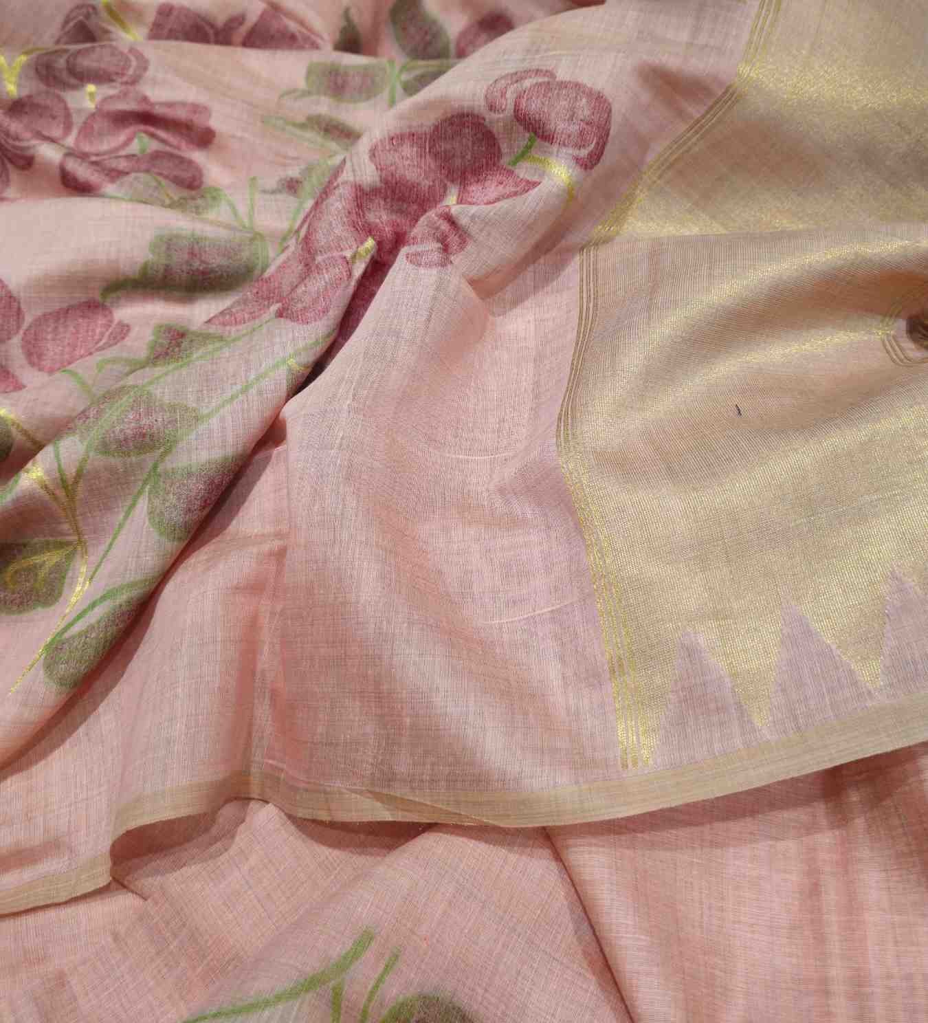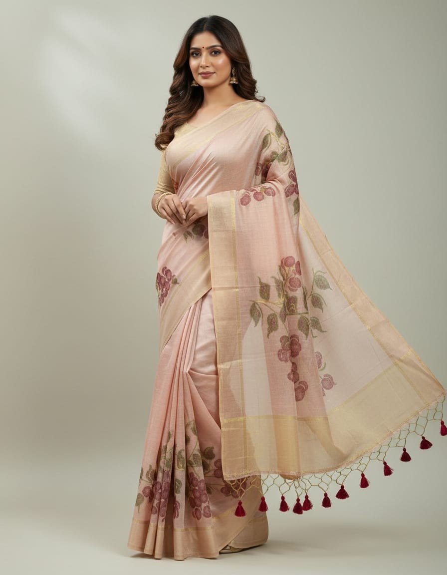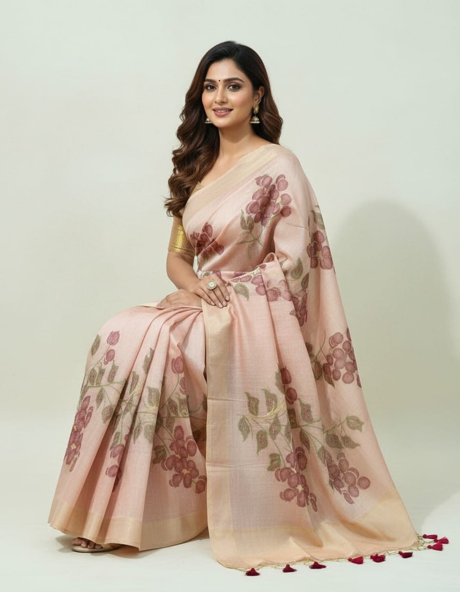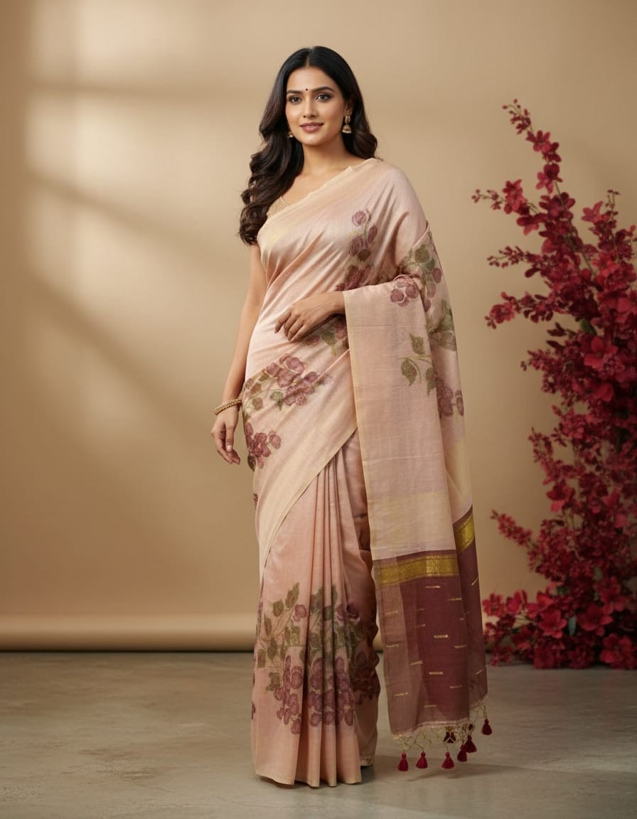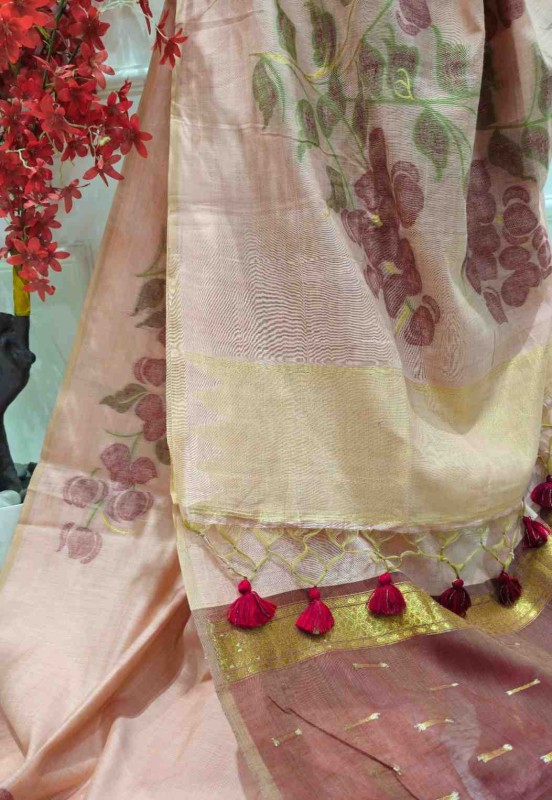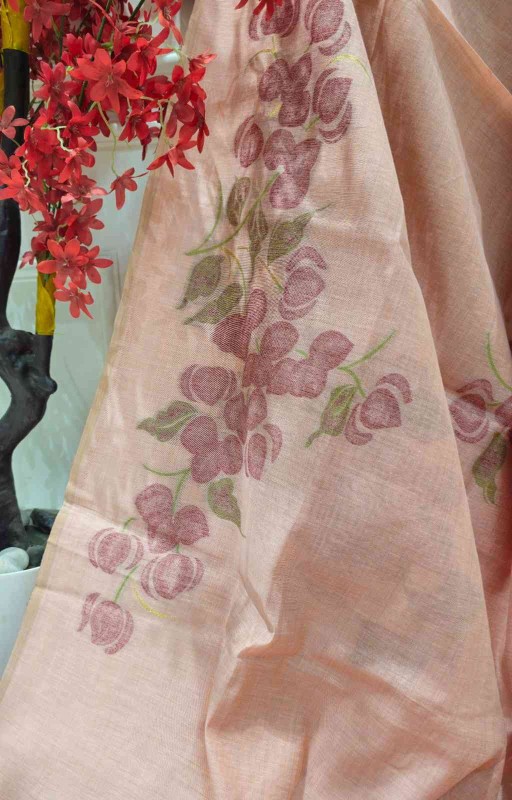 Floral Art Jamdani Saree – Light Peach with Maroon Motifs