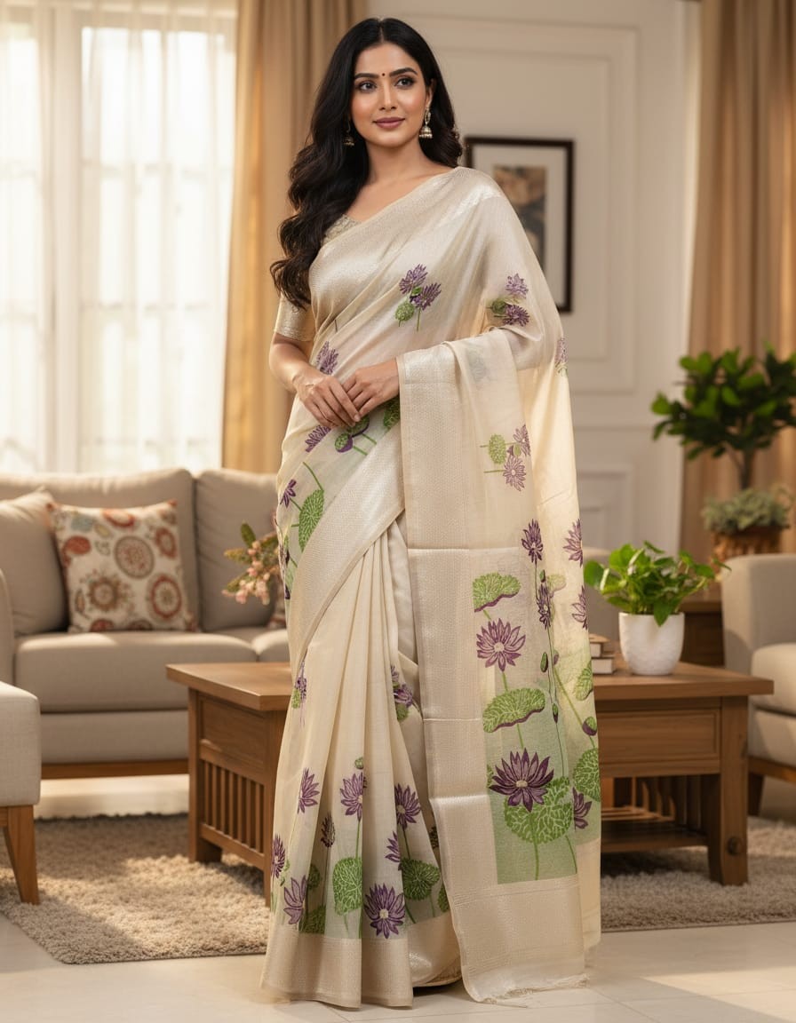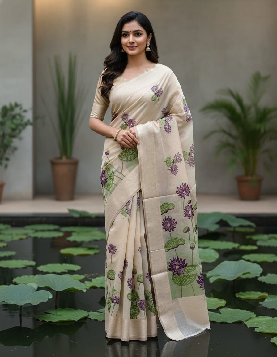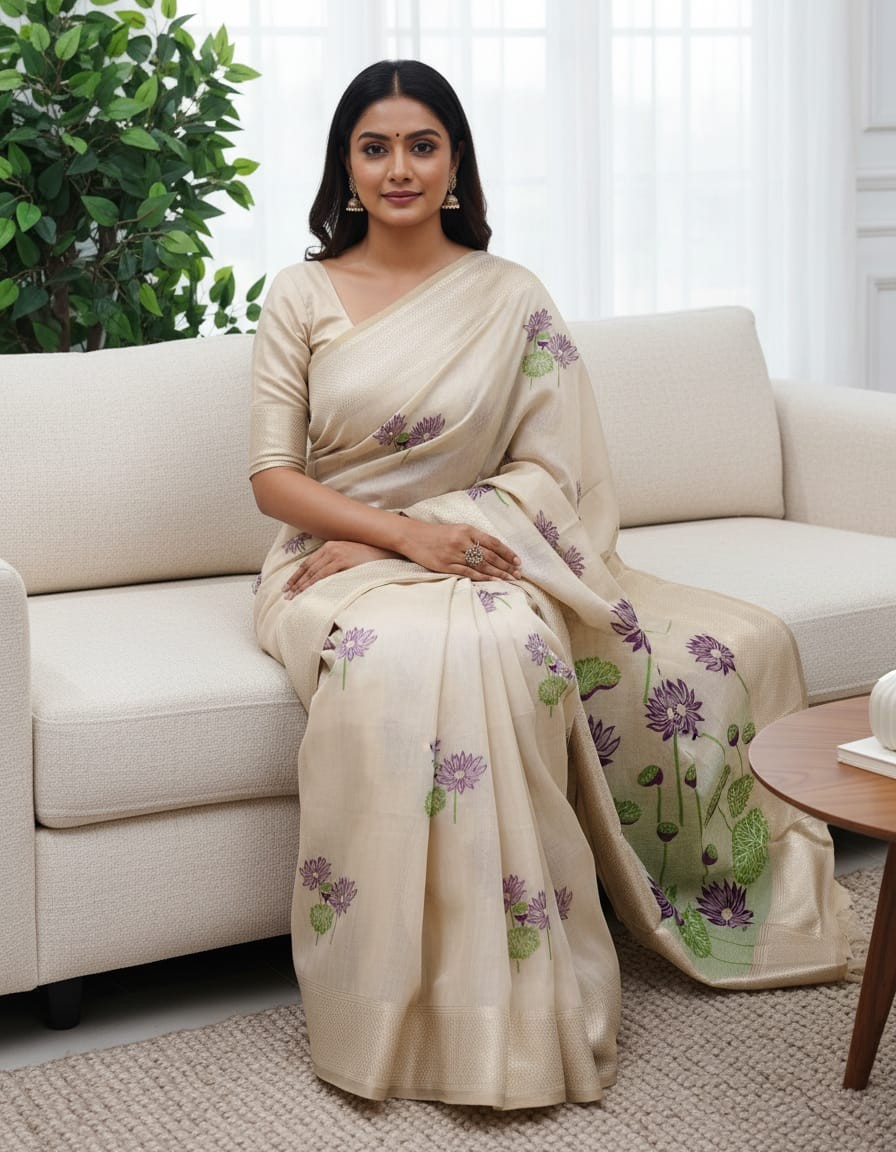 Embrace the elegance of timeless craftsmanship with our Purple Lily Grove Muga Jamdani Saree, beautifully adorned with Purple Lily Motifs. Handwoven with the finest Jamdani technique, this saree features intricate floral patterns that add a touch of artistic sophistication to the fabric. The soft off-white base, enhanced by the refreshing purple blossoms, creates a serene and graceful look, making it perfect for weddings, festive celebrations, or cultural events. With its luxurious drape and delicate craftsmanship, this saree is a true masterpiece of traditional artistry.