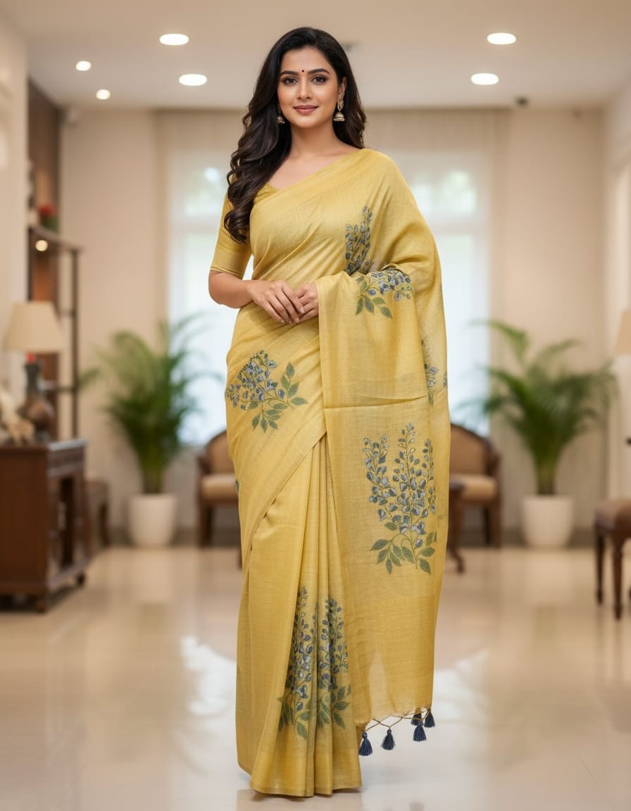 Brighten up your wardrobe with the lively charm of our Yellow Blossom Floral Art Jamdani Saree. This exquisite saree is woven using the finest Jamdani technique, featuring intricate handwoven floral motifs that bring a burst of energy and beauty to the fabric. The vibrant yellow hue, inspired by the freshness of blooming blossoms, offers a cheerful and elegant look, making it perfect for festive celebrations, weddings, or special gatherings. The combination of luxurious fabric and timeless craftsmanship ensures that you stand out with grace and vibrancy.