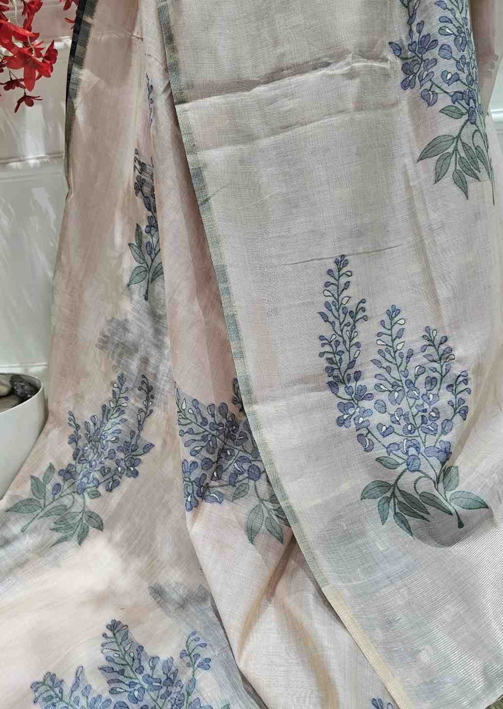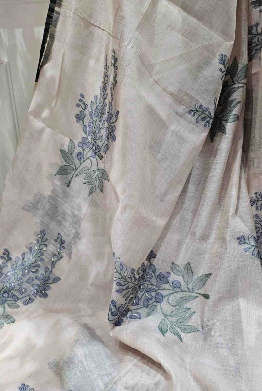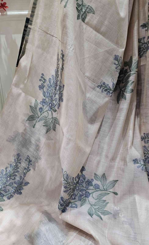 Floral Art Muga Jamdani Saree - English Color with Blue Blossom