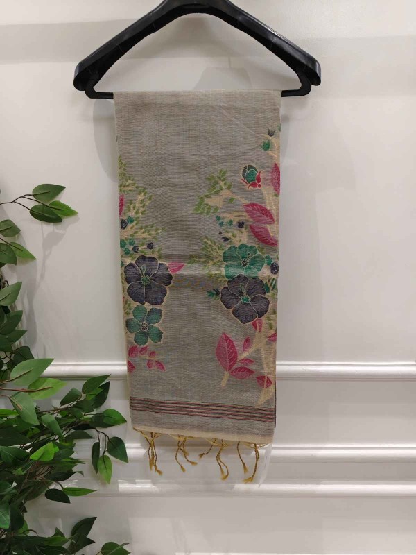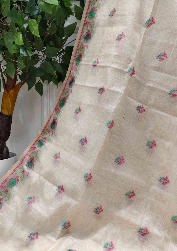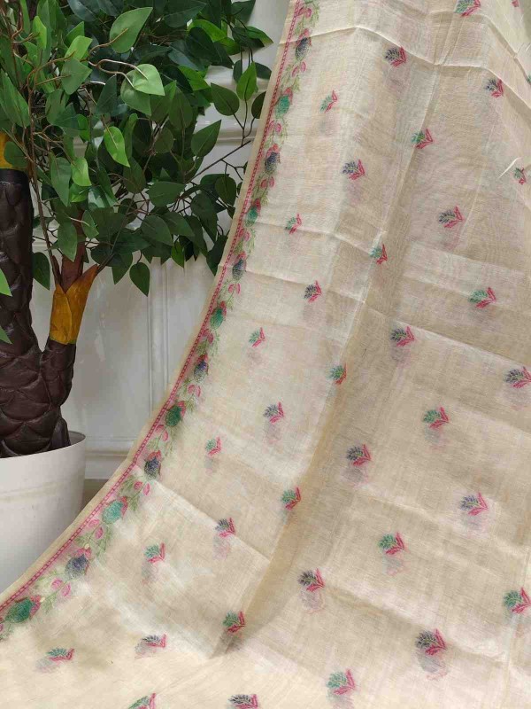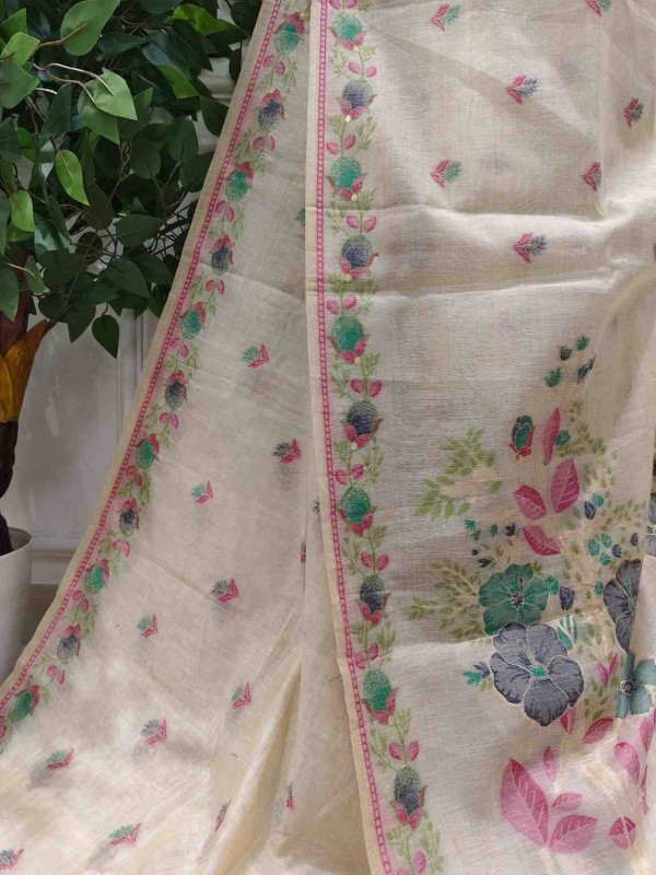 Embrace the elegance of timeless craftsmanship with our Mystic Florals Muga Jamdani Saree, beautifully adorned with Flower Design. Handwoven with the finest Jamdani technique, this saree features intricate floral patterns that add a touch of artistic sophistication to the fabric. The soft off-white base, enhanced by the refreshing flowert design, creates a serene and graceful look, making it perfect for weddings, festive celebrations, or cultural events. With its luxurious drape and delicate craftsmanship, this saree is a true masterpiece of traditional artistry.
