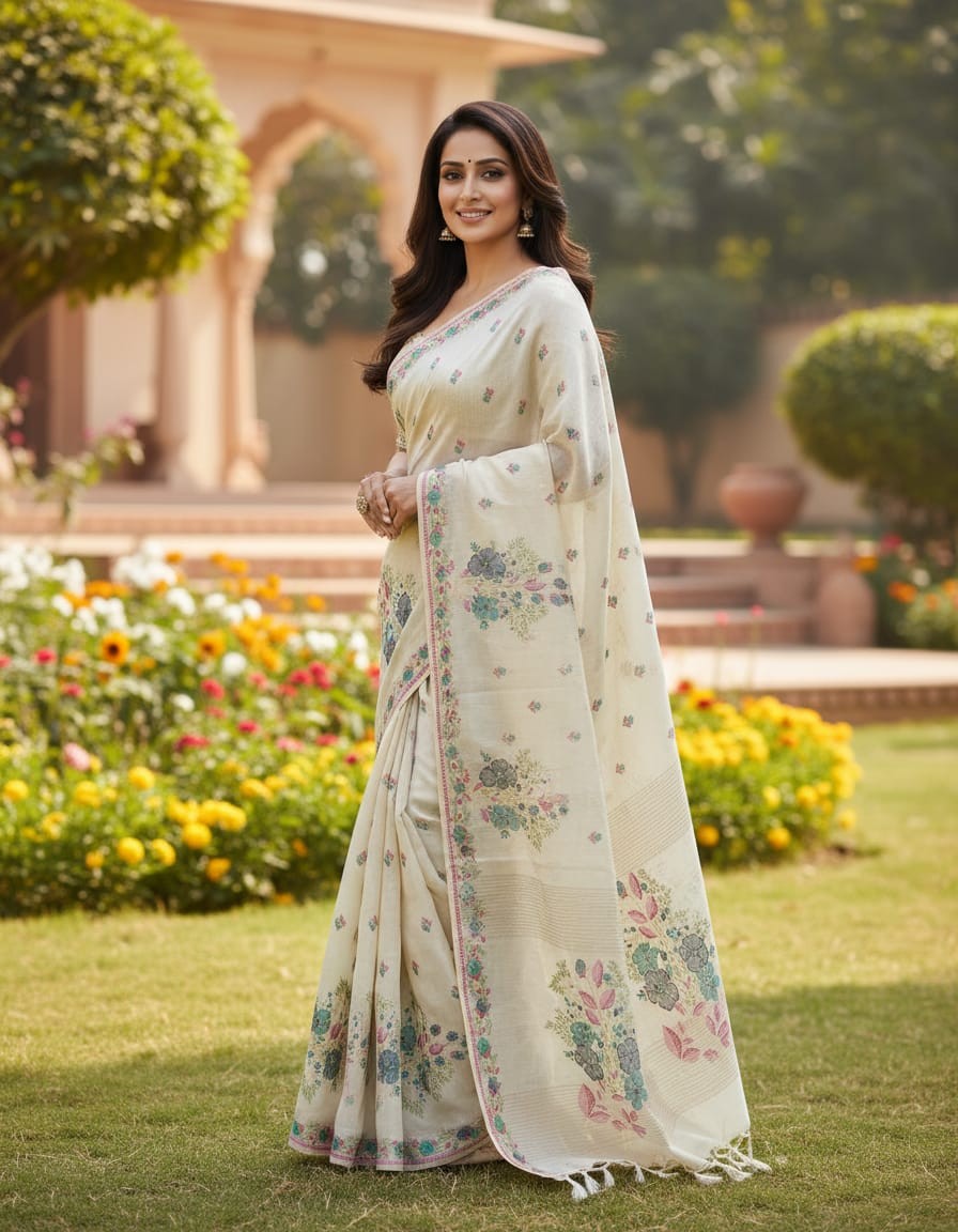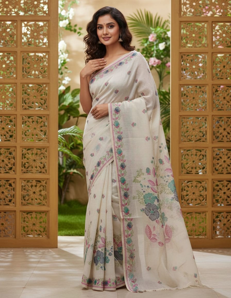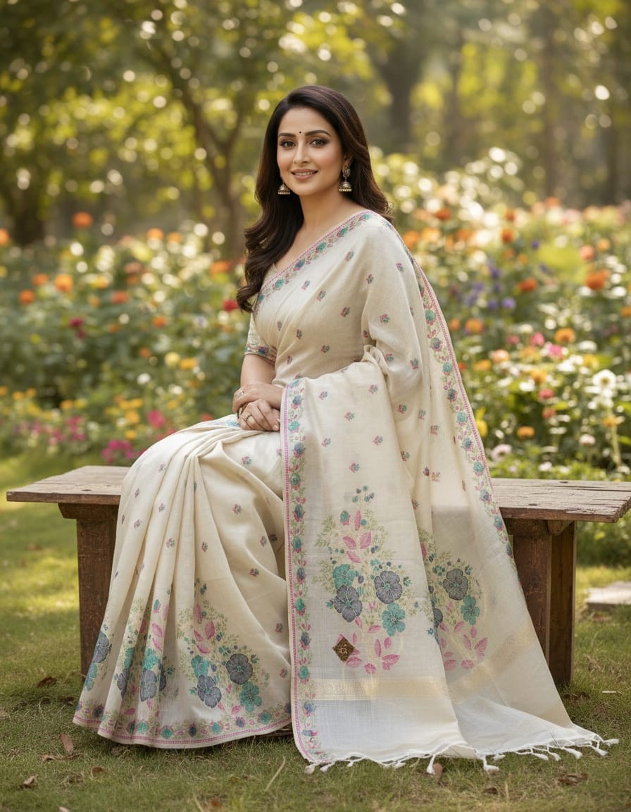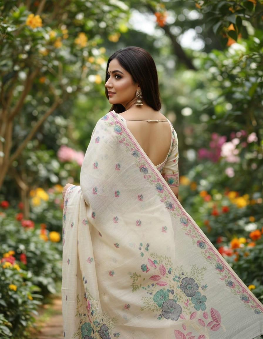 Embrace the elegance of timeless craftsmanship with our Mystic Florals Muga Jamdani Saree, beautifully adorned with Flower Design. Handwoven with the finest Jamdani technique, this saree features intricate floral patterns that add a touch of artistic sophistication to the fabric. The soft off-white base, enhanced by the refreshing flowert design, creates a serene and graceful look, making it perfect for weddings, festive celebrations, or cultural events. With its luxurious drape and delicate craftsmanship, this saree is a true masterpiece of traditional artistry.