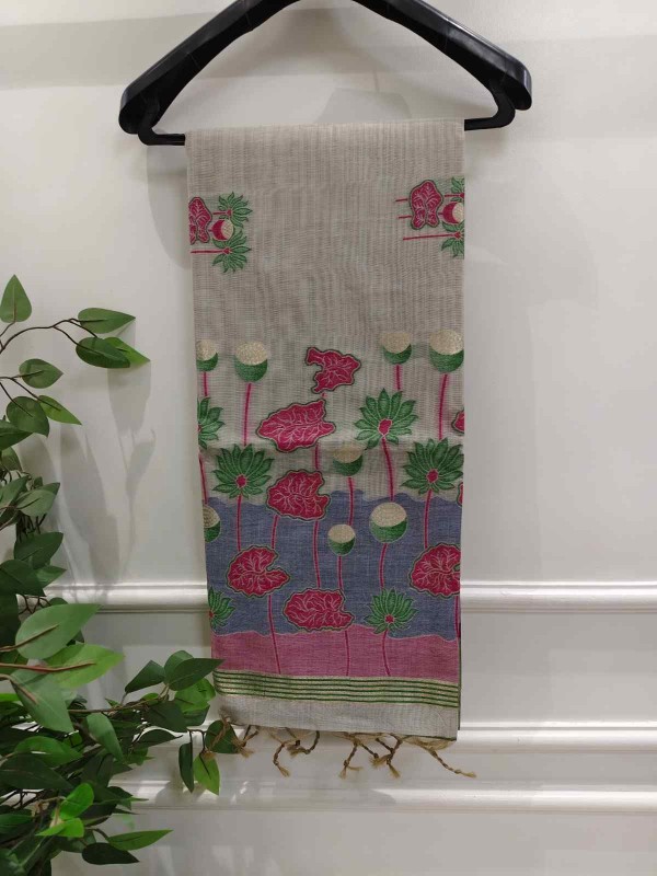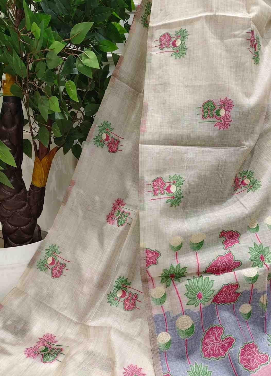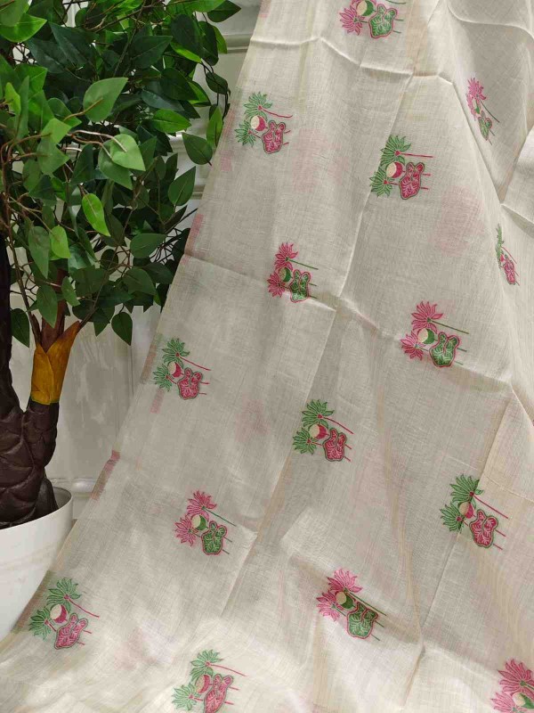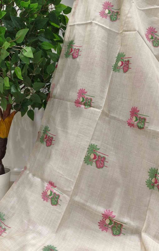 Floral Art Muga Jamdani Saree - off white with Pink Blossom