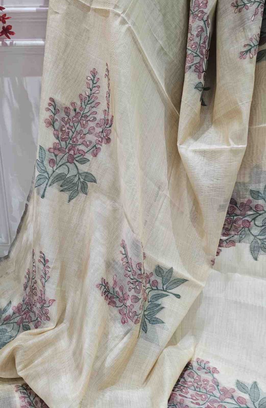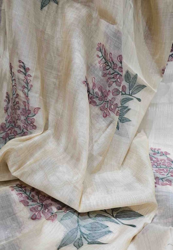Floral Art Muga Jamdani Saree - Off White with Red Blossom