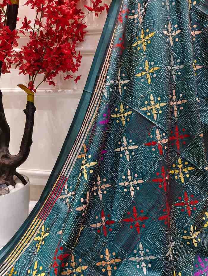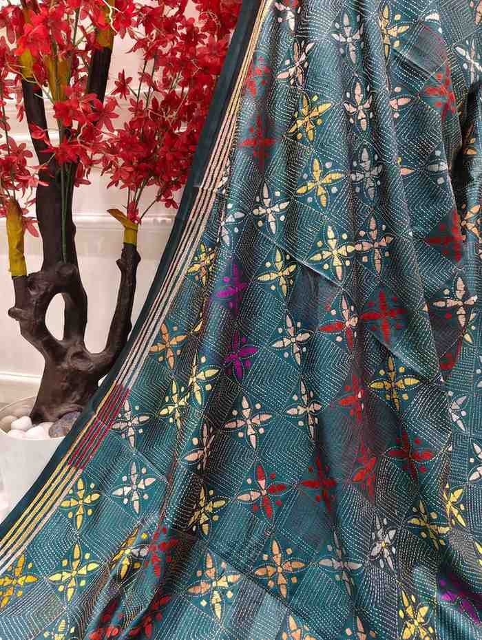 Celebrate timeless craftsmanship with this exquisite Kantha saree, a traditional form of folk embroidery from West Bengal, India. Each saree is a piece of wearable art, hand-stitched using a running stitch technique that has been passed down for generations.