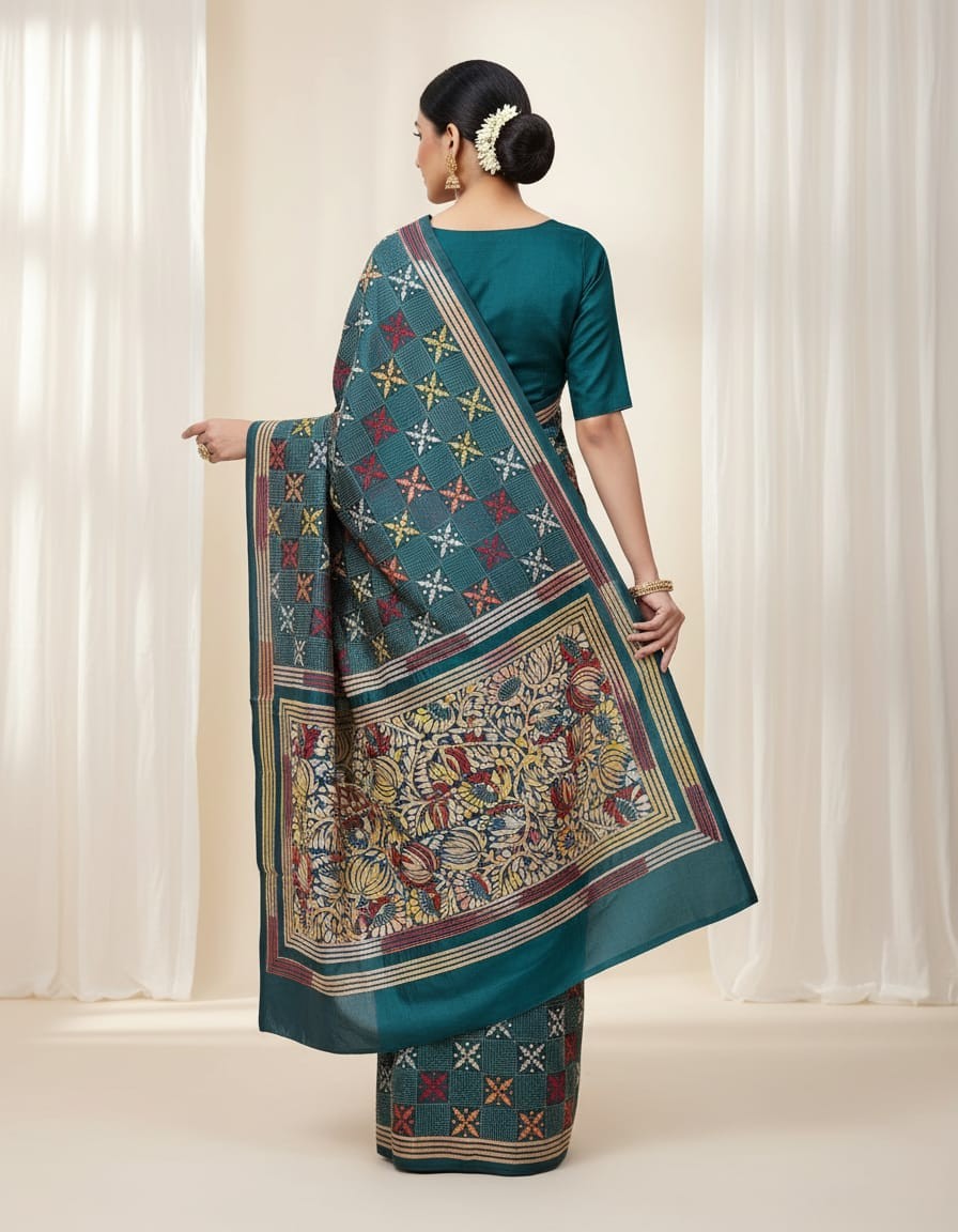 Floral Grid on Teal Bangalore Silk Kantha Saree