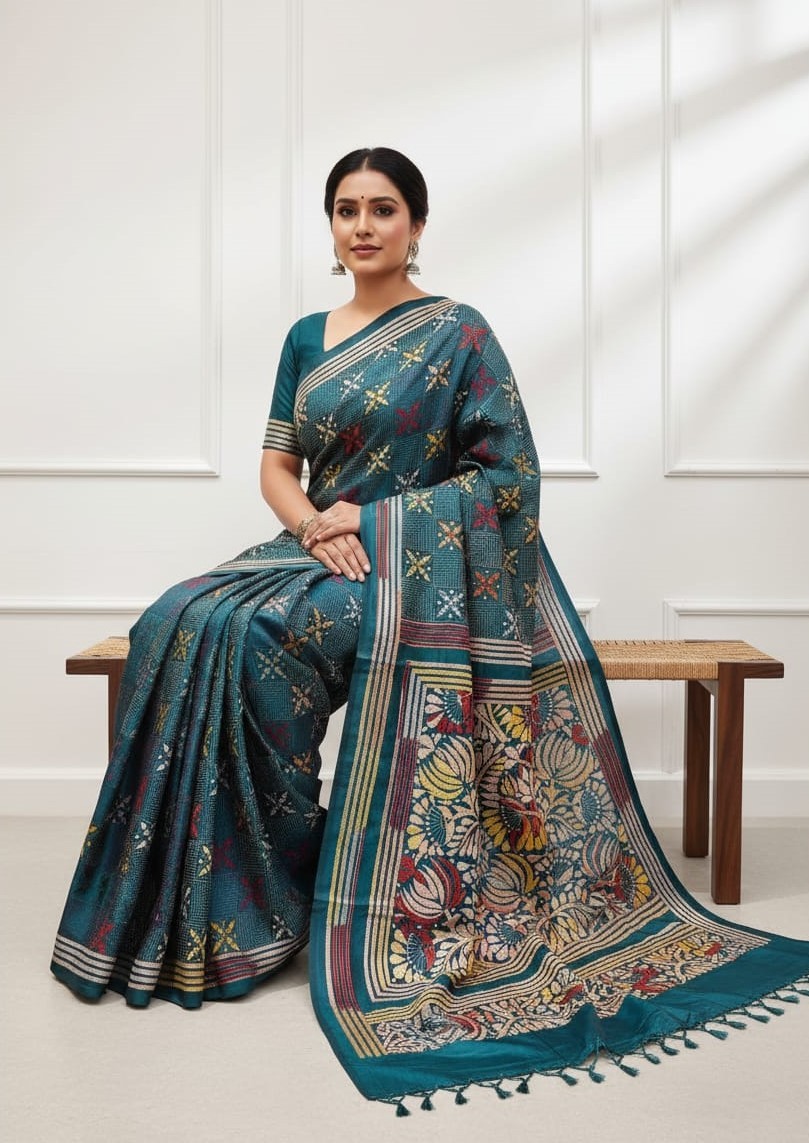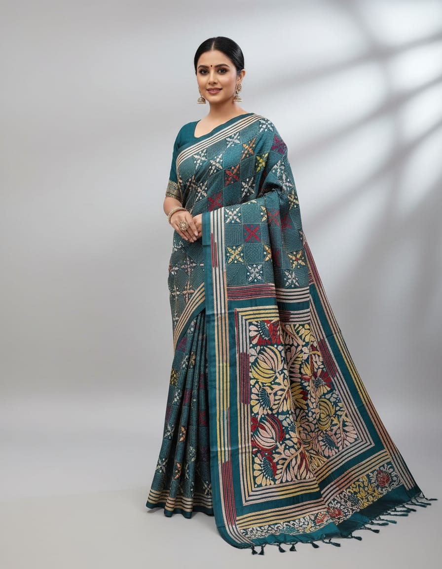 Celebrate timeless craftsmanship with this exquisite Kantha saree, a traditional form of folk embroidery from West Bengal, India. Each saree is a piece of wearable art, hand-stitched using a running stitch technique that has been passed down for generations.