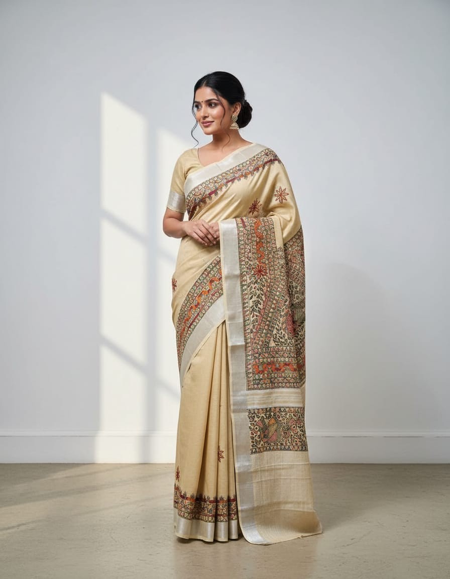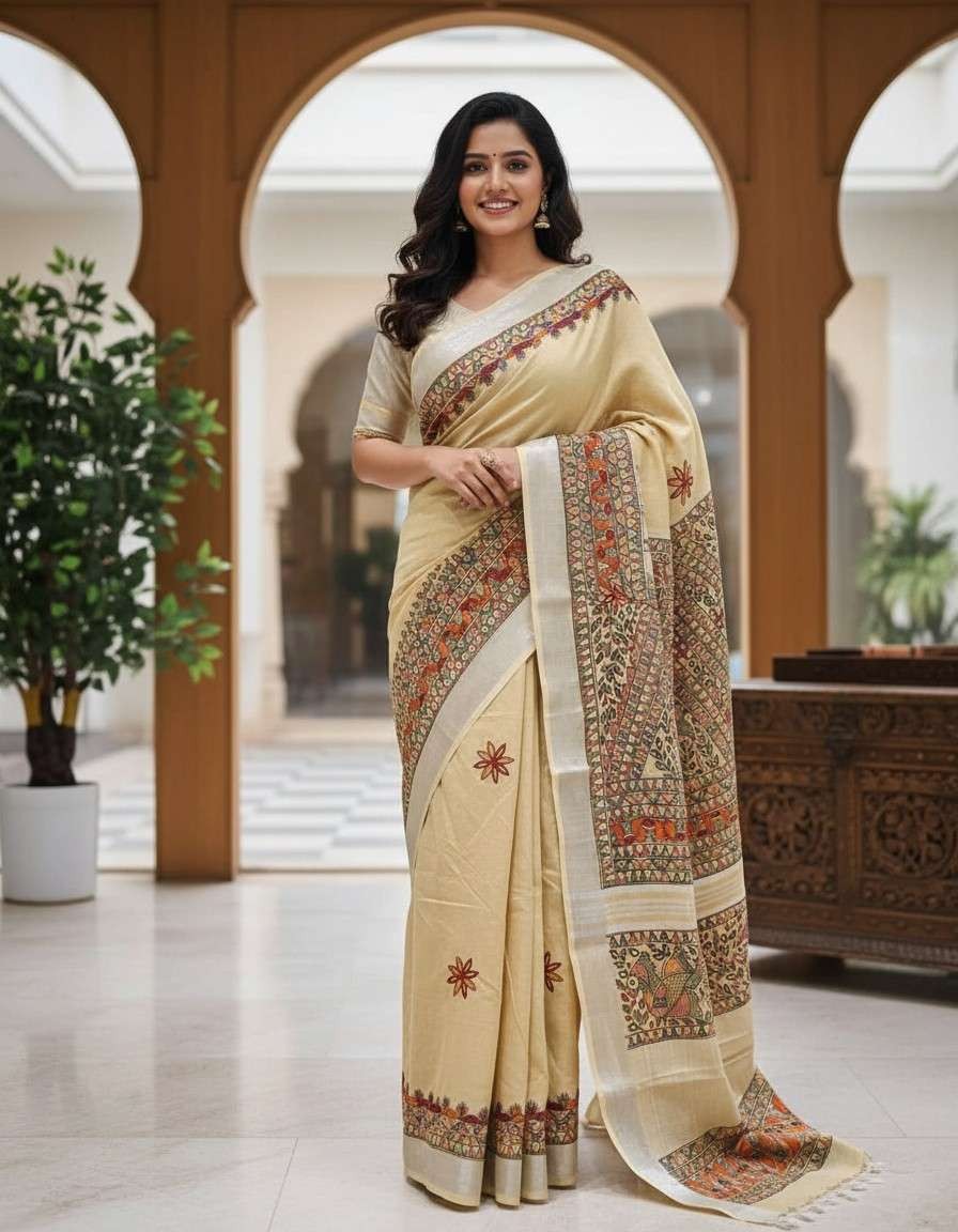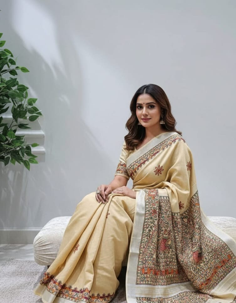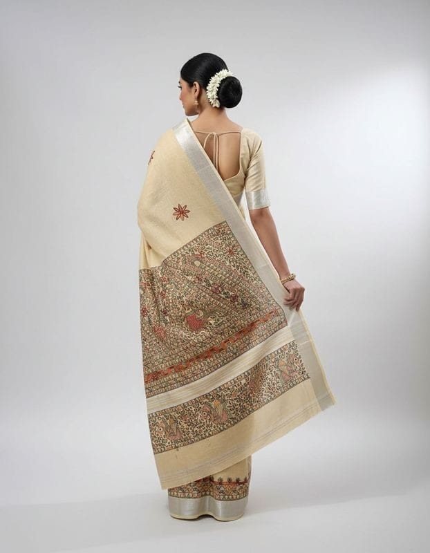 Floral Motif Cream Hand painted Madhubani Blend Saree