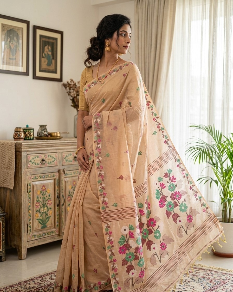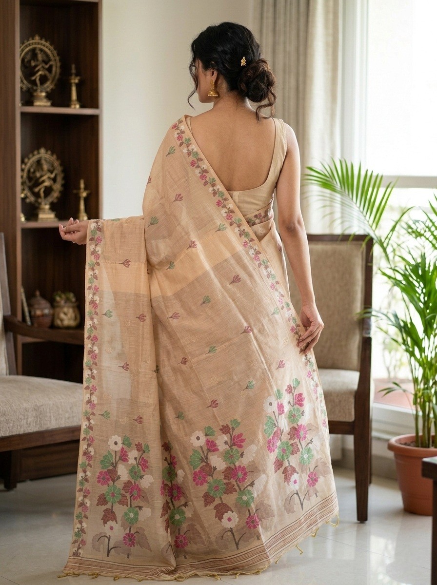 Floral Weave Muga Jamdani Saree - Cream