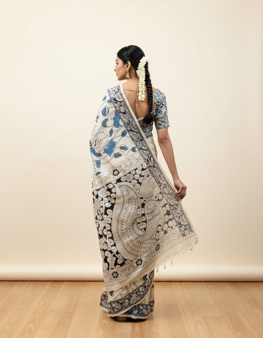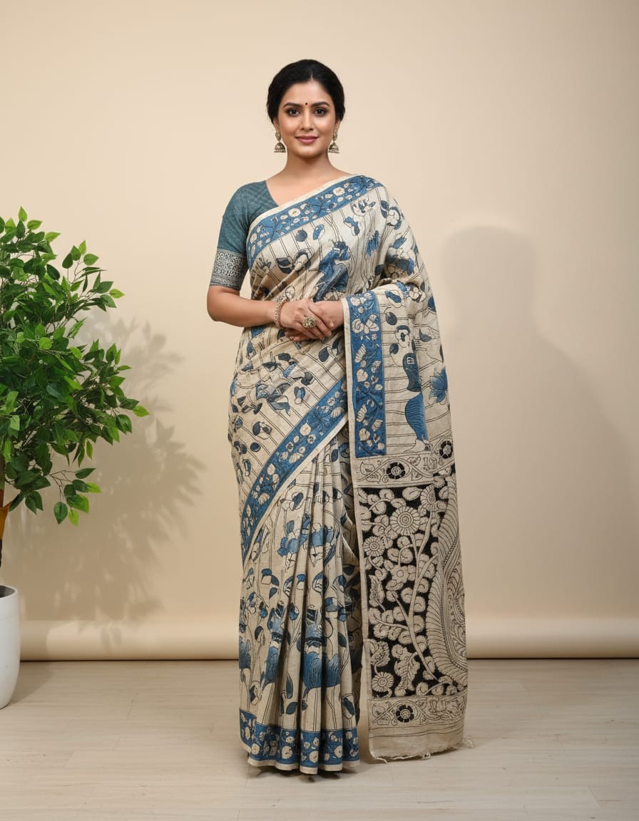 • Kalamkari sarees are sun-dried in open agricultural fields, which may result in minor dust marks — a testament to their authenticity. We recommend washing before first use.