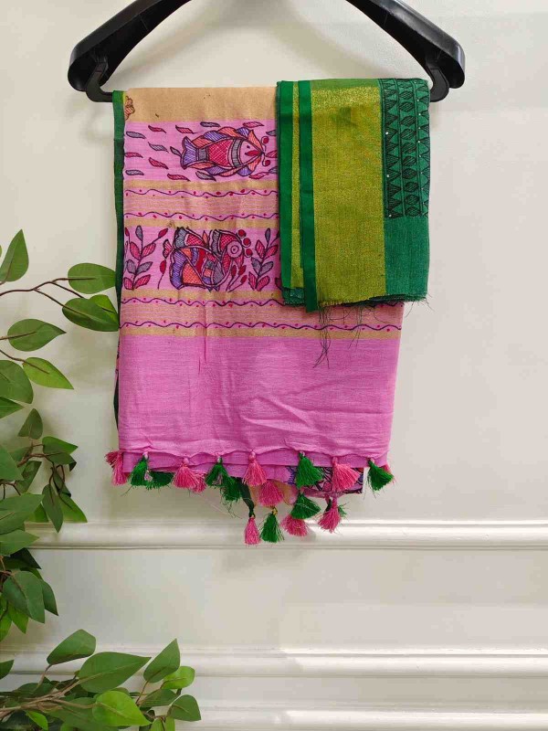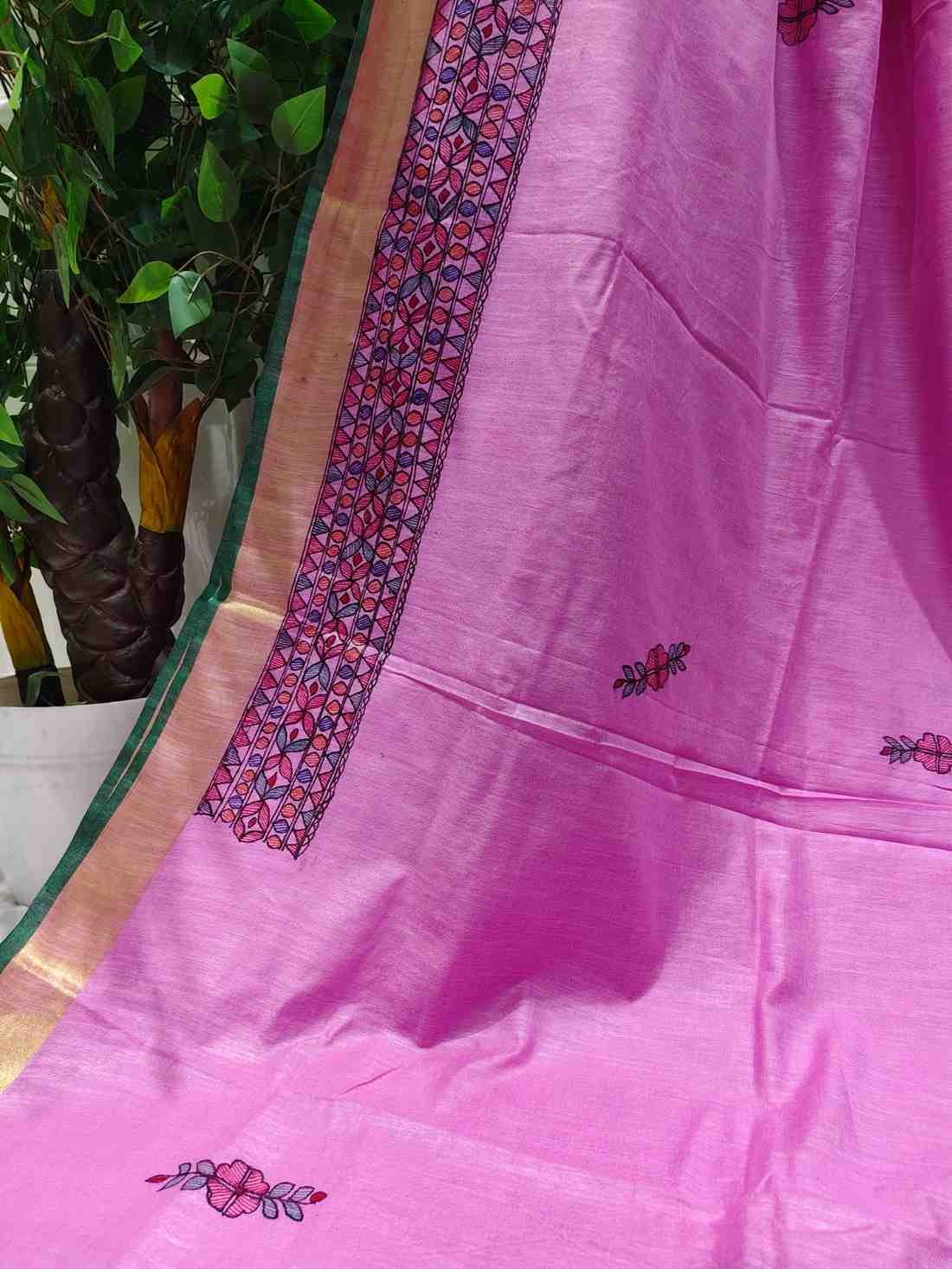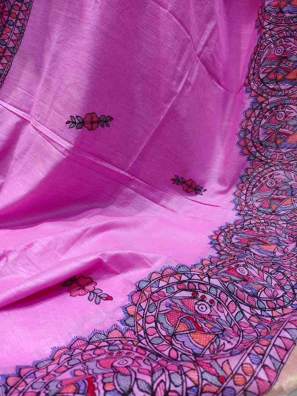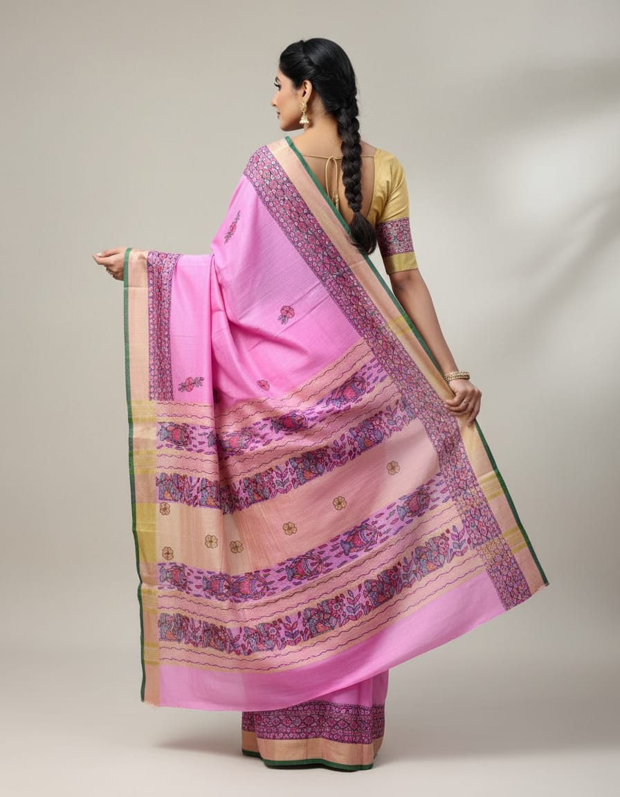 Gulabi Chakra Morni -Hand painted Madhubani Blend Saree