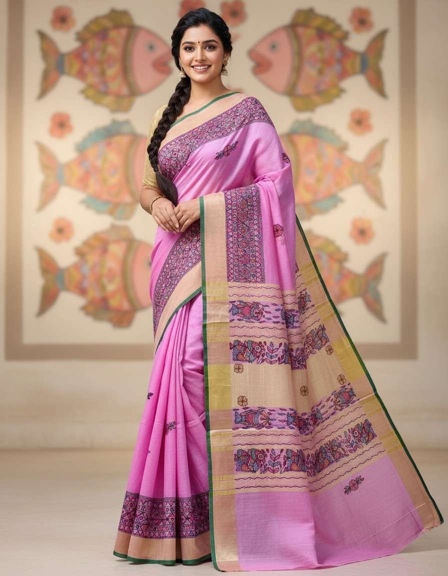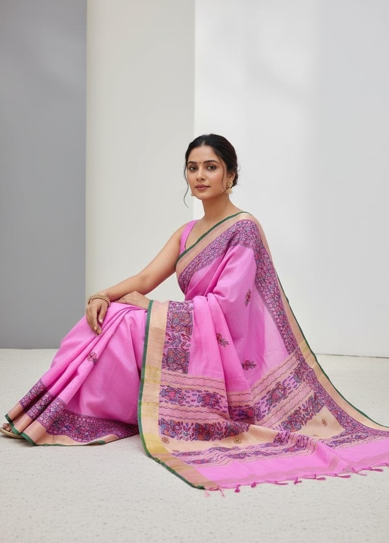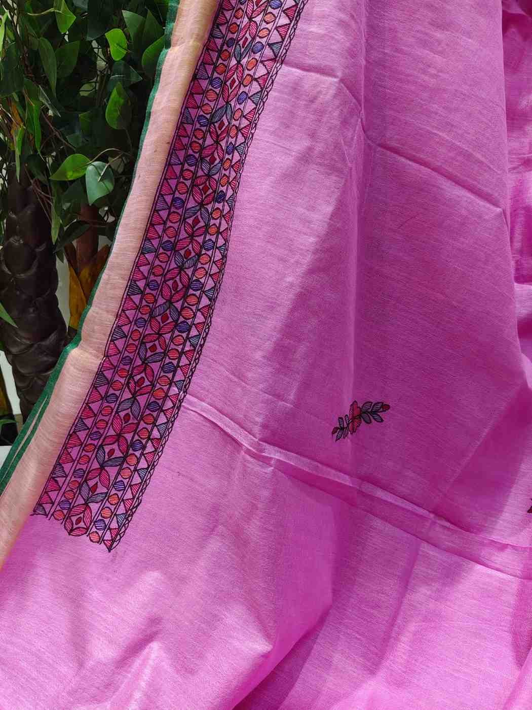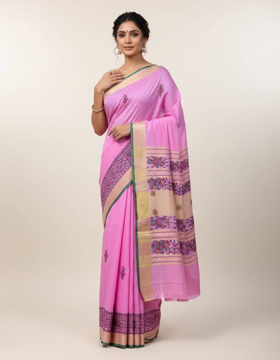 Gulabi Chakra Morni -Hand painted Madhubani Blend Saree