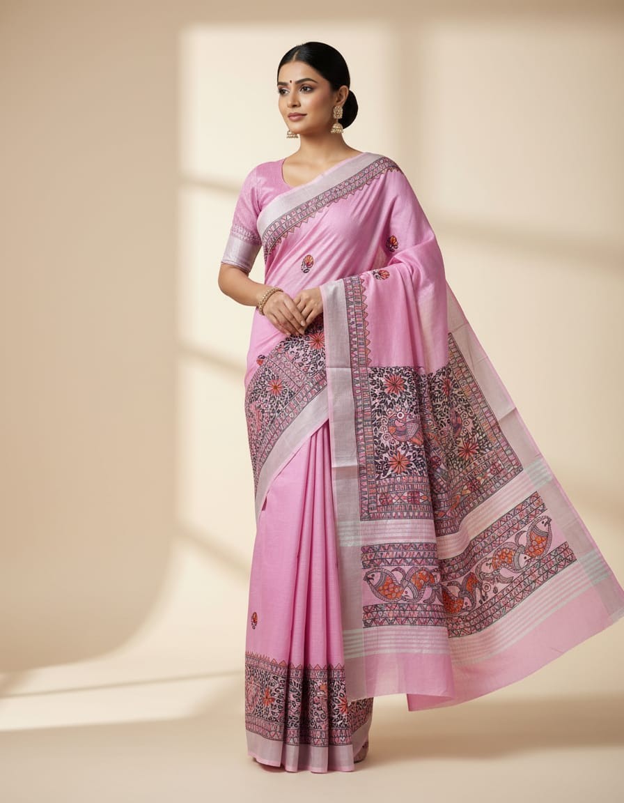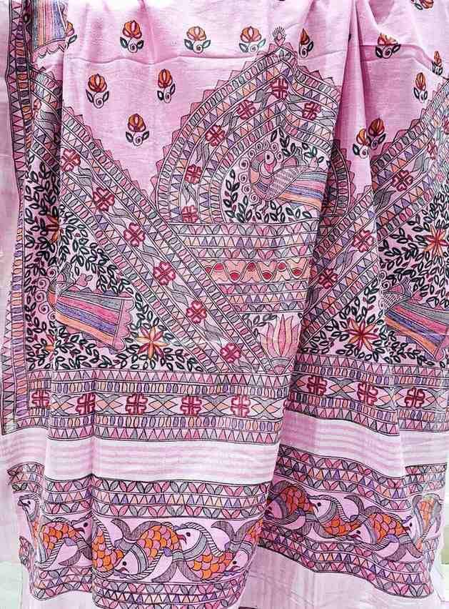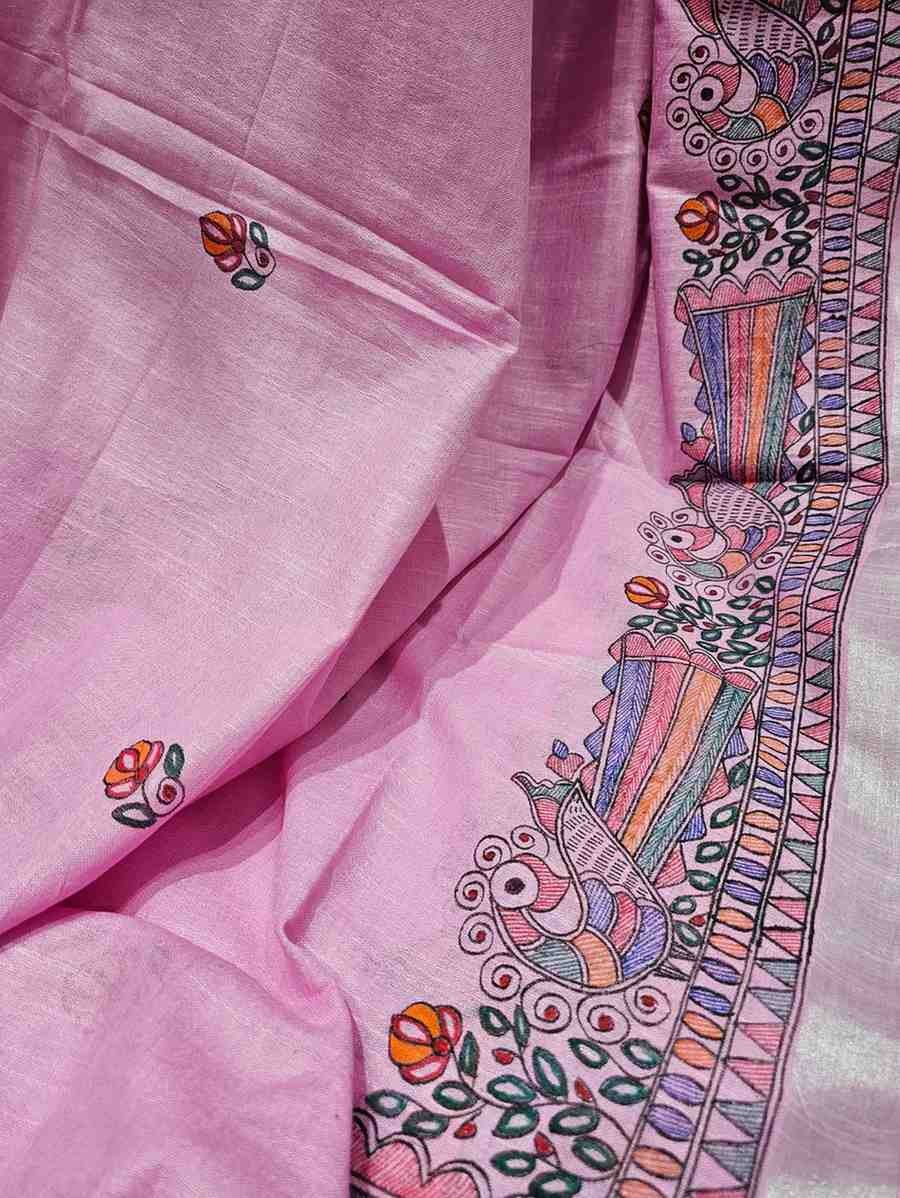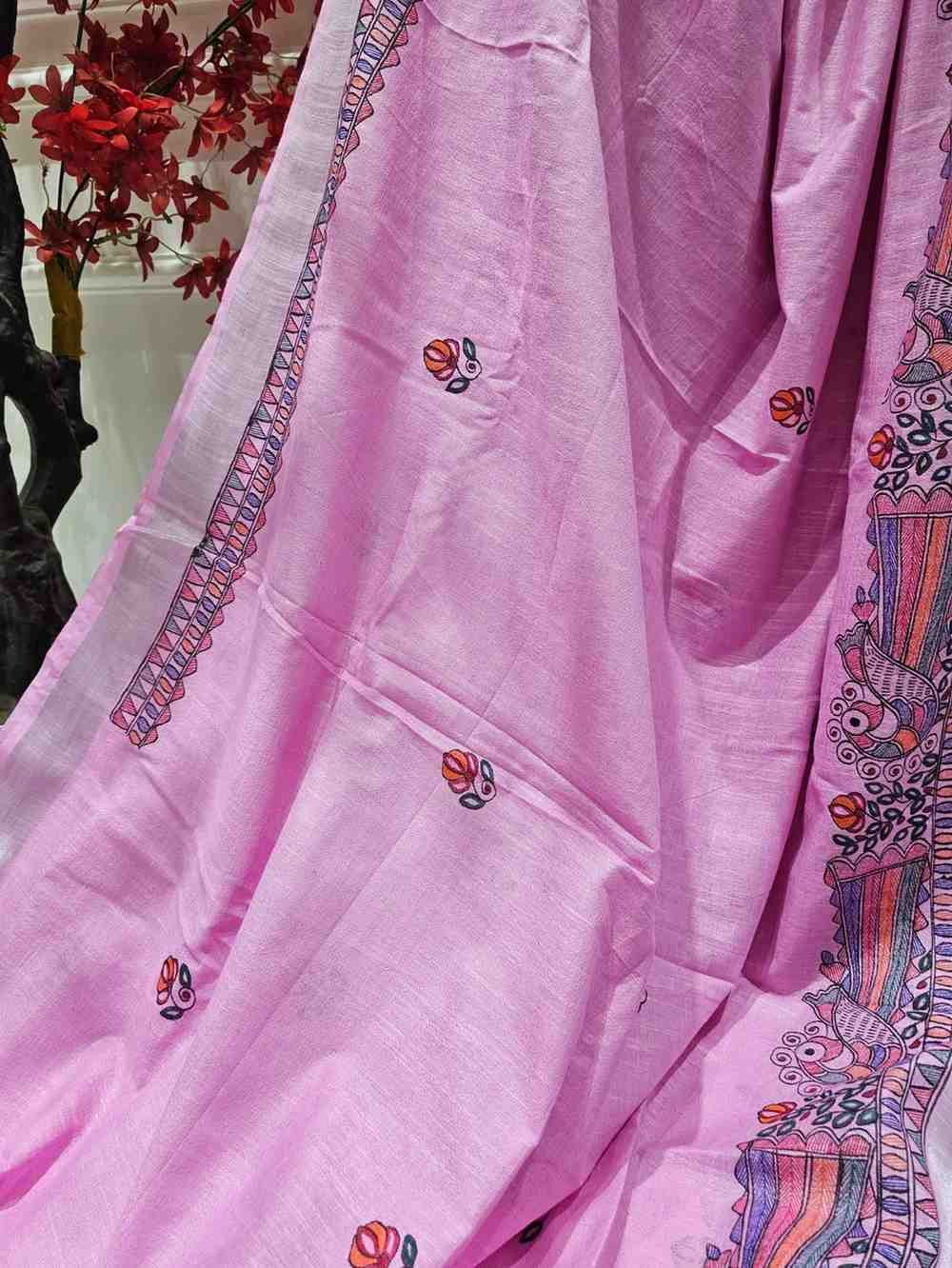 Gulabi Mayuri Hand painted Madhubani Blend Saree