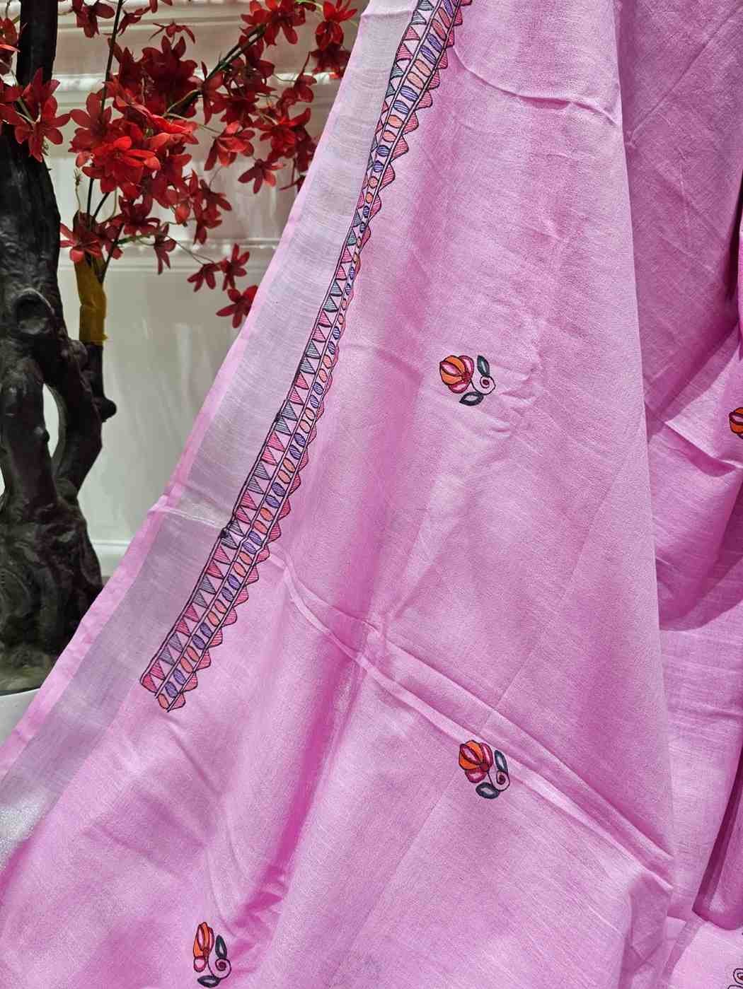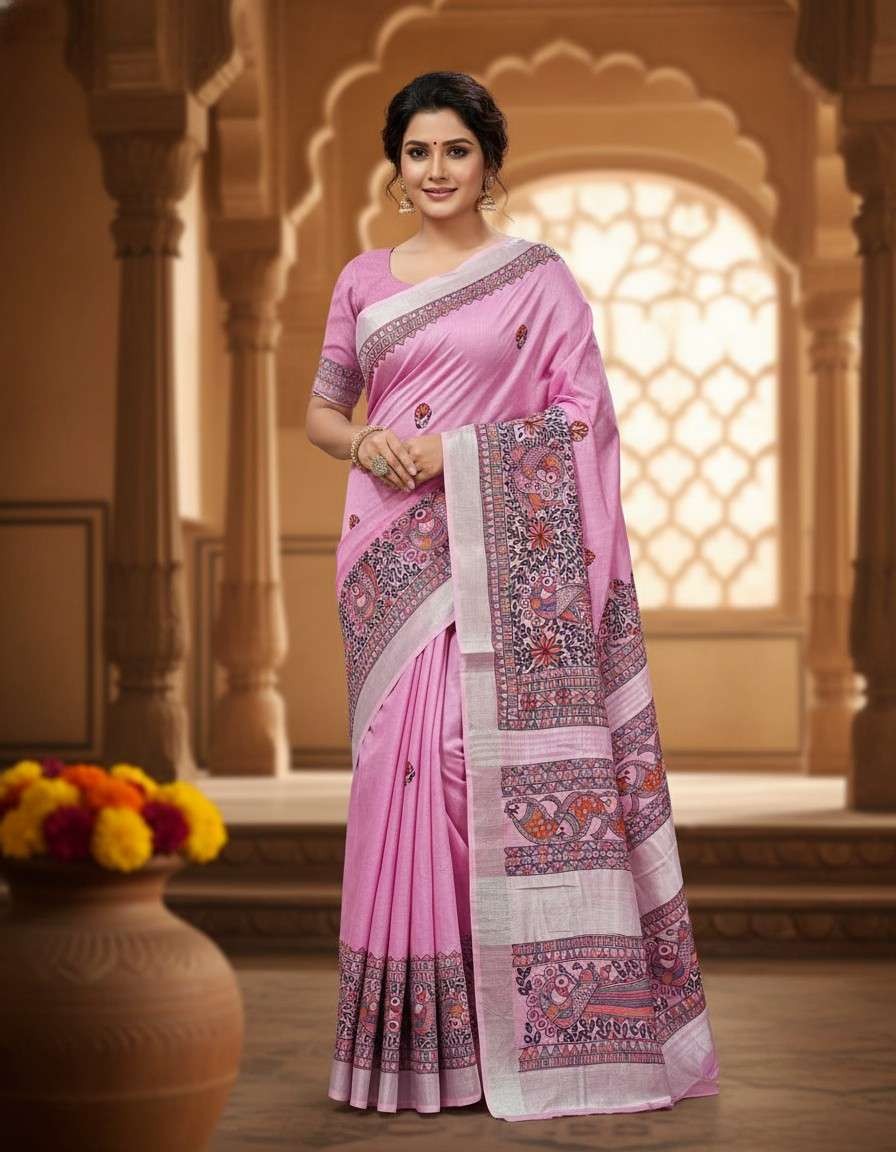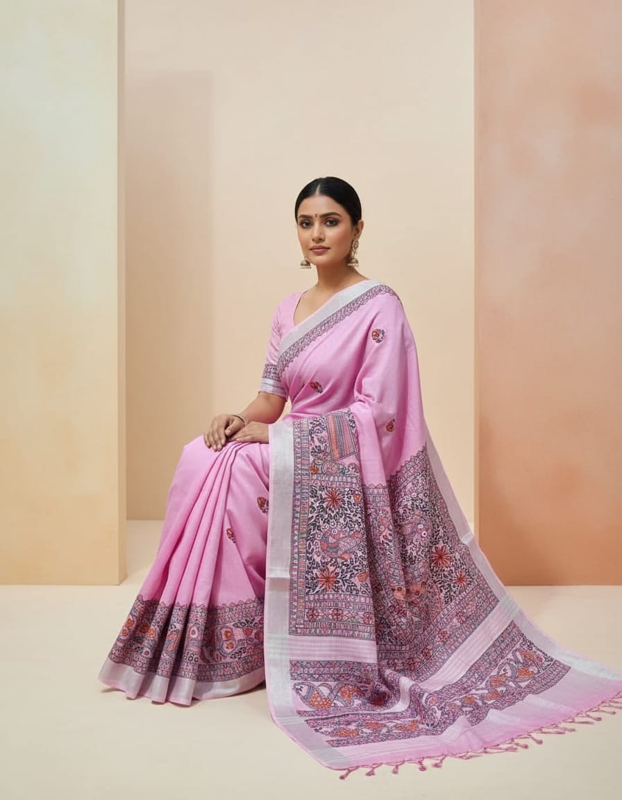 Gulabi Mayuri Hand painted Madhubani Blend Saree