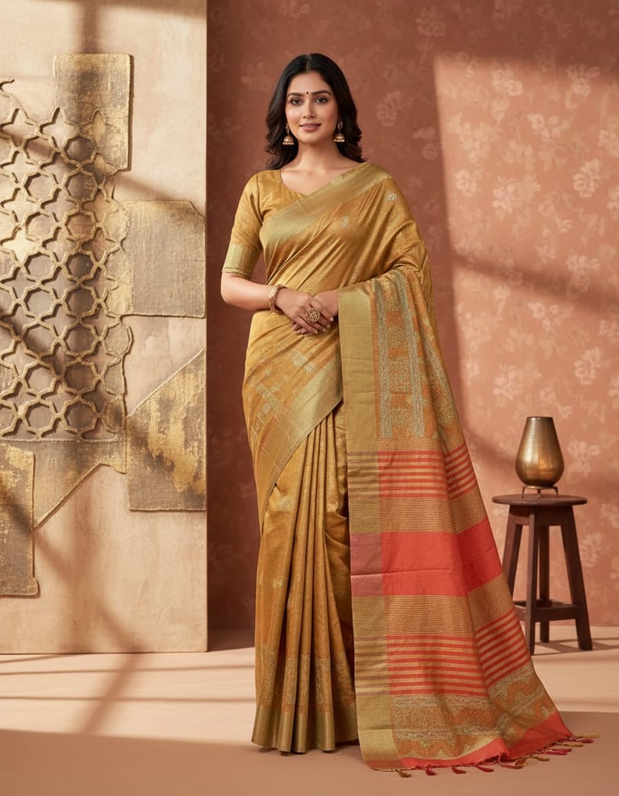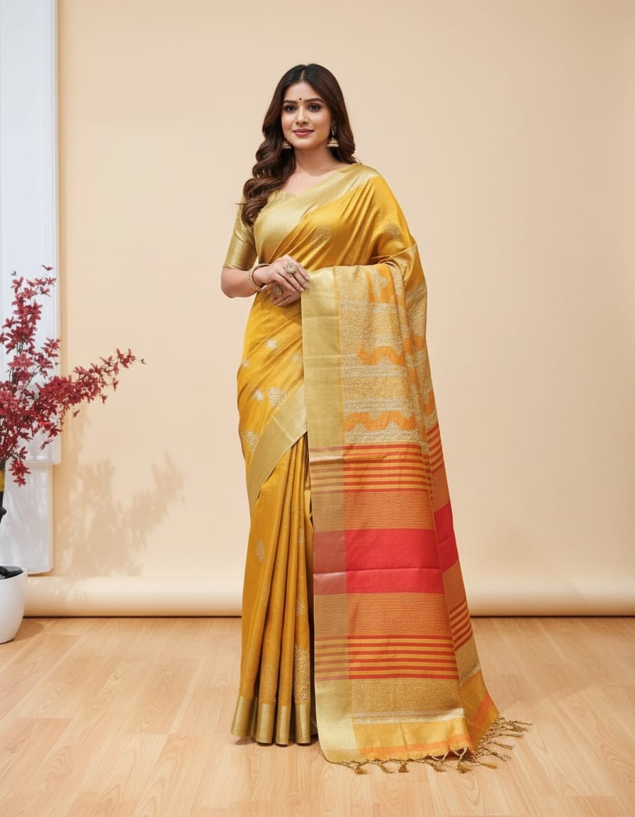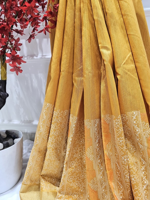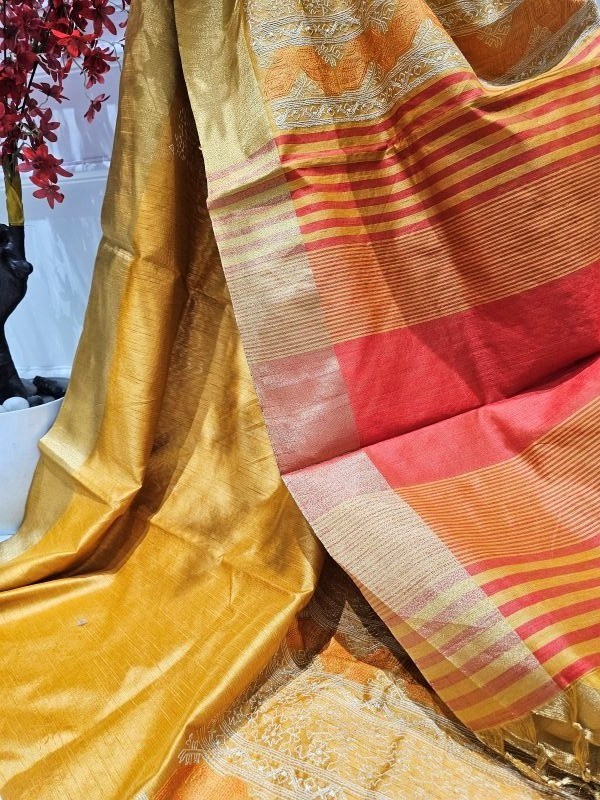 Brighten up your collection with the Hand Stitched Assam Silk Saree in a vibrant Marigold hue. Crafted from the finest Assam silk, this saree showcases the exquisite richness of traditional weaving, enhanced by the intricate hand-stitching that adds a unique touch of craftsmanship. The stunning marigold color exudes warmth and elegance, making it a perfect choice for weddings, cultural events, or festive celebrations. This saree blends timeless beauty with a modern appeal, ensuring you radiate grace and charm on any special occasion.