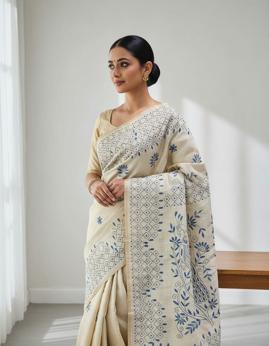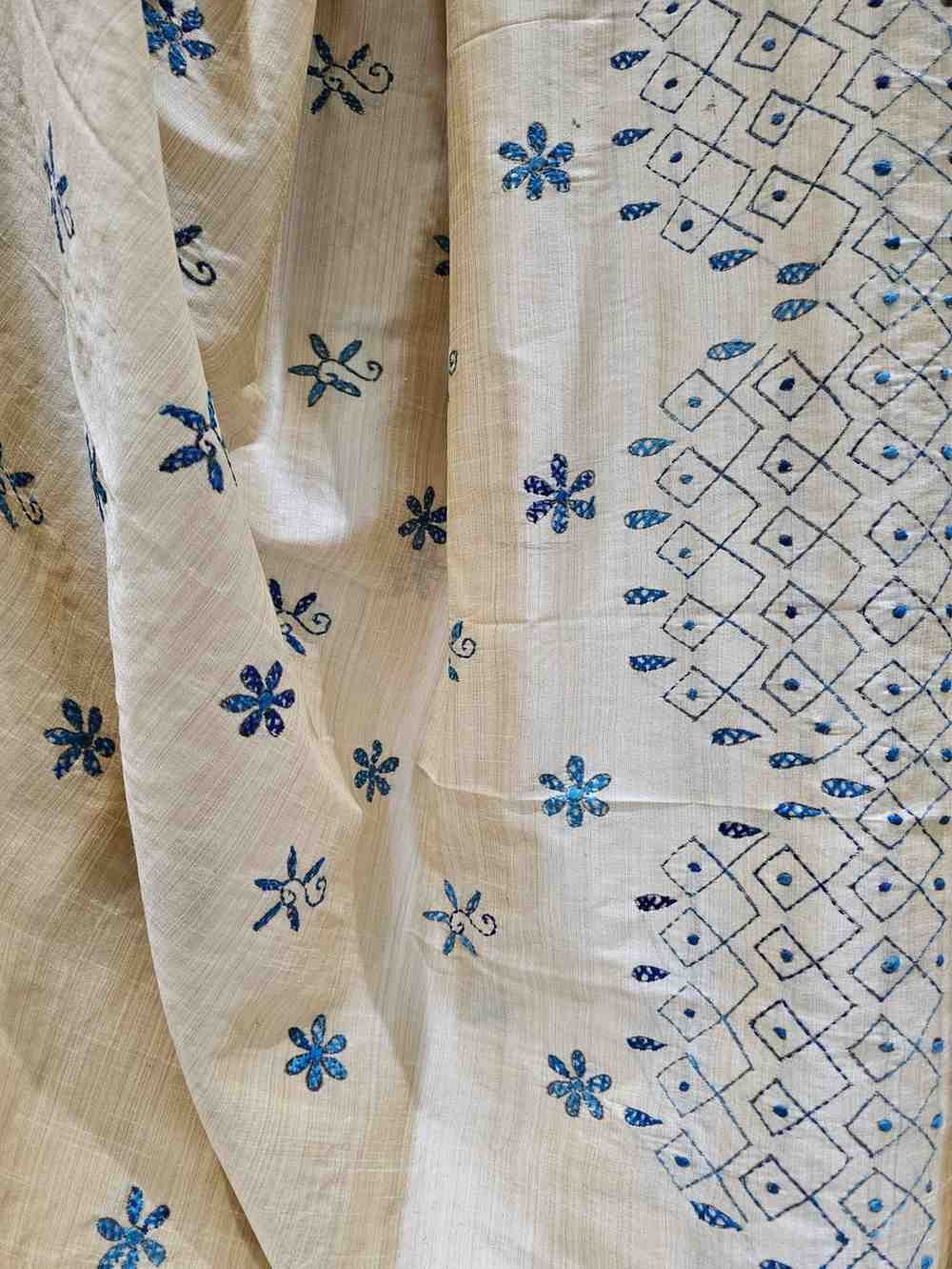 Celebrate the beauty of tradition with a modern twist in the Hand Stitched Fragmented Kadhwa Kantha Saree - Blue Peacock. This saree features the intricate Kadhwa Kantha embroidery, where delicate hand stitches create a stunning tapestry of patterns. The blue base is adorned with peacock motifs, symbolizing grace, beauty, and vibrant energy. The fragmented design of the embroidery adds a contemporary flair, offering a fusion of traditional art and modern design sensibilities. Whether worn for a wedding, cultural event, or formal gathering, this saree makes a striking statement with its intricate craftsmanship and bold colors.