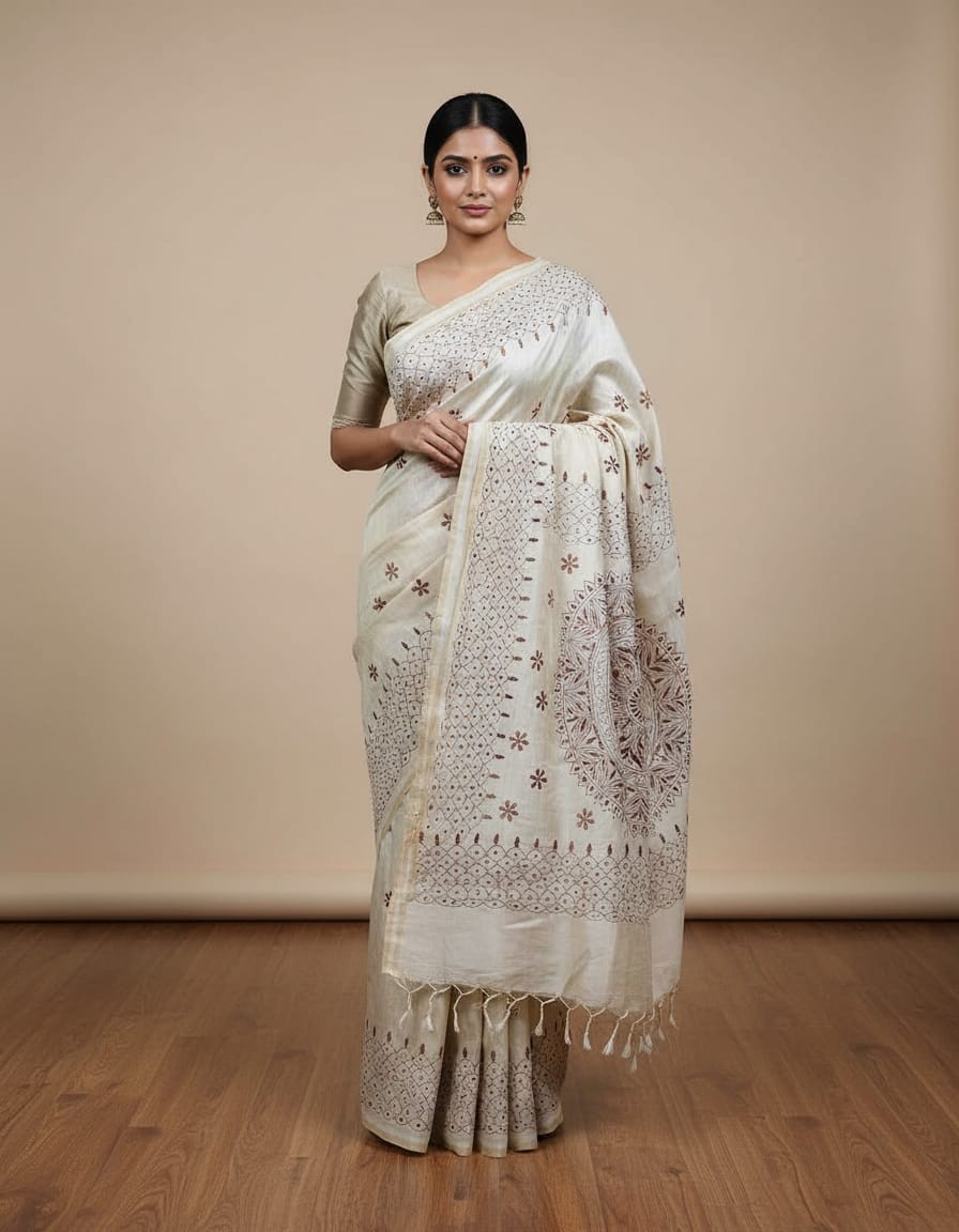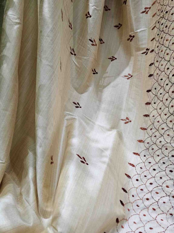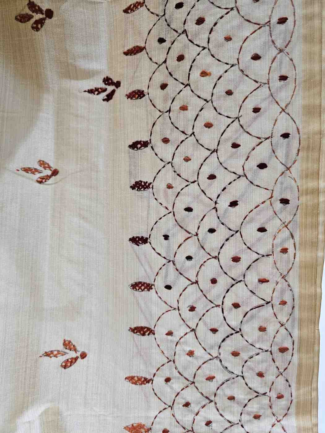 Embrace timeless elegance with the Hand Stitched Fragmented Kadhwa Kantha Saree - Brown. The luxurious Kadhwa Kantha embroidery is intricately hand-stitched into the rich brown fabric, offering a beautiful contrast of textures and colors. The fragmented design gives the saree a contemporary edge while maintaining the authenticity of traditional craftsmanship. The warm, earthy tones of the brown base are complemented by the meticulous embroidery, making it a versatile piece that can be worn for weddings, festive celebrations, or cultural events. This saree is a perfect choice for those who appreciate the fusion of traditional techniques with modern design.